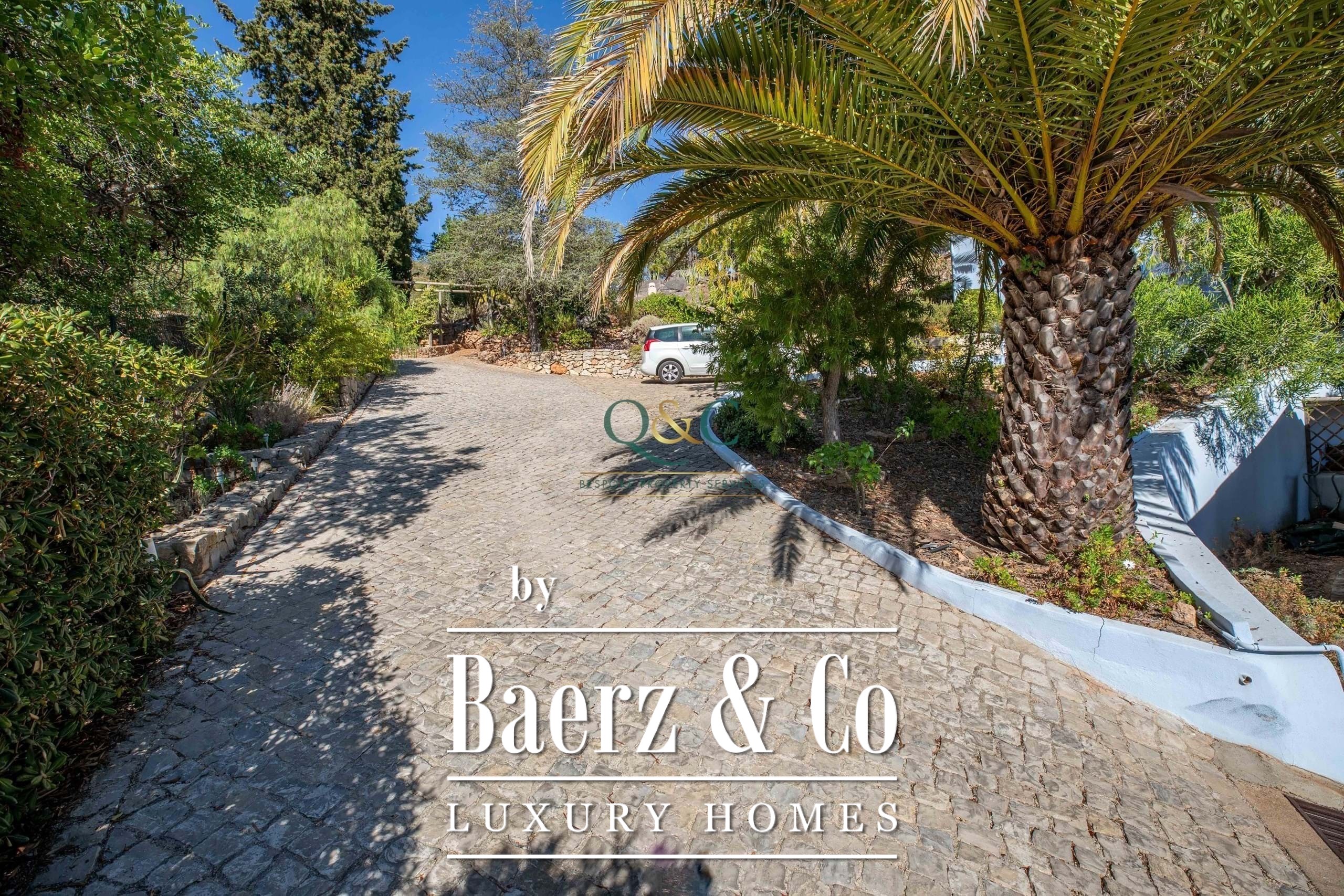 Set within a fully fenced plot, electric gates open to a sweeping calcada driveway leading to a garage, carport, and ample parking. The beautifully landscaped gardens feature mature trees and a well-chosen selection of drought-tolerant plants, creating a lush yet low-maintenance haven.