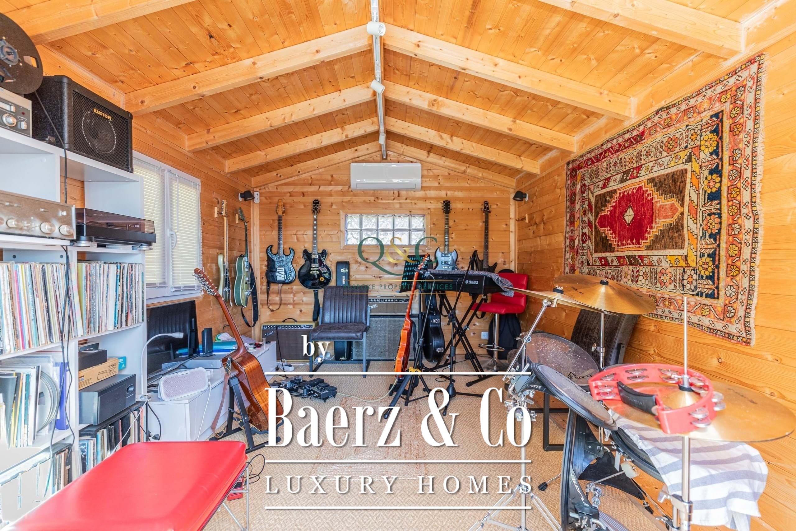 A useful utility room is conveniently located near the entrance, while a standalone, fully insulated wooden studio complete with air conditioning and currently used as a music room offers endless possibilities for work, hobbies, or relaxation.