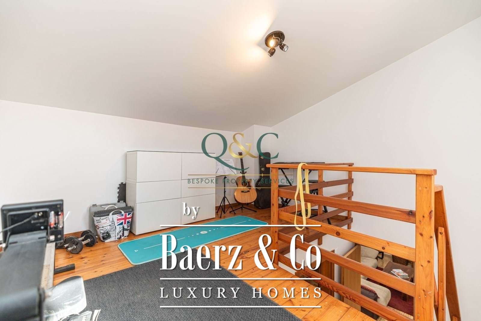 A cosy inner sitting room with high ceilings and a wood-burning stove creates a warm and inviting heart to the home. From here, a good-sized single bedroom with en-suite also benefits from a mezzanine level and access to a covered roof terraceideal for a home office or reading nook. A small inner hallway leads to two further double bedrooms, both featuring en-suite bathrooms and direct access to the front garden.