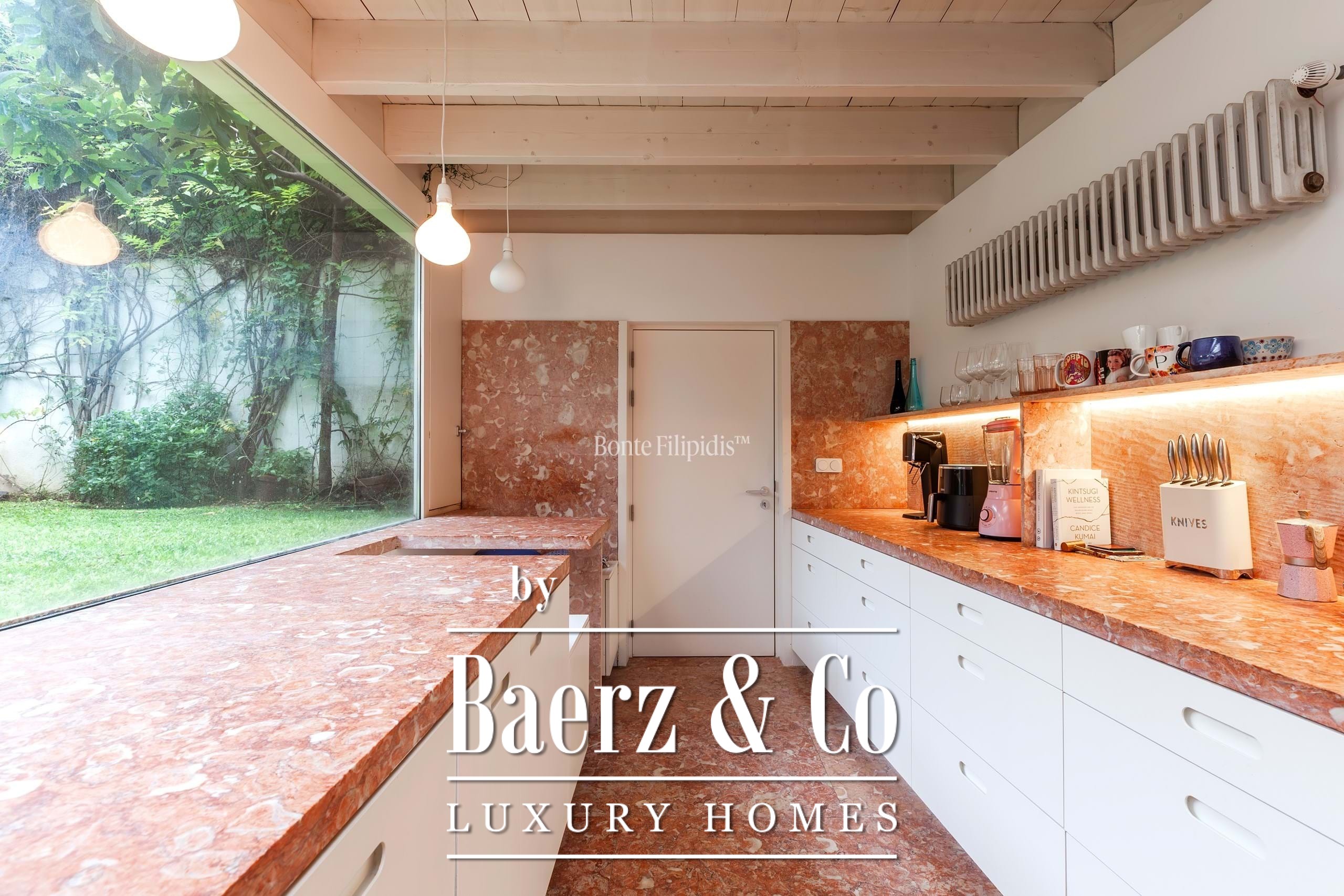 The primary living spaces are marked by original stone flooring and softly vintage accents, with large panoramic windows drawing natural light into the open-plan social area. Here, living and dining zones flow seamlessly out to an 80 m² private garden, a tranquil retreat bordered by mature greenery for quiet moments or reserved gatherings. Subtle material choices and precise detailing lend an understated sophistication to every space.