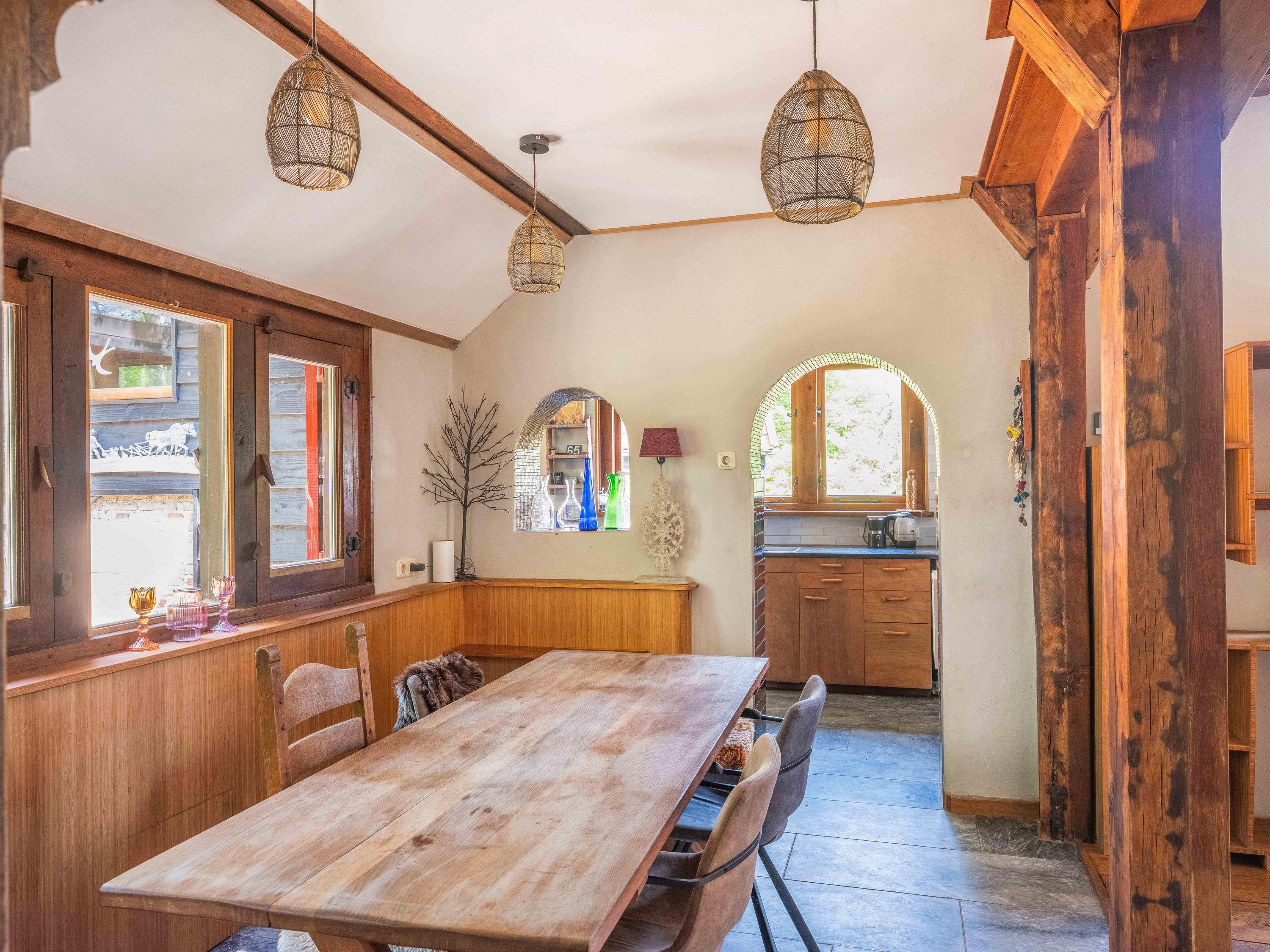 A long forest path leads you to this striking property, built in 1935 using 17th-century materials and designed by architect Royaards. The house exudes character and history: robust fireplaces – currently not functional but eligible for renovation – antique elements such as solid oak beams and floors, and clay-plastered walls that create a pleasant indoor climate and promote restful sleep. Here, you experience the luxury of silence, space, and privacy, surrounded by the scent of the forest, the gentle rustling of trees, and the songs of countless birds – this is truly a bird lover’s paradise.