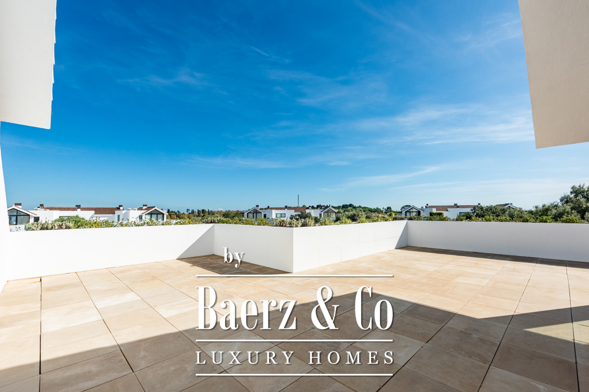 The main floor presents three bedroom suites, each benefitting from considered orientation and quiet outlooks, while the living and dining areas connect seamlessly to a fully fitted kitchen and utility room. The staircase rises to a master suite of presence and calm, framed by panoramic and partial sea views from its private terrace. Marble floors, underfloor heating, a smart home system, and double glazing offer comfort and control throughout.