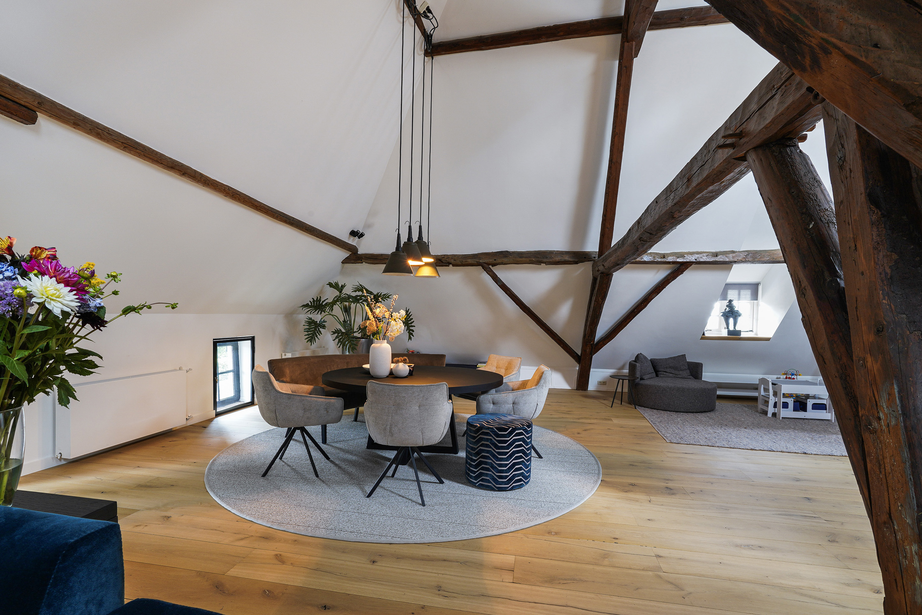 The living room, measuring nearly 90 m², feels even more spacious thanks to the high vaulted ceiling. The roof is insulated and beautifully finished with white plaster between the sturdy wooden beams. Combined with the height differences, the wooden floor and the pellet stove, the result is a living area that feels both grand and inviting.
