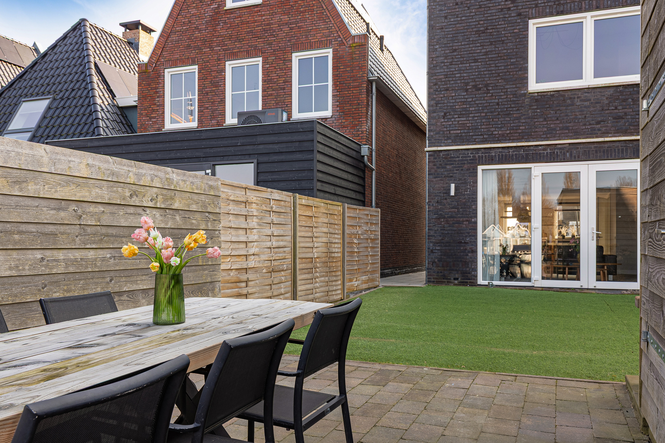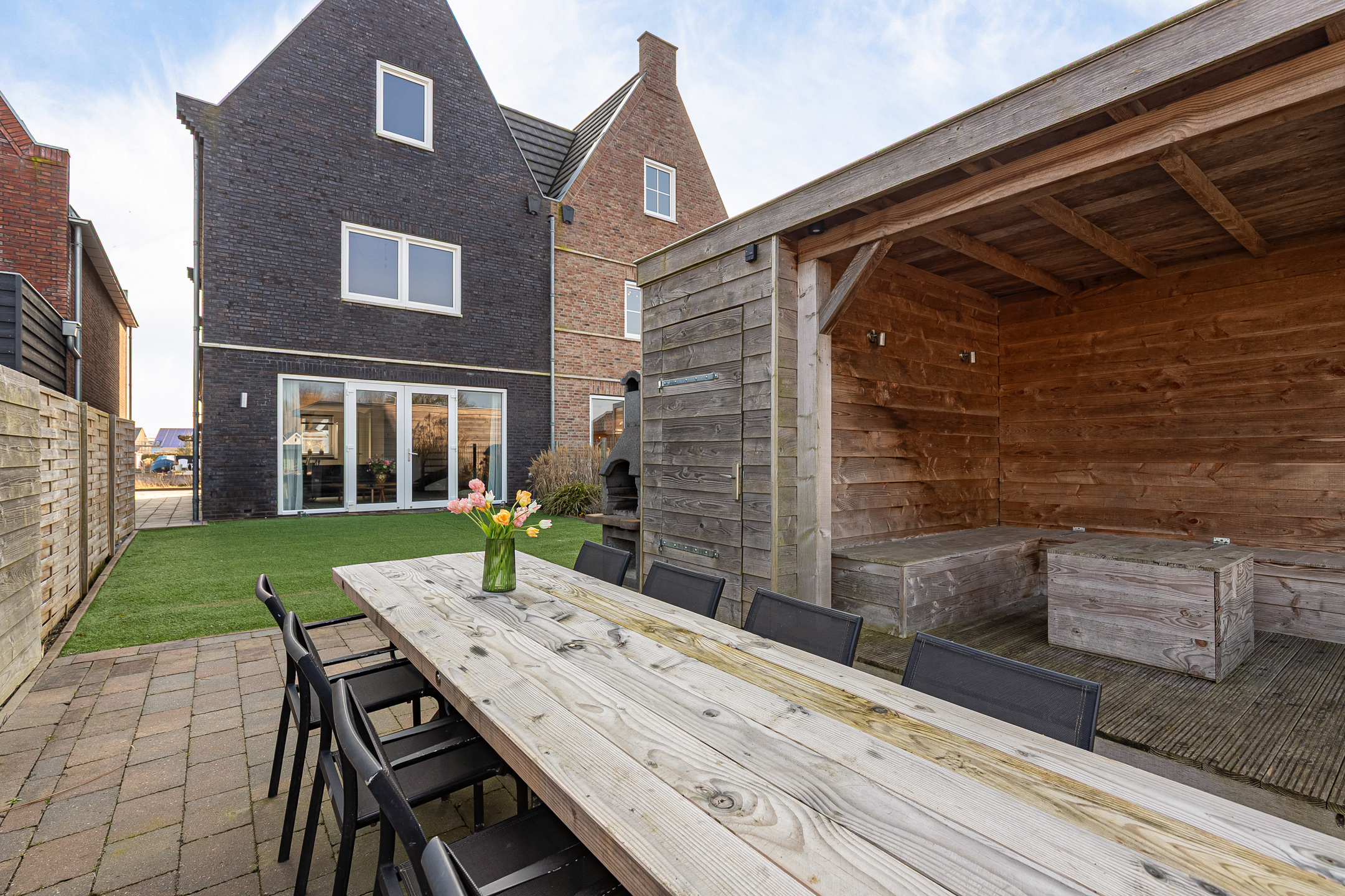 De achtertuin met verzorgde borders ligt op het noordwesten en grenst direct aan het water. Hier vindt u een beschut terras waar u heerlijk kunt tafelen en genieten van de rust, het uitzicht en de boten.
