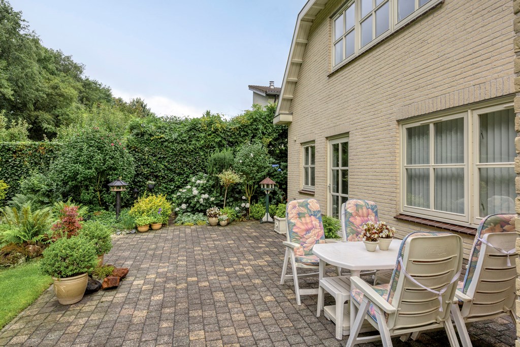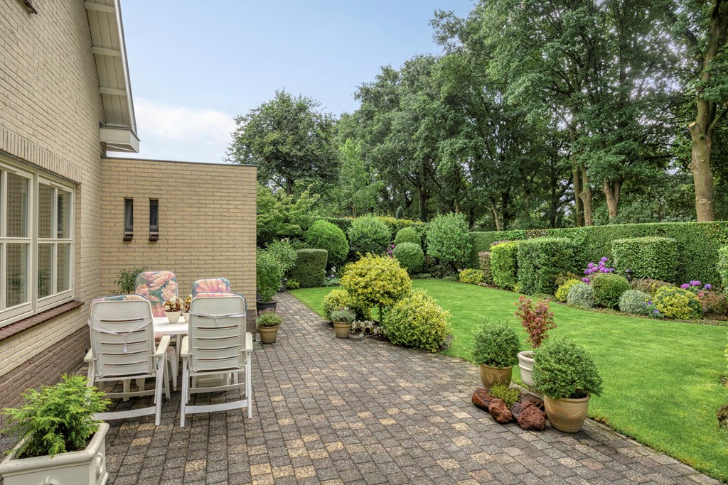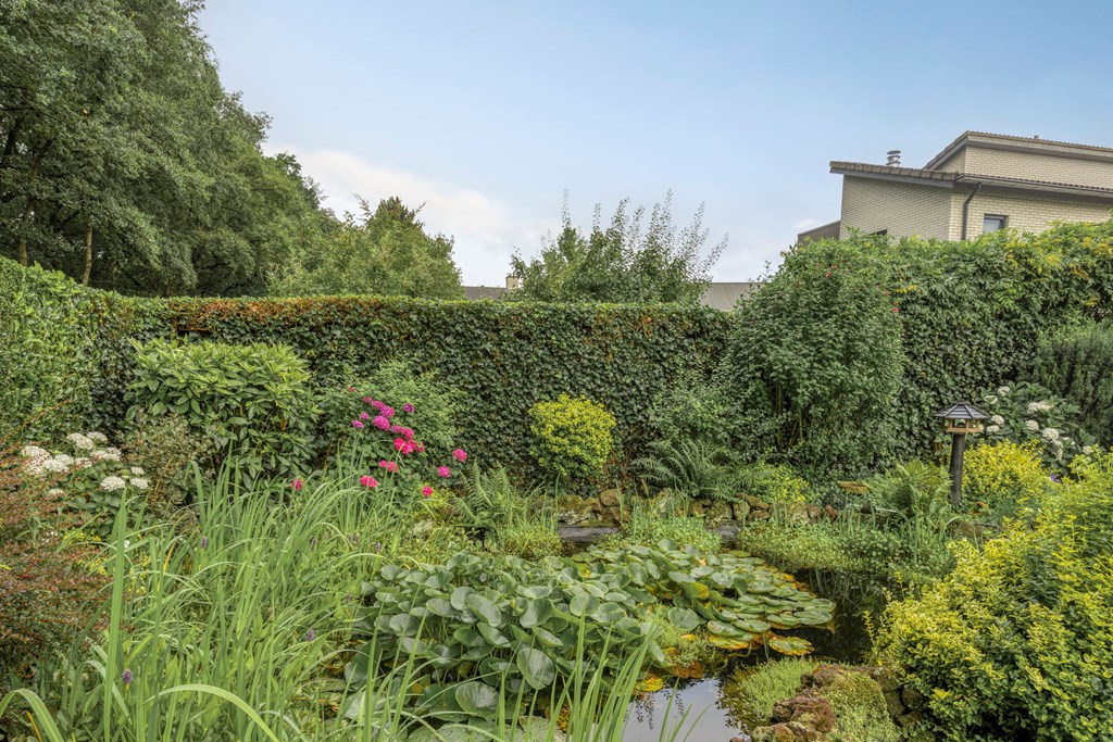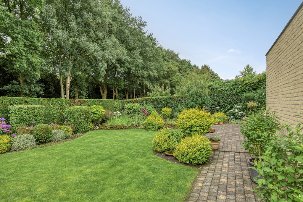The garden all around is immaculately maintained. At the front, the wide driveway offers parking for multiple cars; under the carport your car is sheltered. From here you also have direct access to the garage, with overhead door and side door—a particularly spacious and multifunctional area of no less than 57 m². Ideal for daily use, safely storing bicycles, carrying out DIY projects, or setting up a large work or hobby room with its own entrance. The rear garden is a delight: a large sun terrace with decorative paving, manicured lawn, a pond, and borders full of color and variety. Thanks to mature hedges, trees, and the woodland to the rear, you’ll enjoy peace and privacy. Whether you want to have breakfast outdoors, read under the tree, or host guests on a summer evening—you can do it all here. With direct access from the living room, utility room, and garage, the garden is also extremely practical in layout.