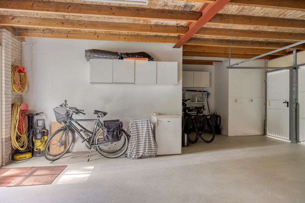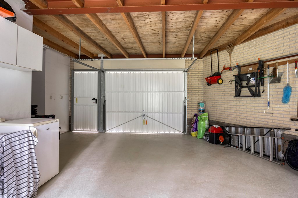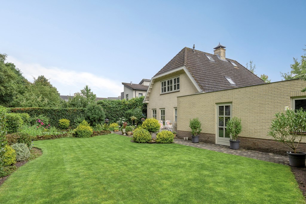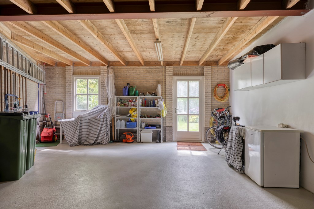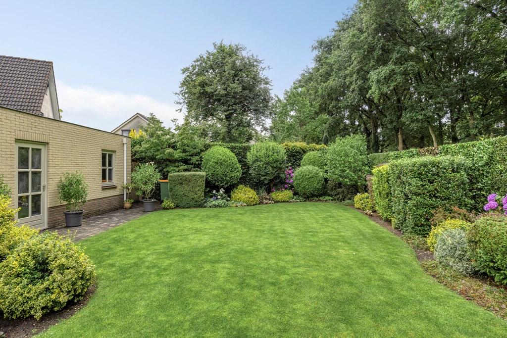 The garden all around is immaculately maintained. At the front, the wide driveway offers parking for multiple cars; under the carport your car is sheltered. From here you also have direct access to the garage, with overhead door and side door—a particularly spacious and multifunctional area of no less than 57 m². Ideal for daily use, safely storing bicycles, carrying out DIY projects, or setting up a large work or hobby room with its own entrance. The rear garden is a delight: a large sun terrace with decorative paving, manicured lawn, a pond, and borders full of color and variety. Thanks to mature hedges, trees, and the woodland to the rear, you’ll enjoy peace and privacy. Whether you want to have breakfast outdoors, read under the tree, or host guests on a summer evening—you can do it all here. With direct access from the living room, utility room, and garage, the garden is also extremely practical in layout.