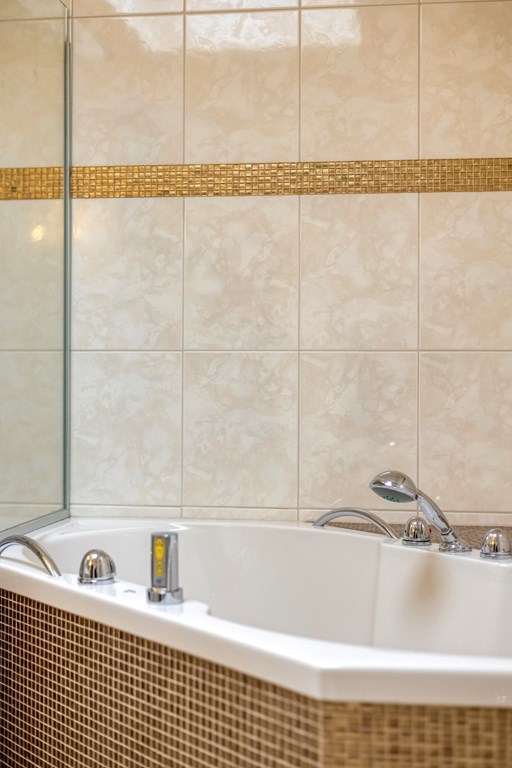The live-in kitchen is modern and fitted with luxury appliances such as a large gas stove, a canopy extractor, dishwasher, fridge and freezer, air conditioning and a Quooker tap. Here you cook with a view of the garden, while natural light beautifully glides across the kitchen’s golden fronts. The conservatory and back garden can also be accessed via the kitchen. Adjacent, you reach on one side the practical utility room with laundry connections, and on the other a very spacious bedroom with an equally spacious walk-in closet and an en-suite bathroom. Sliding doors connect the bedroom to the garden, and the garden can also be easily reached via the walk-in closet. The generous bathroom features light tiling and a skylight, a whirlpool bath, double vanity, walk-in shower, wall-hung toilet and plenty of storage space.