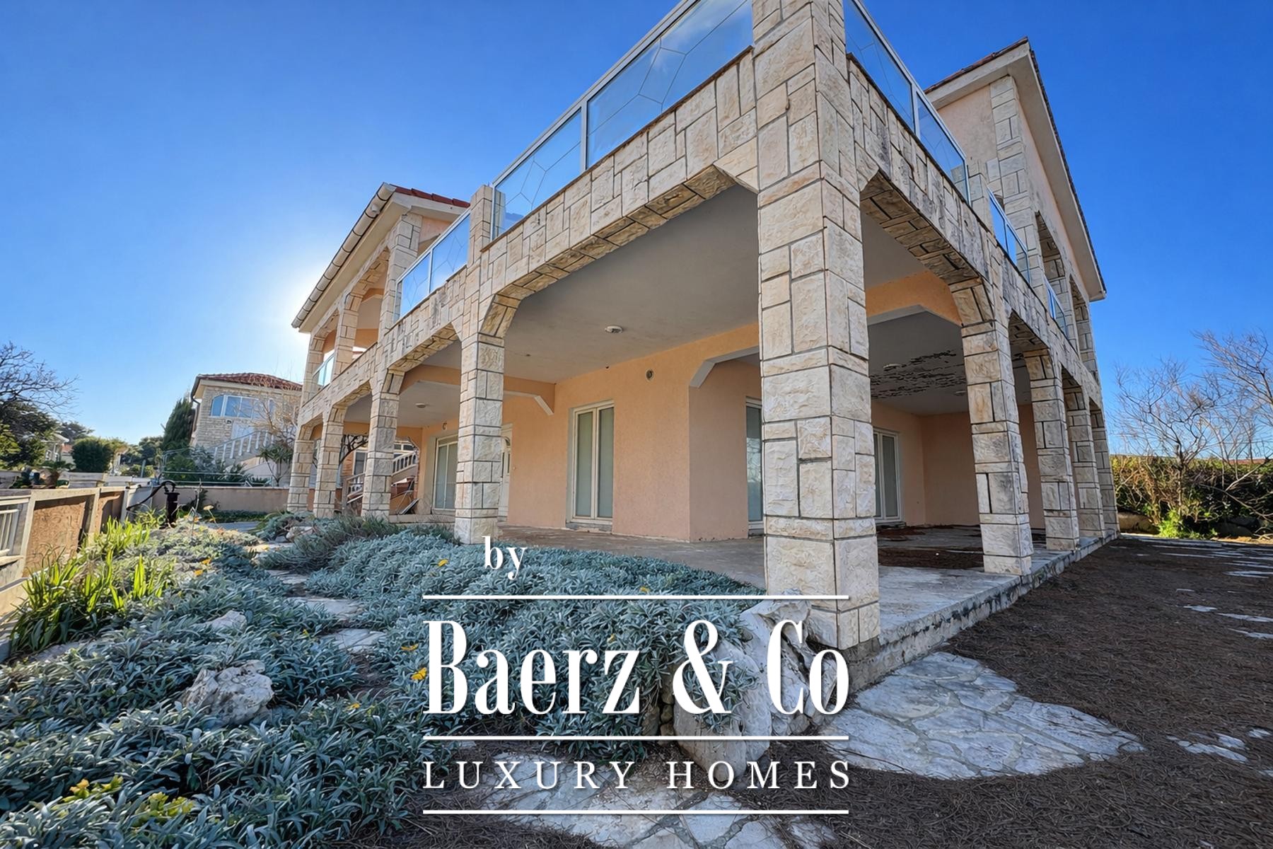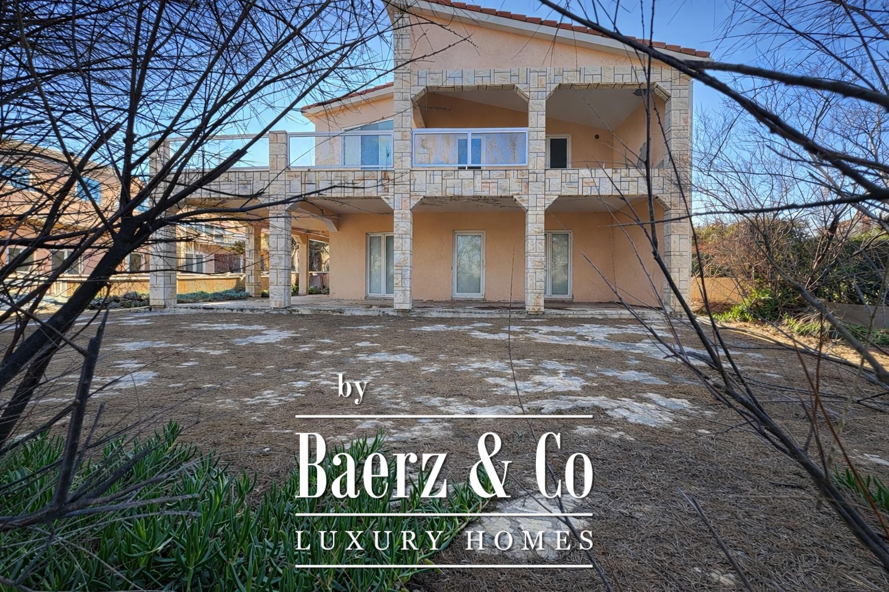 Built in 2006 and never lived in, the house awaits renovation, allowing for bespoke adaptation to individual taste and vision. The home rises over two floors: the ground level presents an open kitchen, dining and living area, bedroom, bathroom, terrace, and garage. The first floor opens to an additional kitchen, living and dining space, four bedrooms, two bathrooms, two separate toilets, and a terrace that commands unobstructed views of sea and sky.