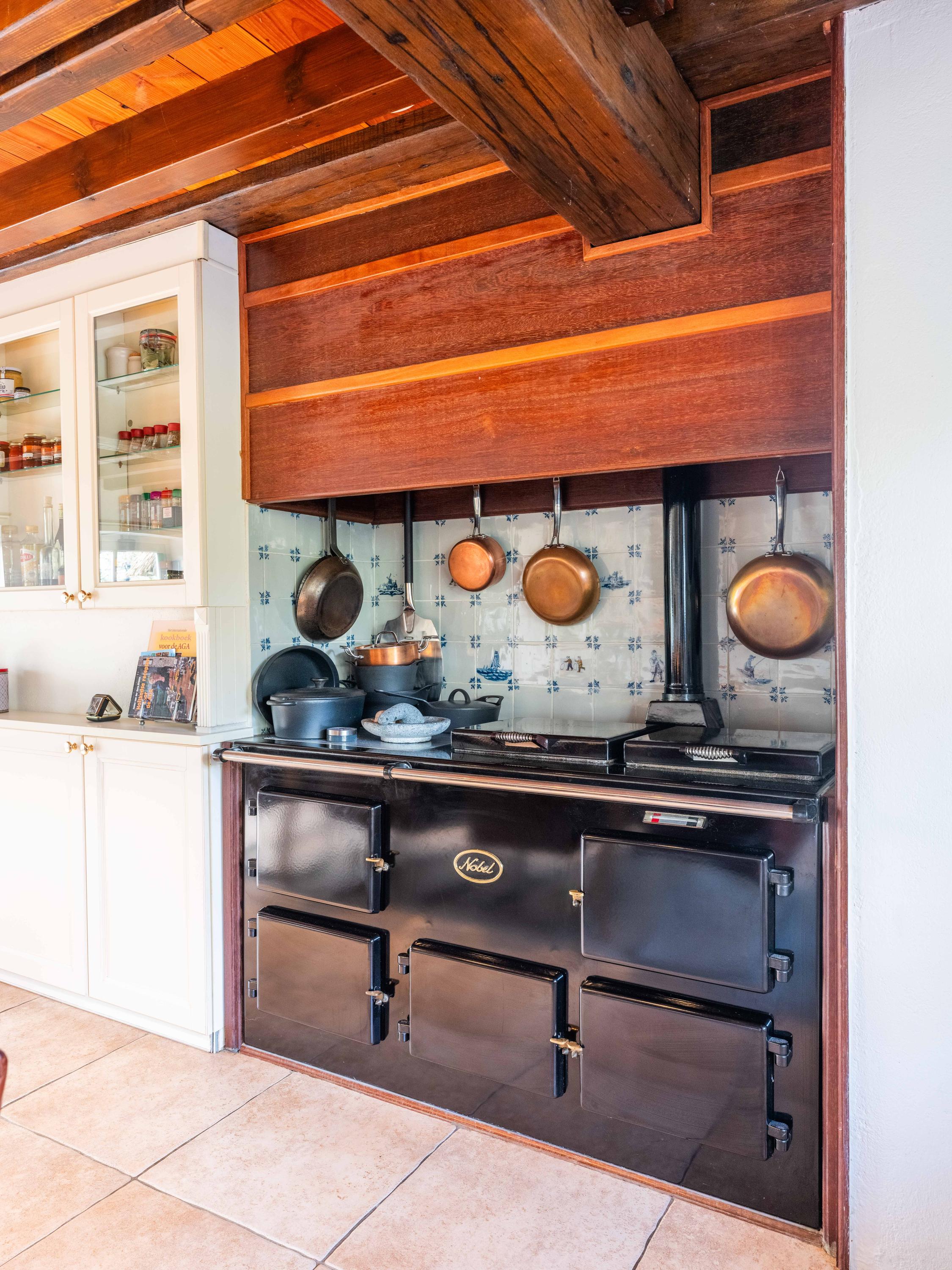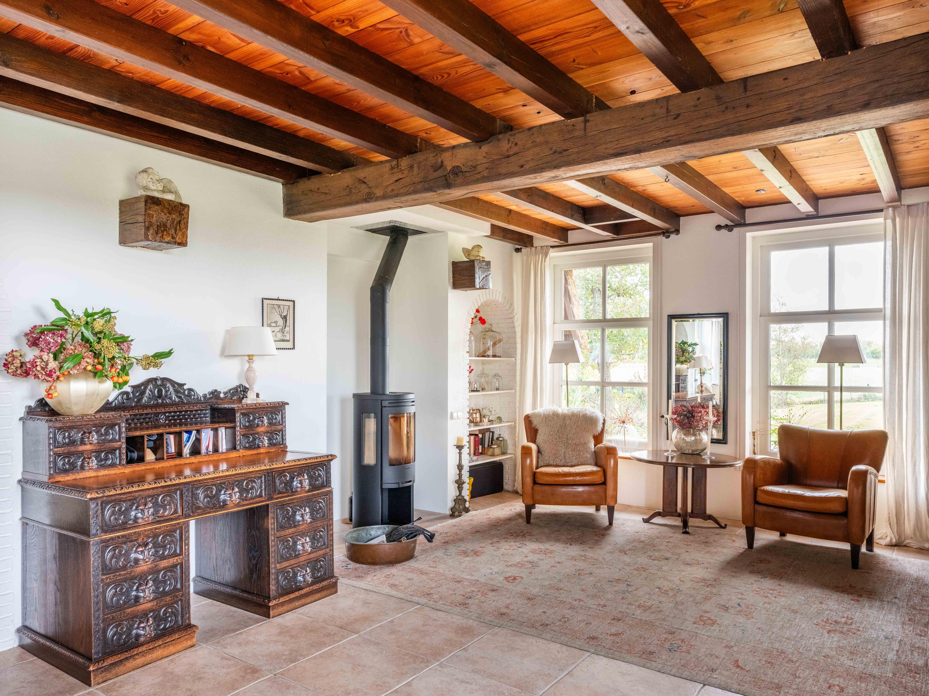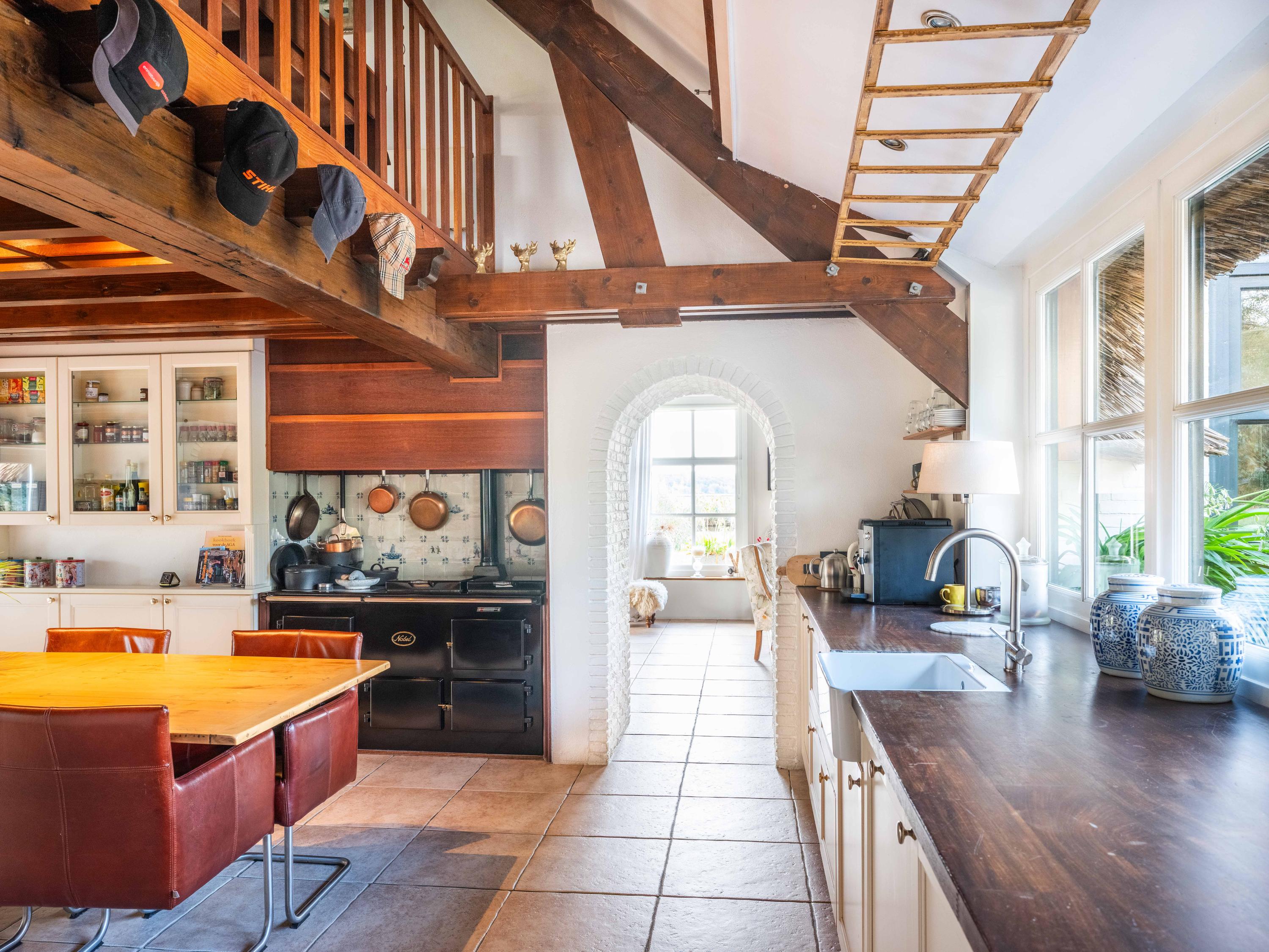 The country-style kitchen is fitted with built-in cabinets and ample storage space. From here, you can also access the spacious cellar, ideal for storage or as a wine cellar. The generous kitchen forms the heart of the home, featuring authentic details such as an English cooker with four ovens and characteristic beamed ceilings. The kitchen flows seamlessly into the inviting living room, where abundant natural light and views over the water immediately draw your attention. This room feels spacious and welcoming, enhanced by the centrally positioned wood-burning stove that adds a warm, homely touch.