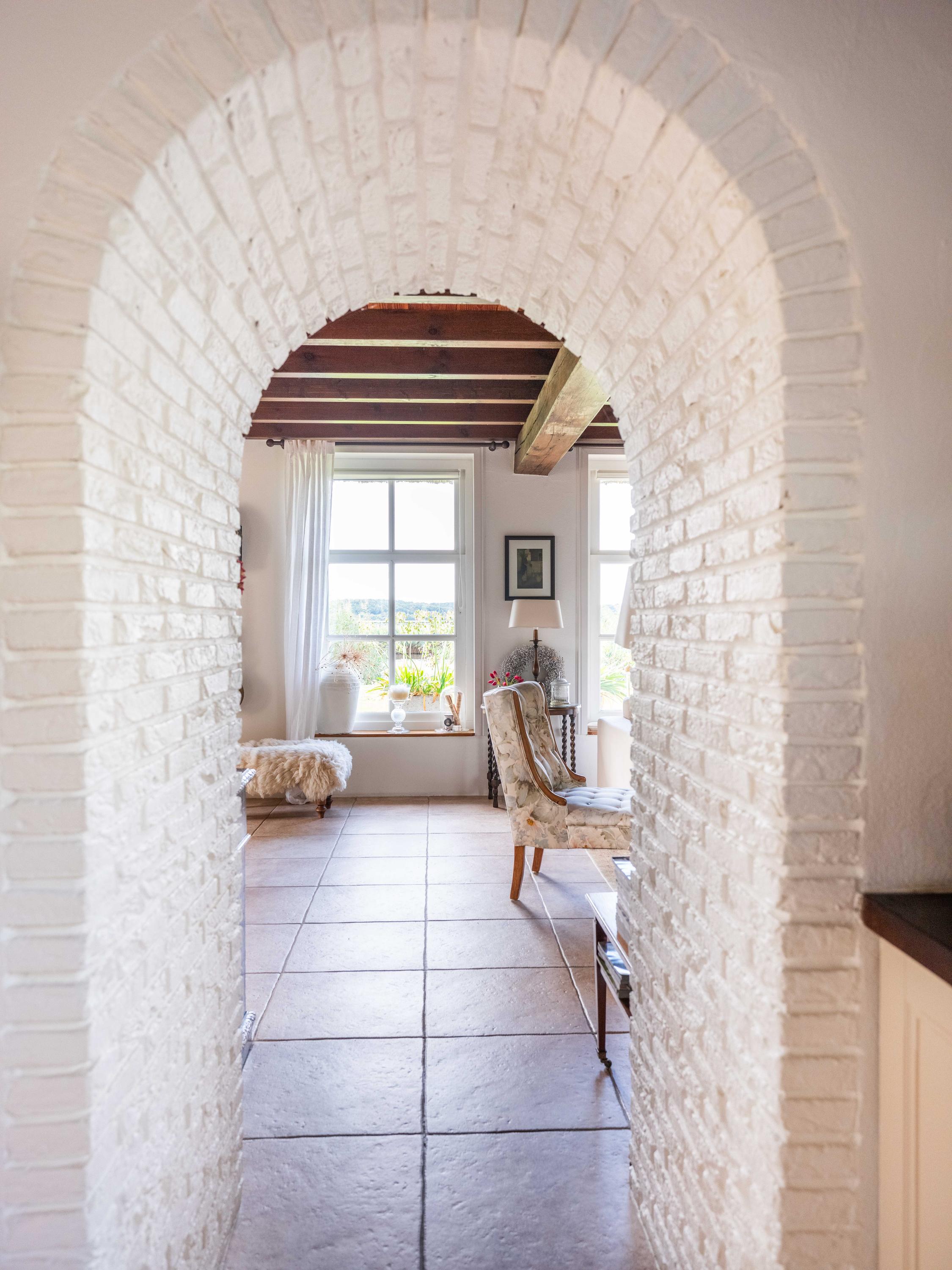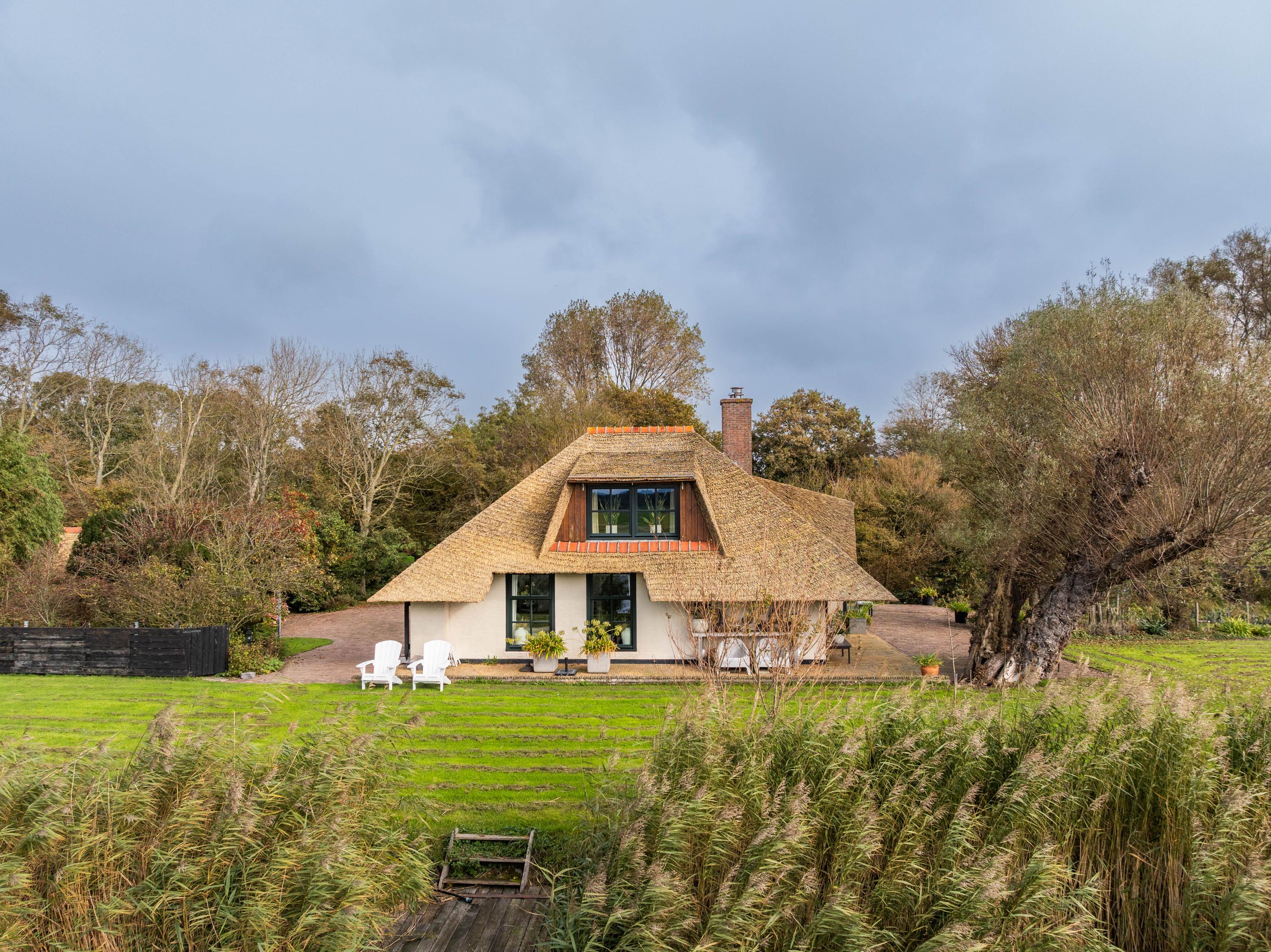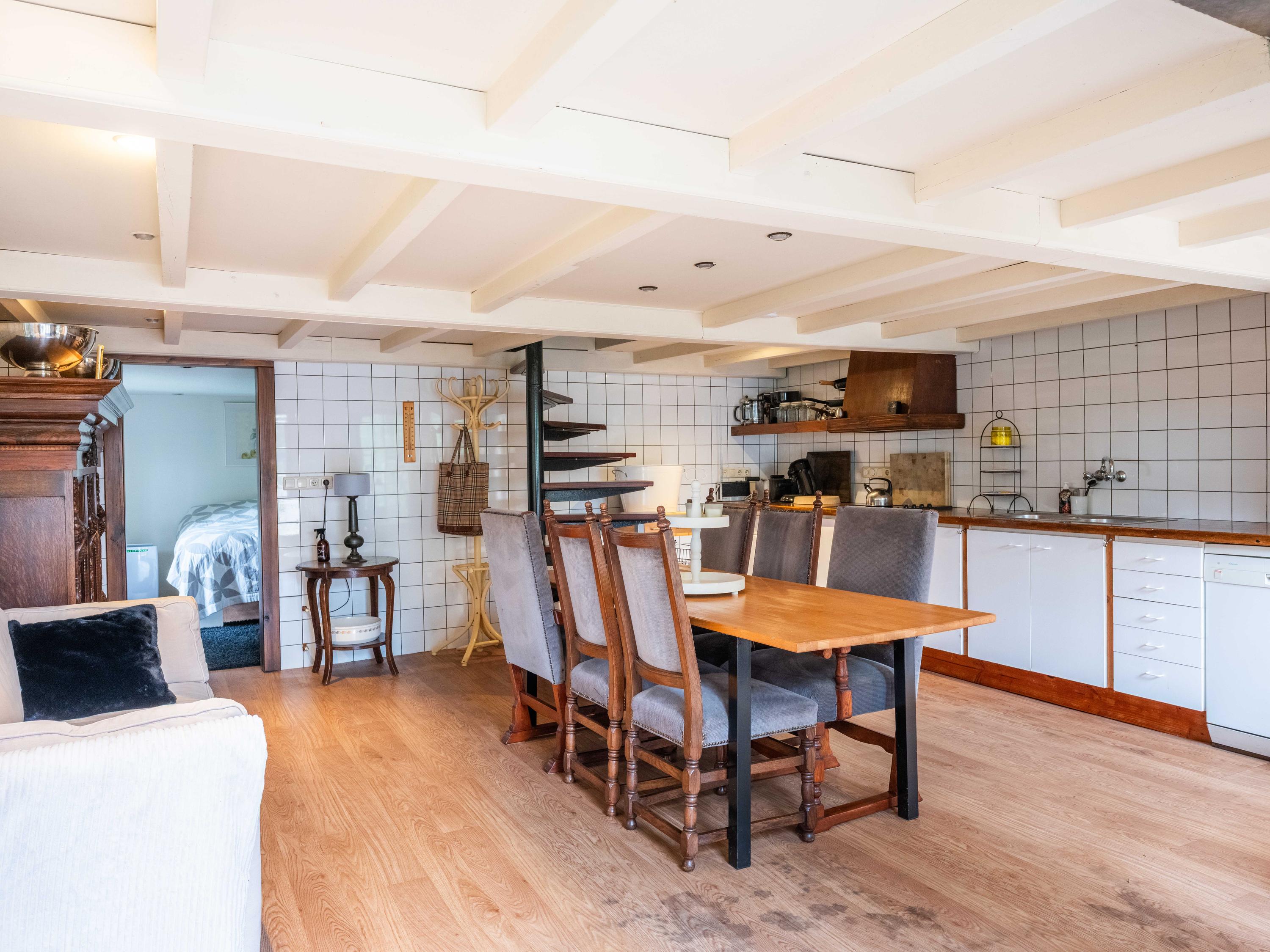 The country-style kitchen is fitted with built-in cabinets and ample storage space. From here, you can also access the spacious cellar, ideal for storage or as a wine cellar. The generous kitchen forms the heart of the home, featuring authentic details such as an English cooker with four ovens and characteristic beamed ceilings. The kitchen flows seamlessly into the inviting living room, where abundant natural light and views over the water immediately draw your attention. This room feels spacious and welcoming, enhanced by the centrally positioned wood-burning stove that adds a warm, homely touch.