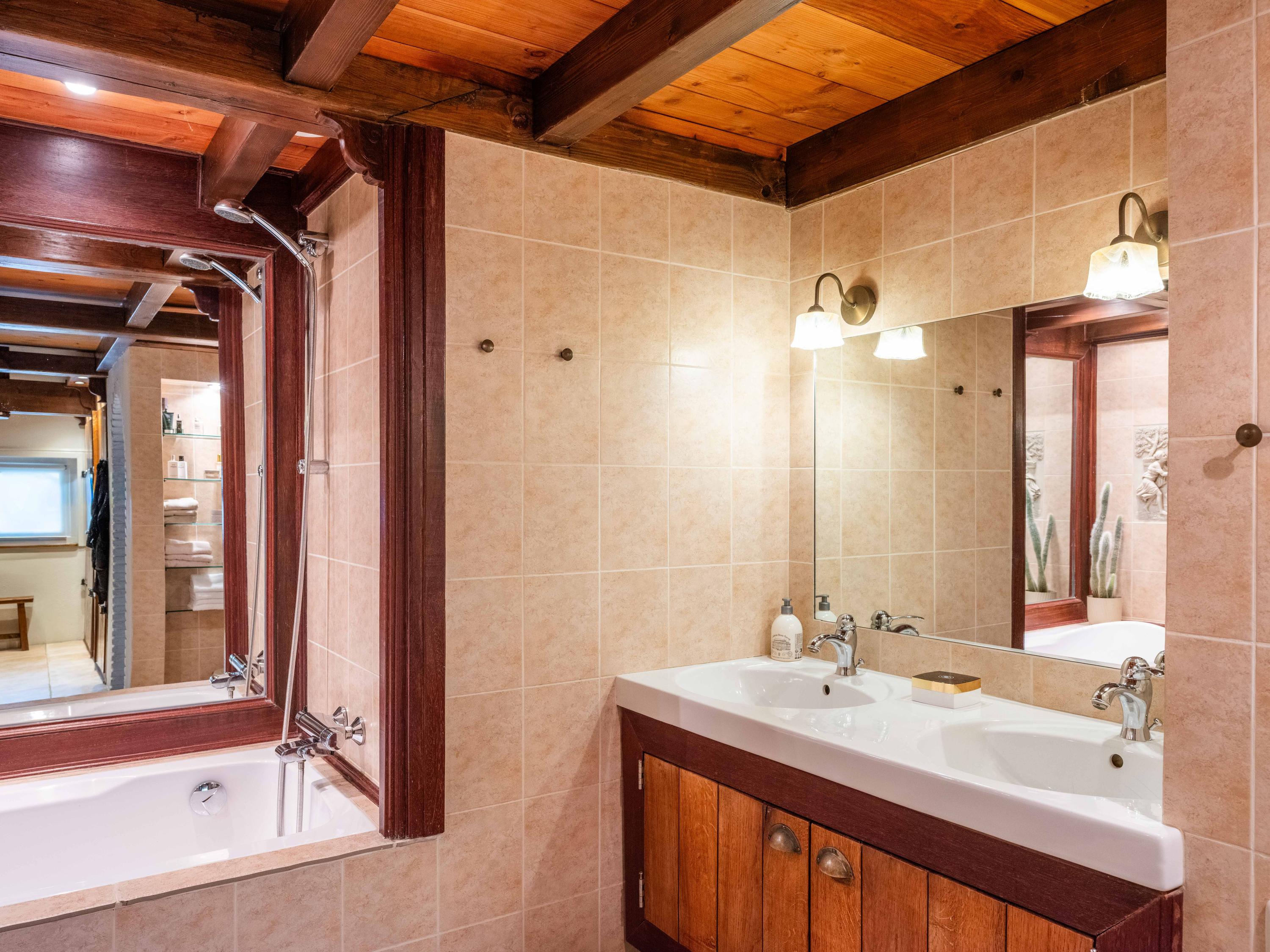 Adjacent to the kitchen is the luxurious bathroom, equipped with a bathtub, walk-in shower, toilet, double washbasin, and a practical walk-in closet.