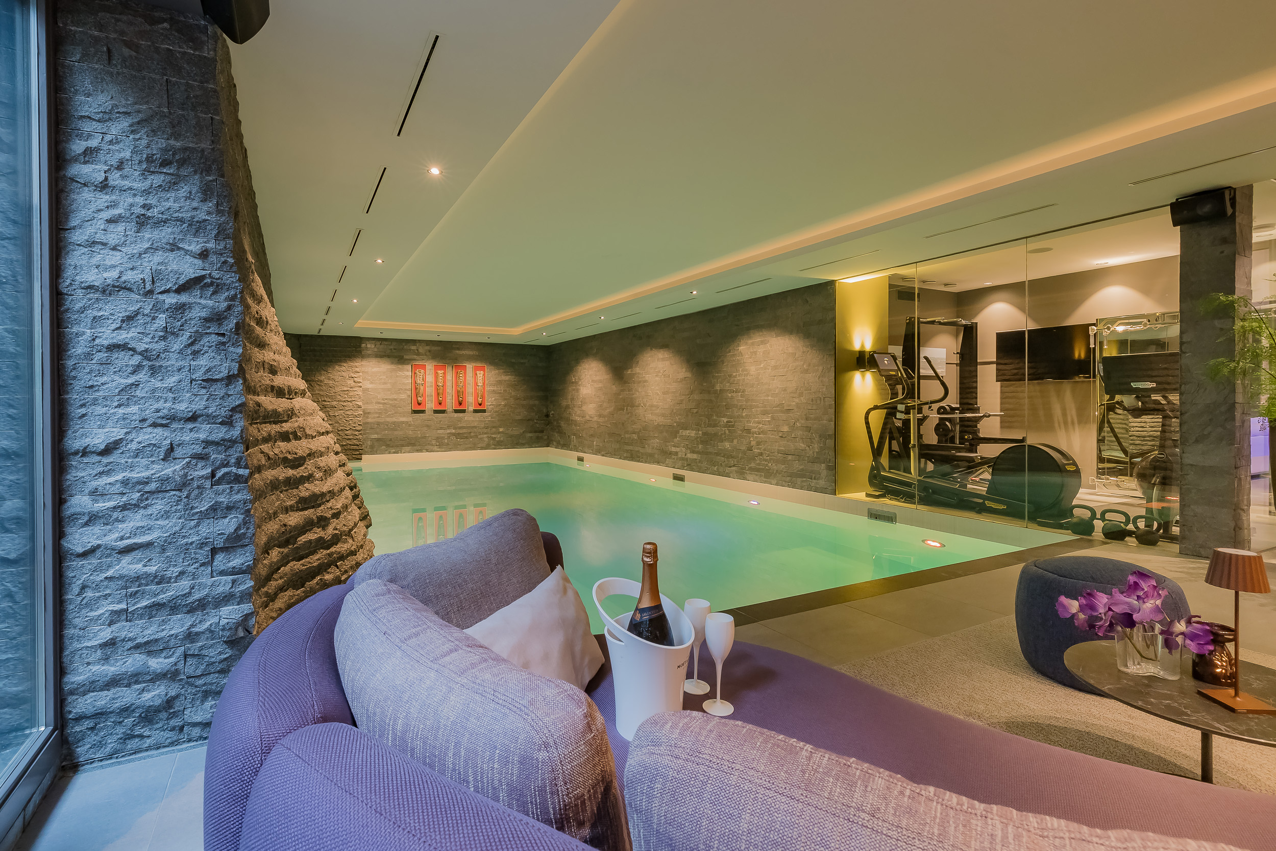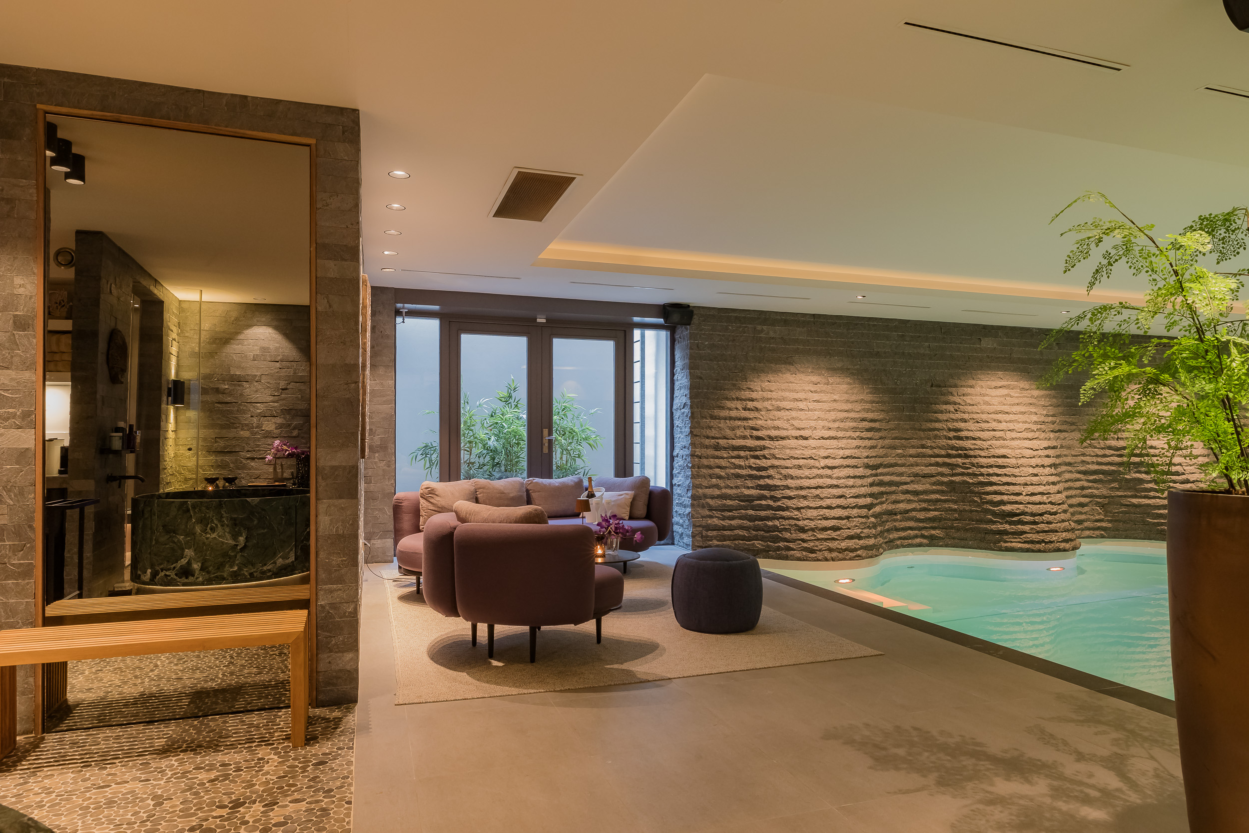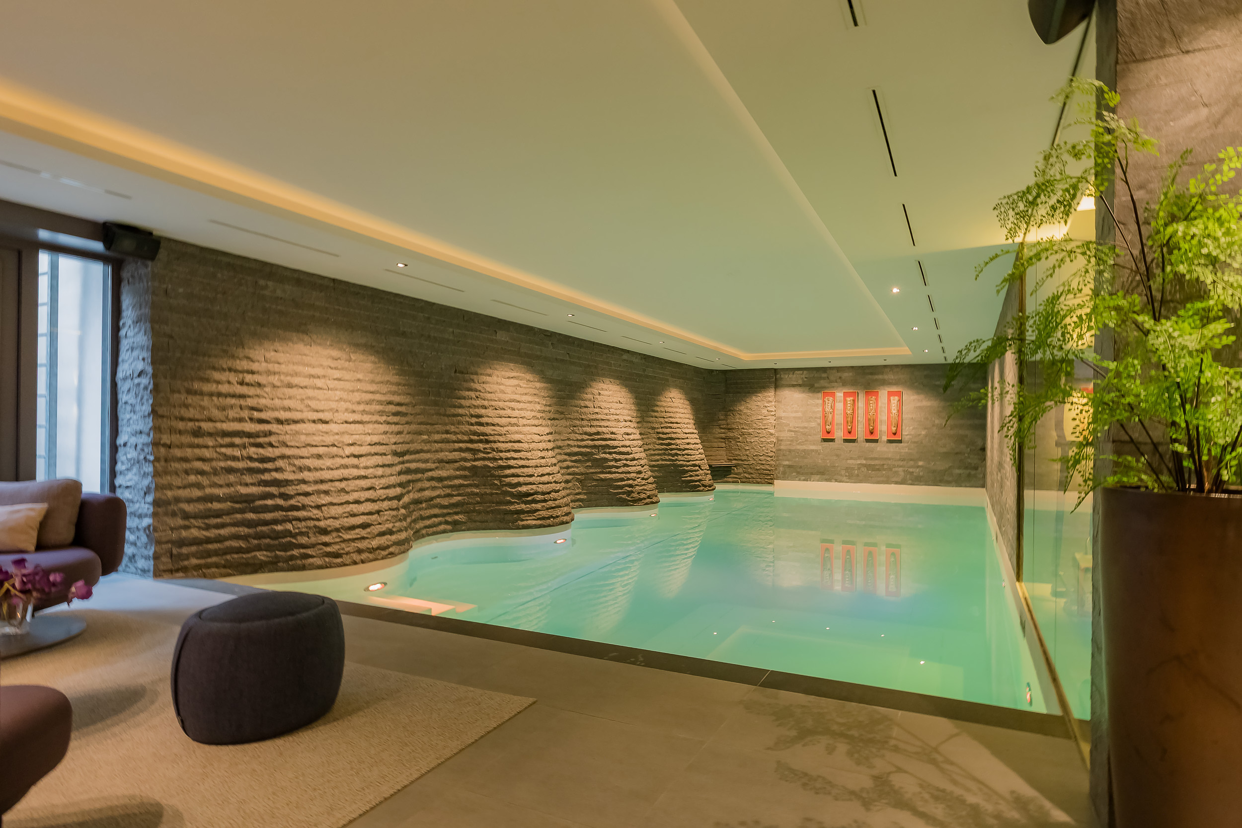 At its centre lies the 13-metre heated indoor pool, an architectural showpiece where sculpted walls ripple like mountain waves.