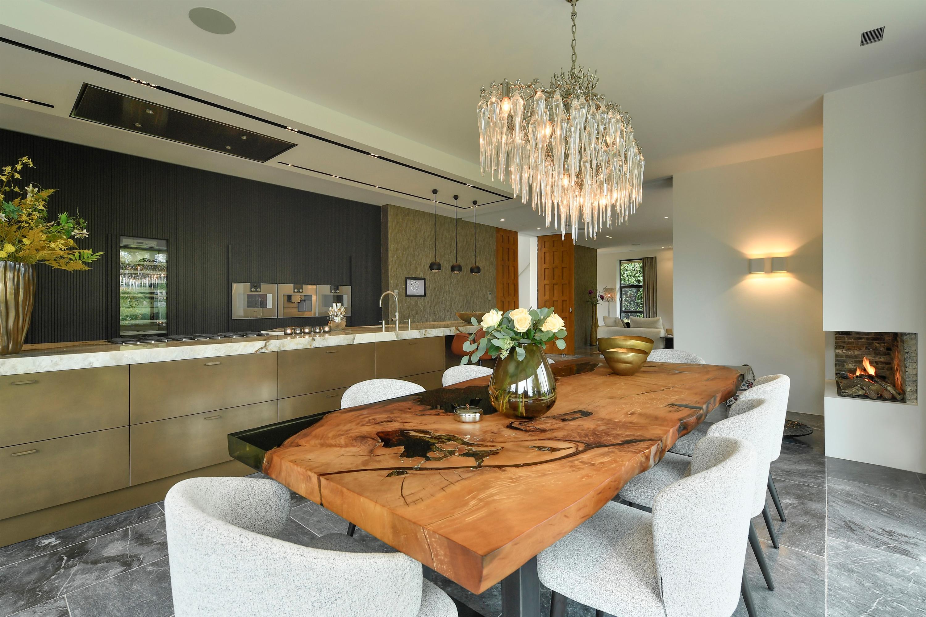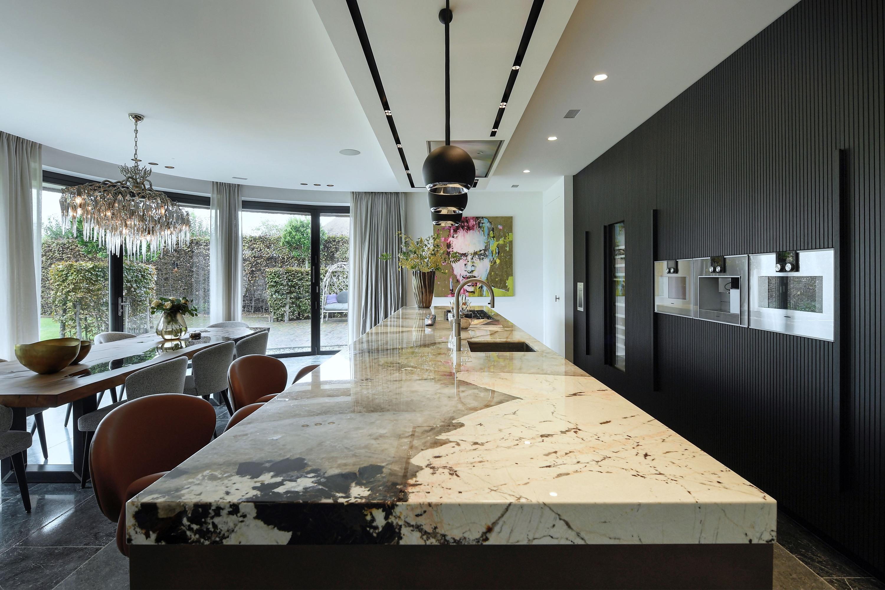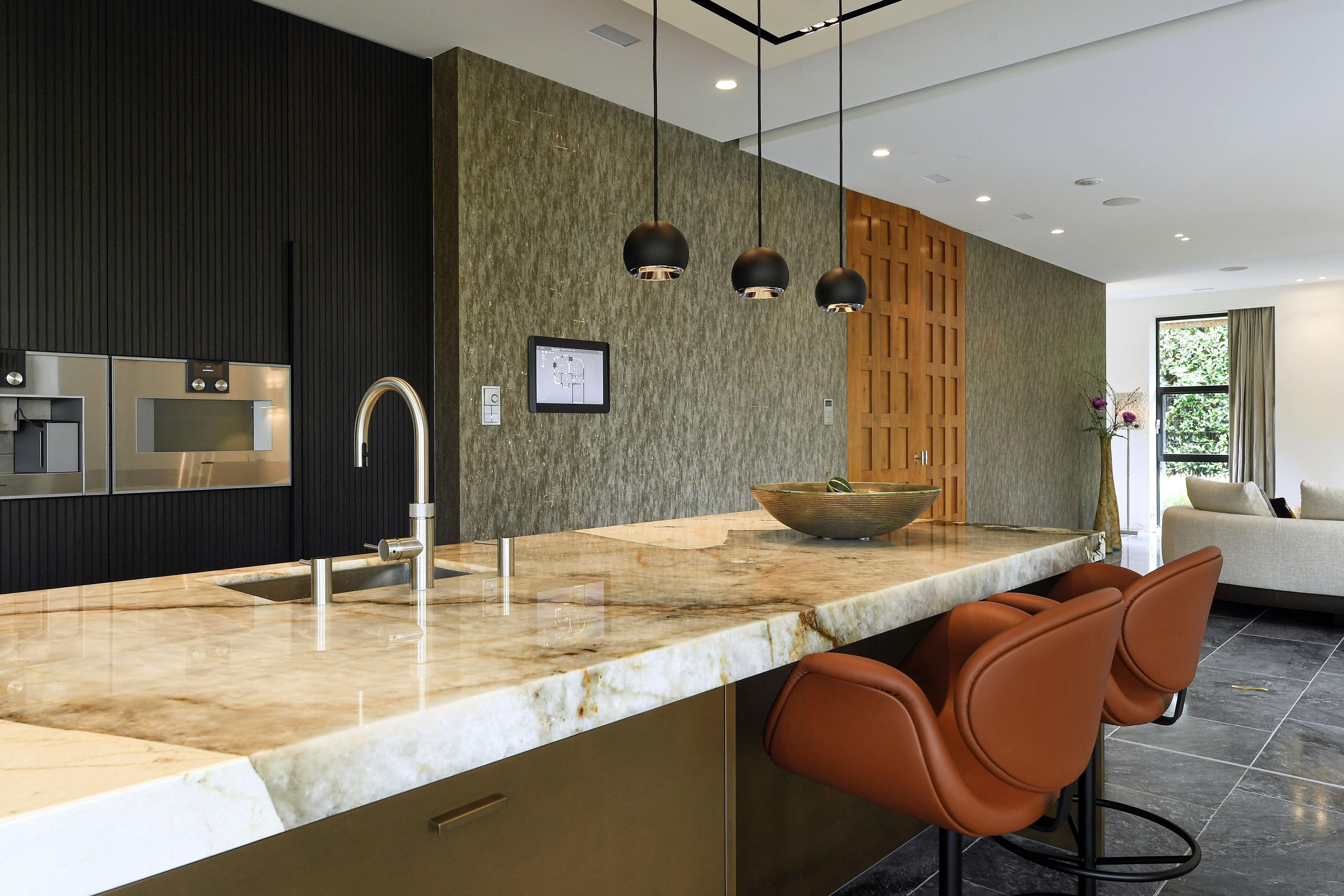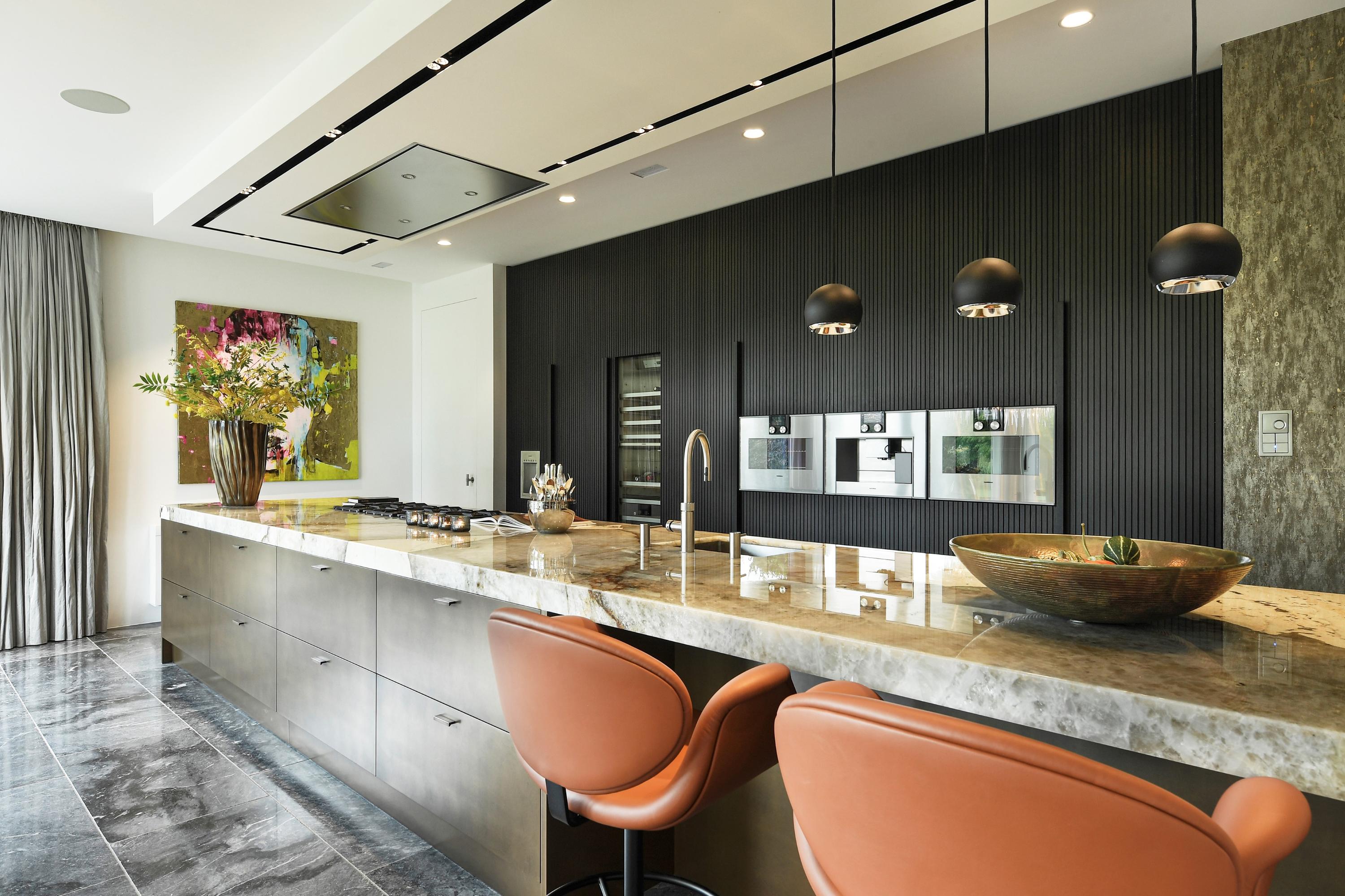 The luxury kitchen, centred around a stunning Patagonia quartzite island, is fully equipped with Gaggenau appliances.