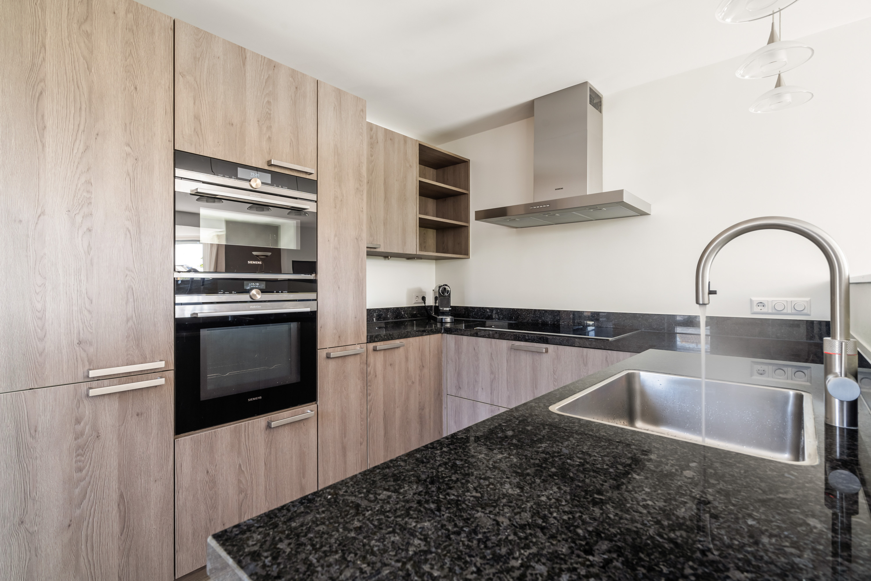 Cook in style: the open U-shaped kitchen is equipped with high-end Siemens appliances, including an induction cooktop with warming zone, steam oven, combi microwave, dishwasher, recirculating hood, pull-out pantry, and a Quooker. The bay window offers space for a large dining table with views of the garden and water.