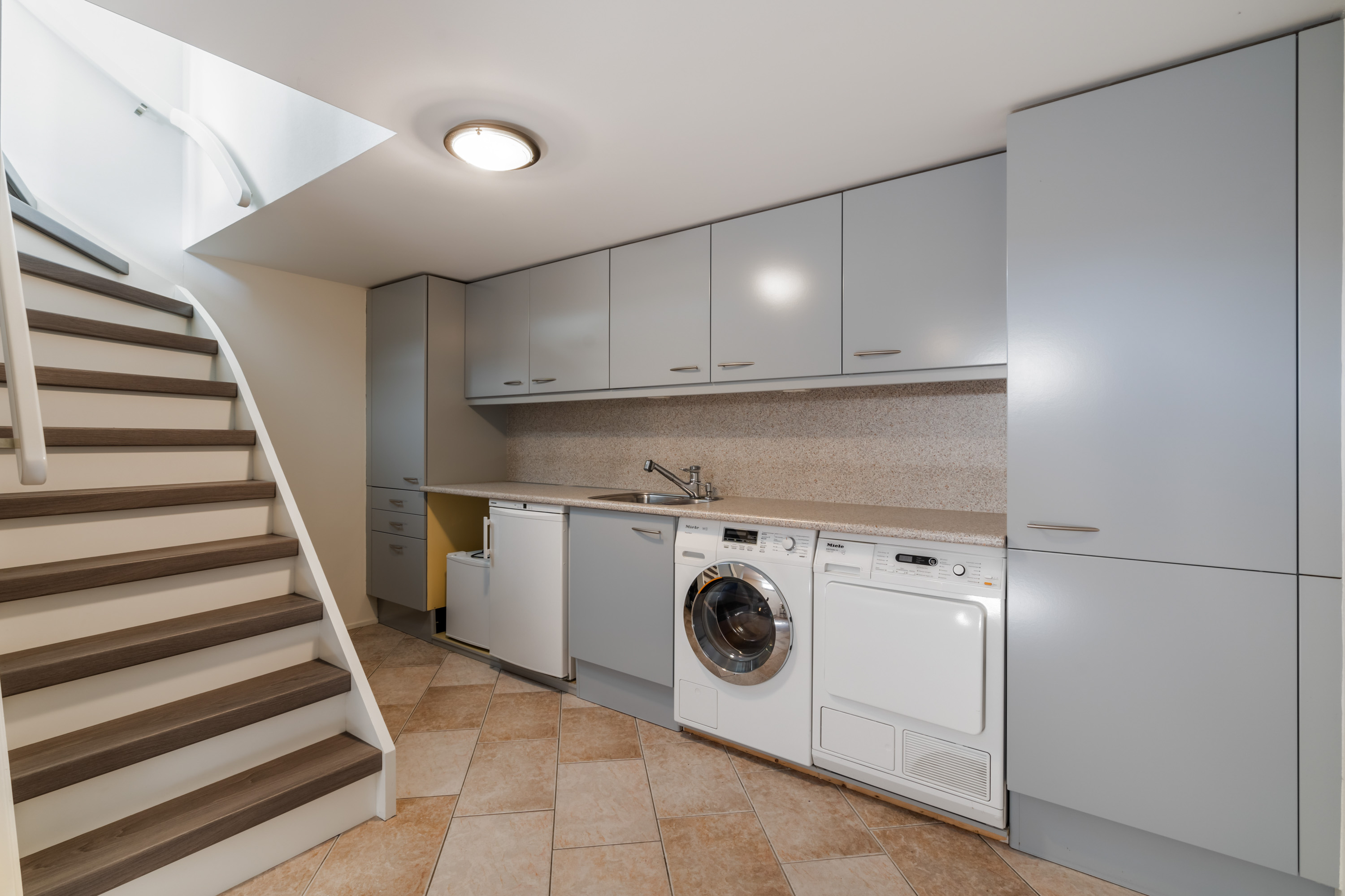 A fixed staircase (in the same style as the main stairway) leads to the basement. Here you’ll find a large laundry area with tiled floor, connections for washer and dryer, a kitchenette, and a freezer. There’s also a lounge with carpet and a spacious bedroom with washbasin, radiator, and window. This level offers many possibilities – ideal for guests, teenagers, or as a self-contained studio.