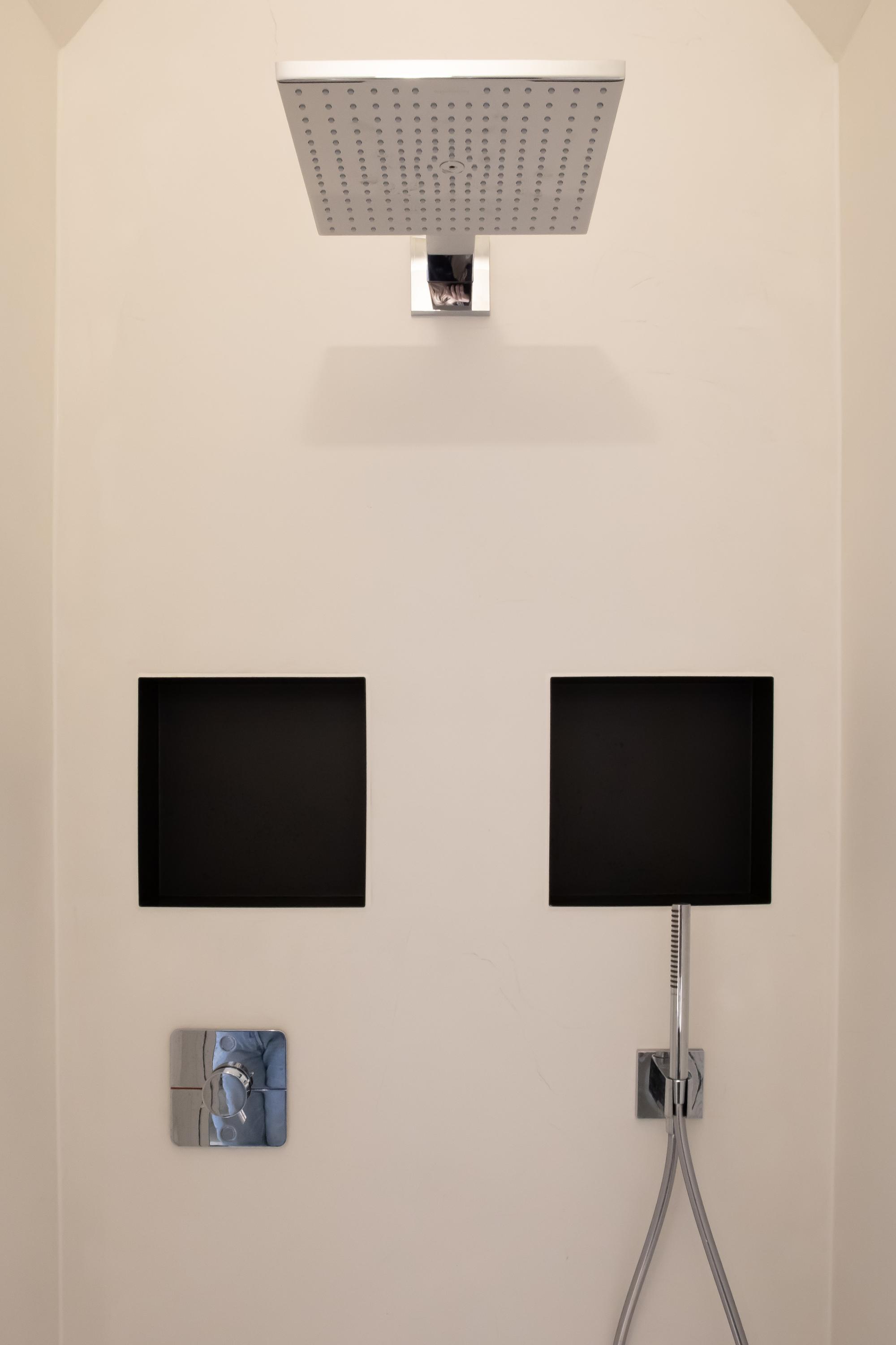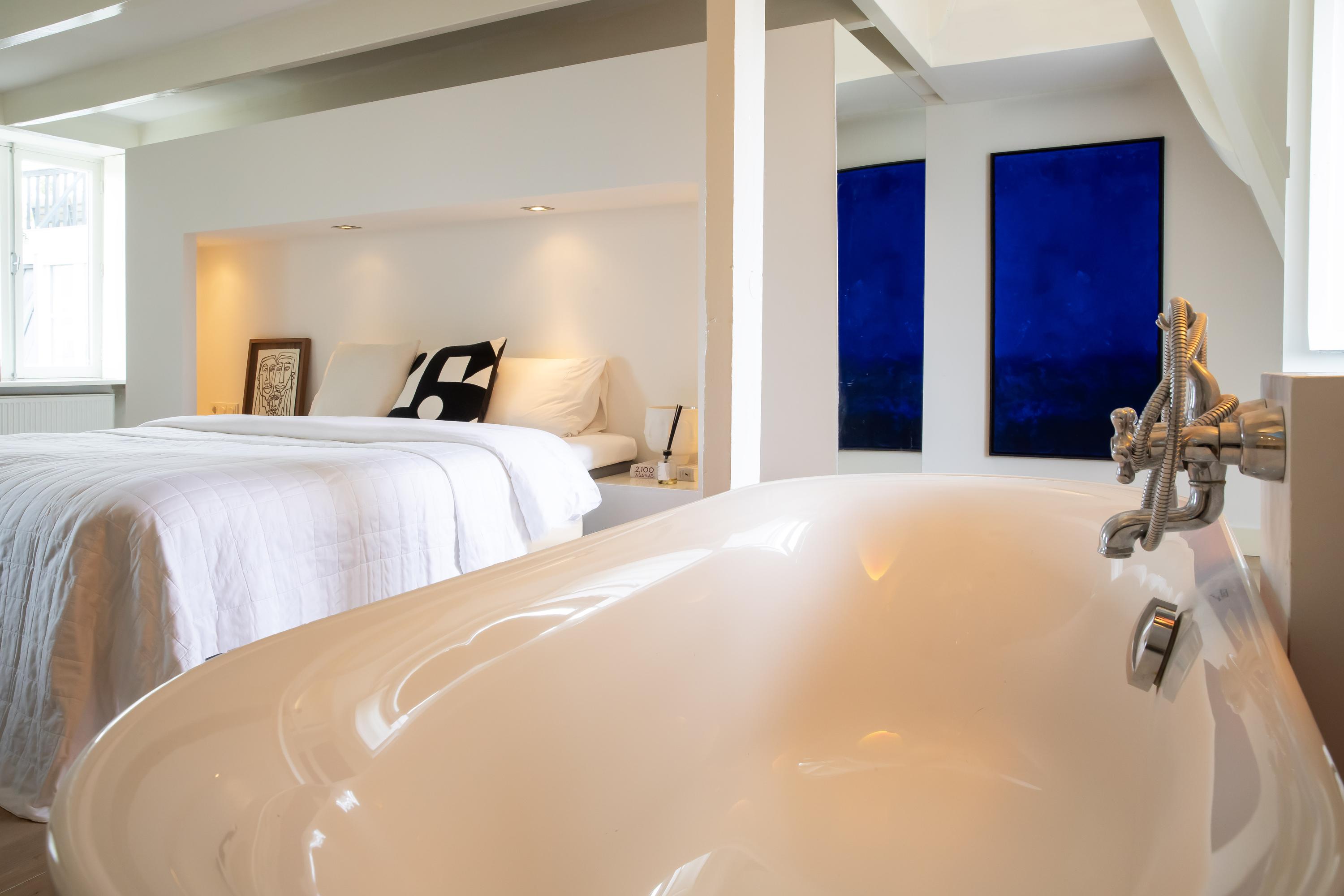 Op de bovenste verdieping vindt u de royale master bedroom, voorzien van een stijlvol bedmeubel met geïntegreerde verlichting, een vrijstaand bad, een airco-installatie en een karakteristieke balkenconstructie. En-suite ligt de moderne badkamer met industriële details, uitgerust met een dubbele wastafel met meubel, inloopdouche en toilet. Via de ruime hal bereikt u de tweede, goed bemeten slaapkamer, eveneens met een eigen badkamer voorzien van een wastafelmeubel en inloopdouche. Tegenover deze slaapkamer bevindt zich een separate wasruimte.