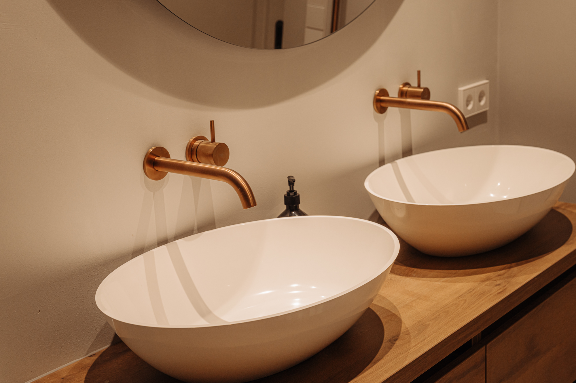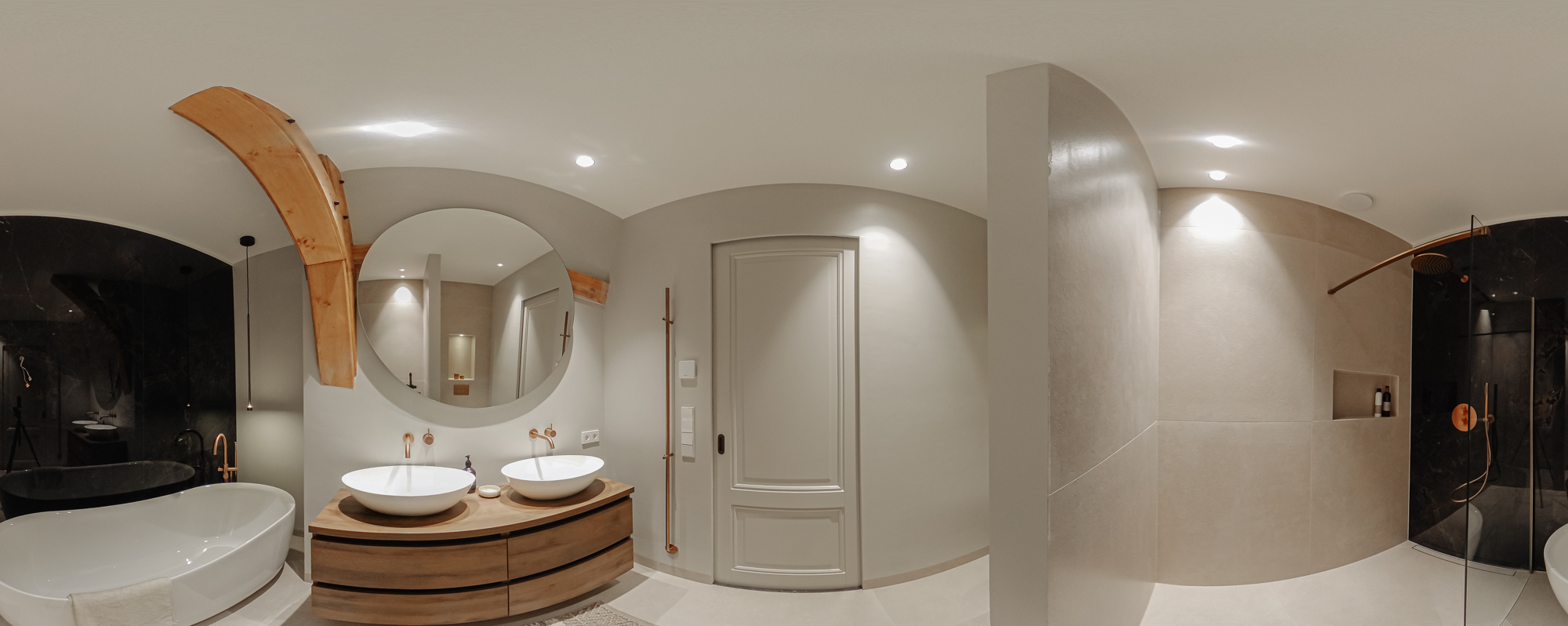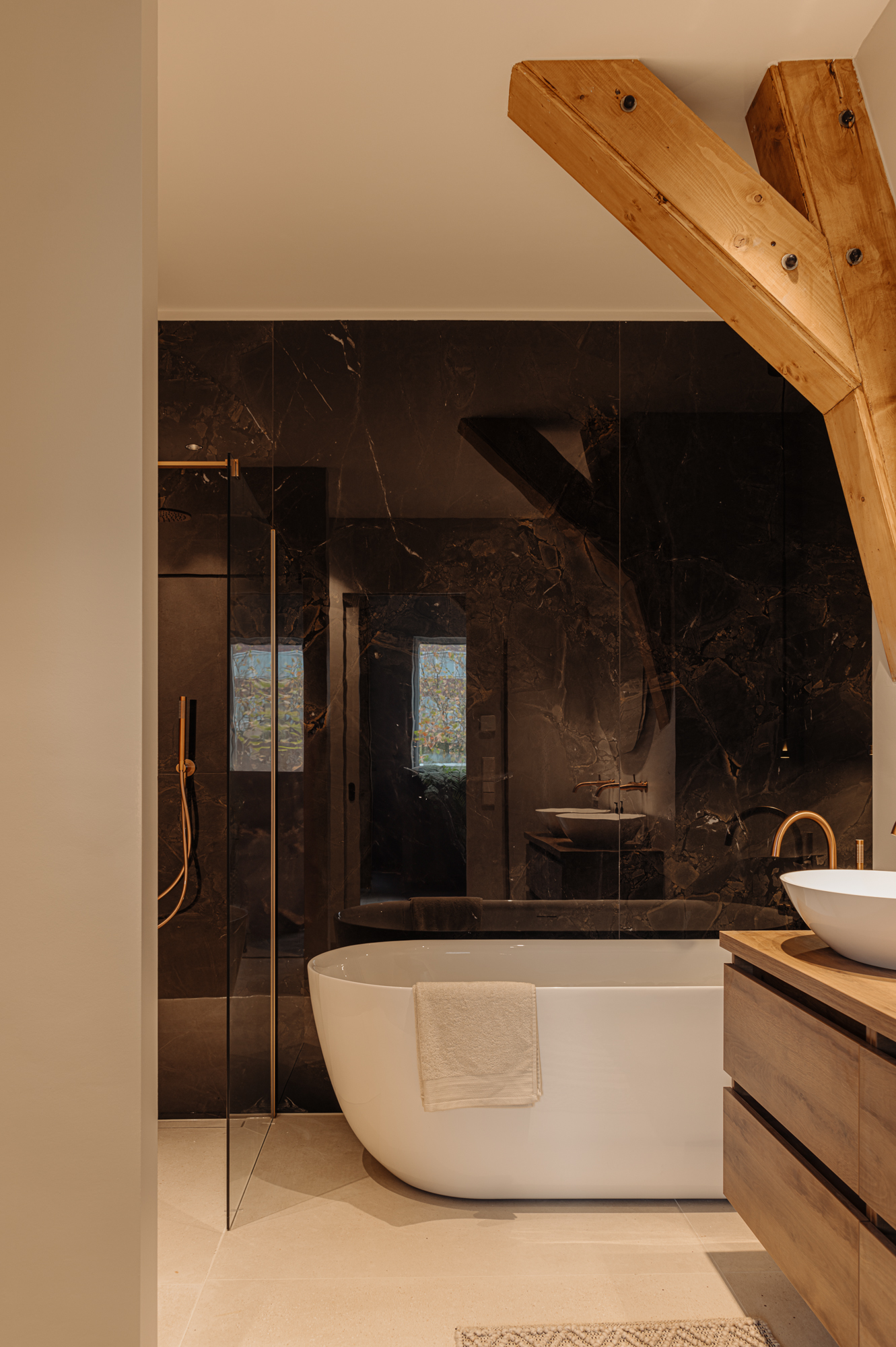 De slaapkamers aan de achterzijde genieten van een overvloed aan natuurlijk licht en zijn beide royaal van afmeting, waardoor er eenvoudig een derde slaapkamer te realiseren is. Ook hier zijn de prachtige originele houten balken, die bijdragen aan de karakteristieke charme van de woning, volop aanwezig. De Master bedroom beschikt over een eigen en-suite badkamer, uitgerust met een dubbele wastafel, een royaal ligbad, een ruime inloopdouche en een toilet. Deze badkamer biedt alle comfort en luxe die men zich kan wensen. De tweede badkamer is eveneens elegant ingericht en voorzien van een dubbele wastafel en een inloopdouche.