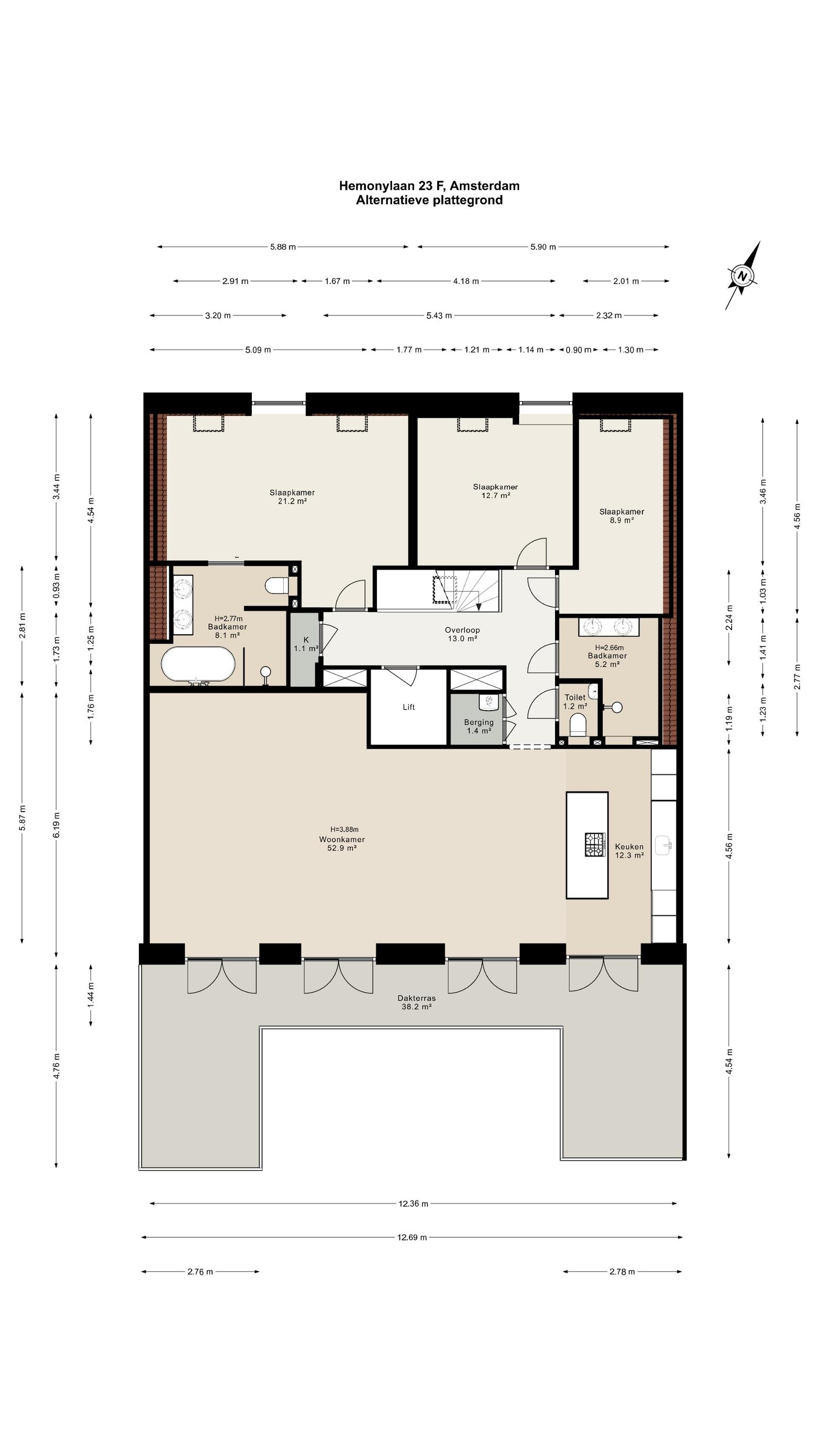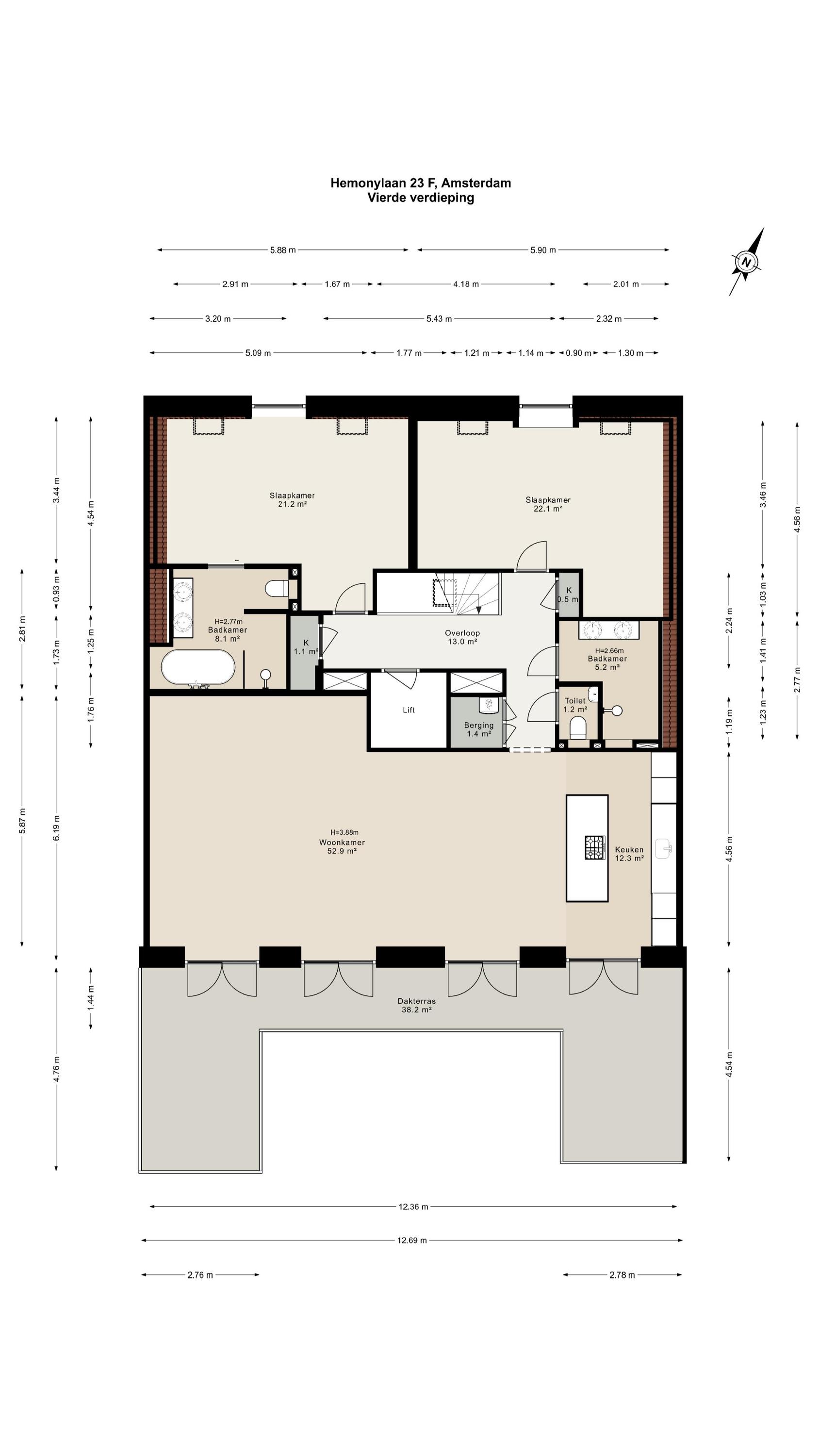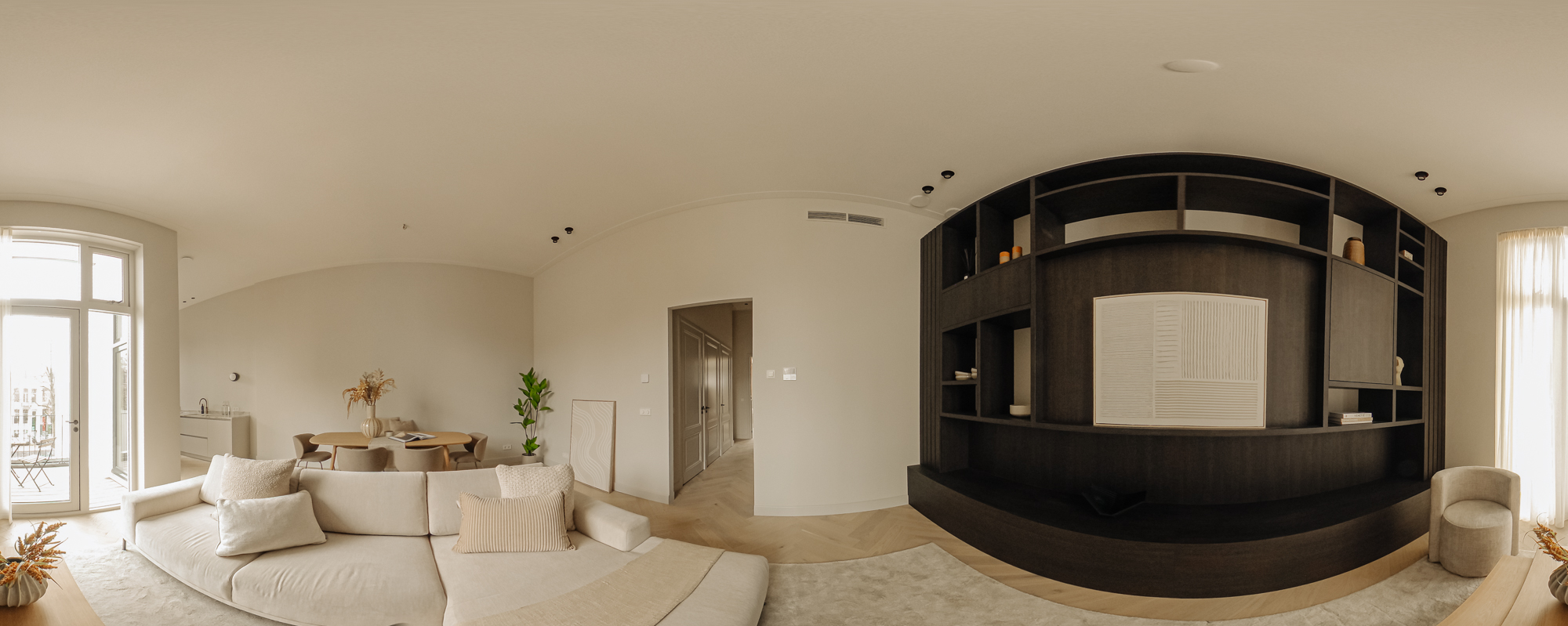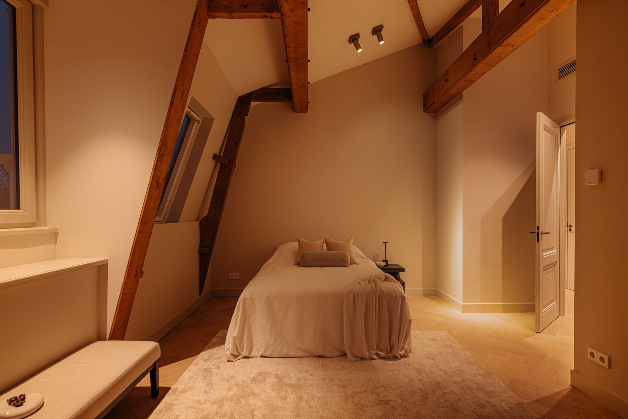 Bij binnenkomst via de lift, welke in de woning uitkomt, betreed u de overloop welke toegang biedt tot alle vertrekken. Aan de voorzijde bevindt zich de lichte en ruime woonkamer. Met de originelen houten balken in het zicht ervaart u hier de luxe en comfort in combinatie met originele elementen. De Italiaanse open designerkeuken met kookeiland is uitgerust met alle denkbare inbouwapparatuur en biedt een perfecte balans tussen stijl en functionaliteit. De verfijnde combinatie van de kasten in de warme tint van notenhout met een stenen aanrechtblad zorgt voor een prachtige en sfeervolle uitstraling van de ruimte. Middels meerdere openslaande deuren is er vervolgens toegang tot het zonnige dakterras.