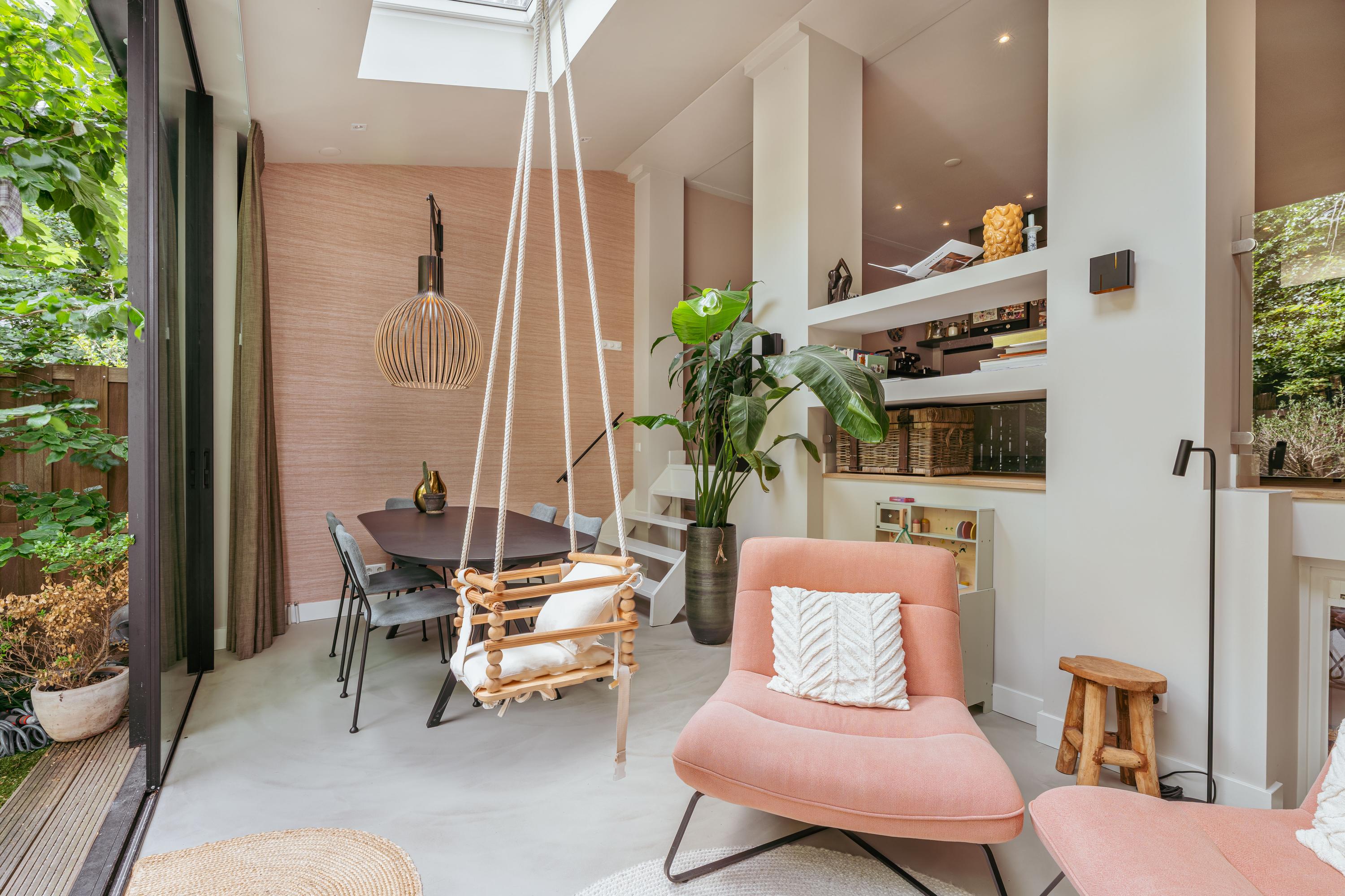 Aan de voorzijde bevindt zich de royale woonkamer, waar eenvoudig een comfortabele zithoek kan worden ingericht. Centraal in de woning treft u de open keuken met een stijlvol kookeiland en een gezellig bargedeelte. De keuken is uitgerust met hoogwaardige inbouwapparatuur, waaronder een 4-pits inductiekookplaat met geïntegreerde afzuiging, een vaatwasser, een koel-/vriescombinatie, een combi-oven en een Quooker. Een paar treden lager komt u in de recent gerealiseerde uitbouw met dakramen, die veel natuurlijk licht binnenlaten. Hier is momenteel een sfeervolle eetruimte ingericht, met daarnaast een extra zithoek rondom een moderne gashaard. Via plafondhoge glazen schuifdeuren bereikt u de fraai aangelegde tuin van circa 32 m², gelegen op het oosten. Daarnaast beschikt u over een praktische berging in de tuin.