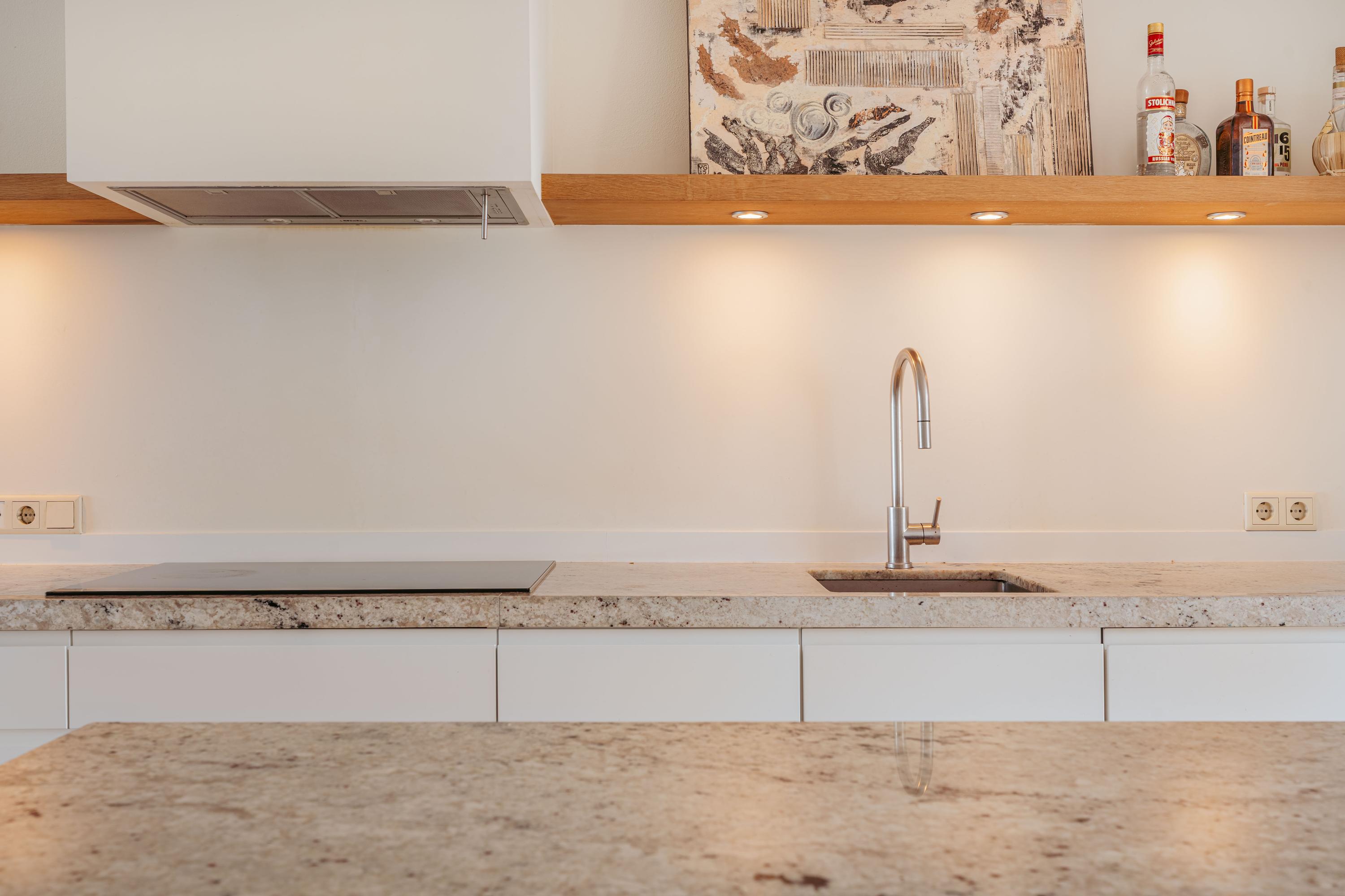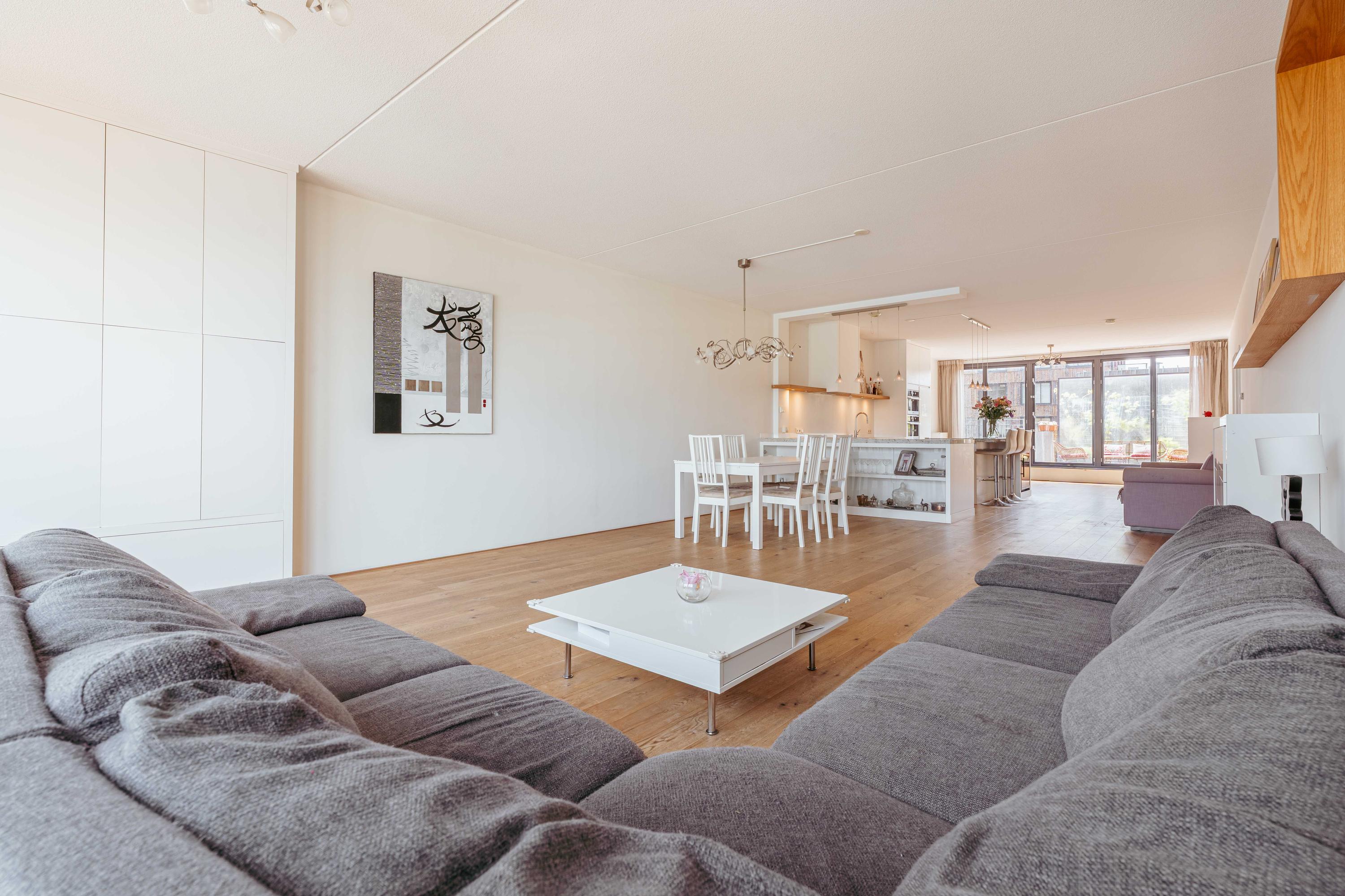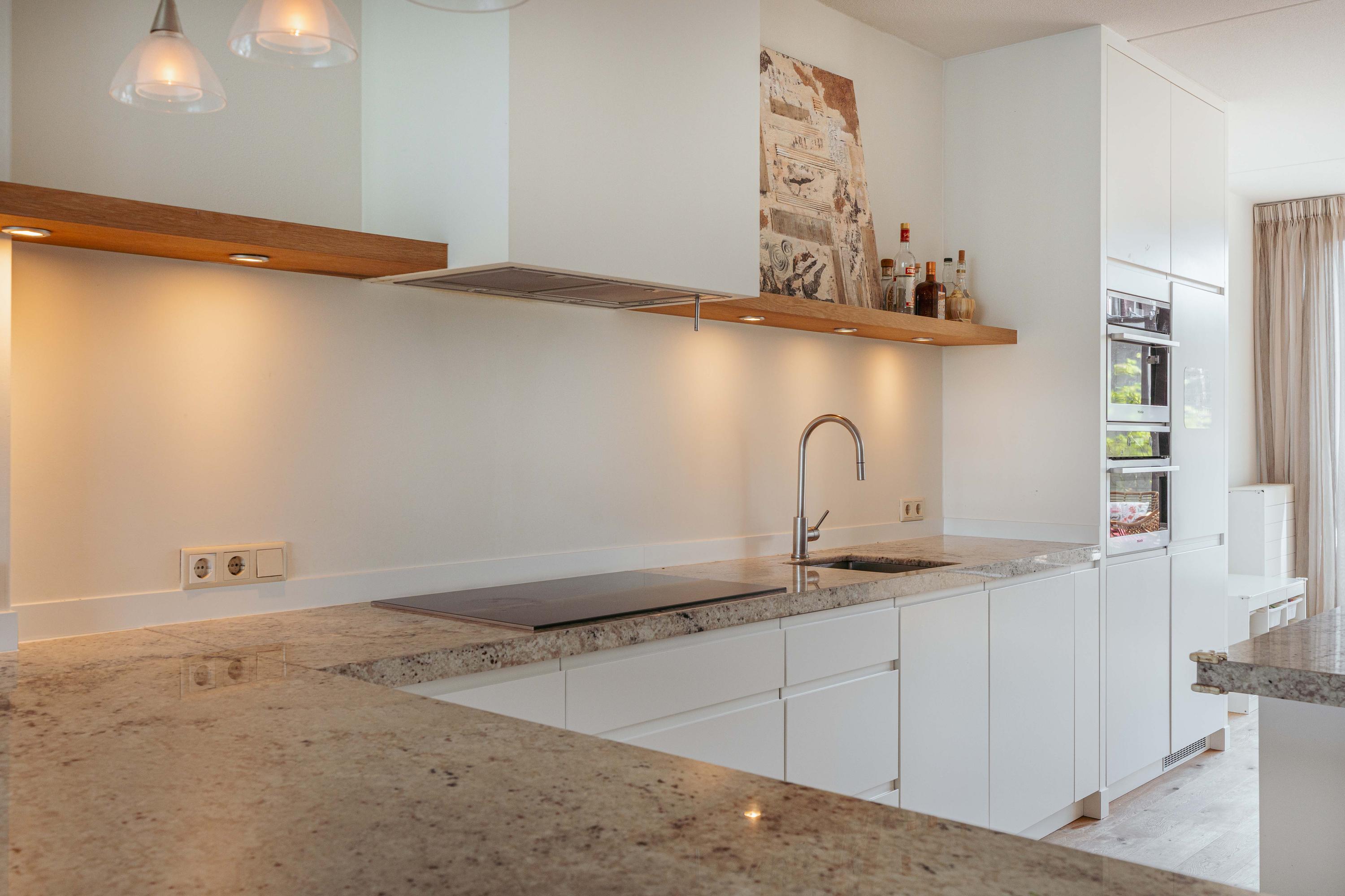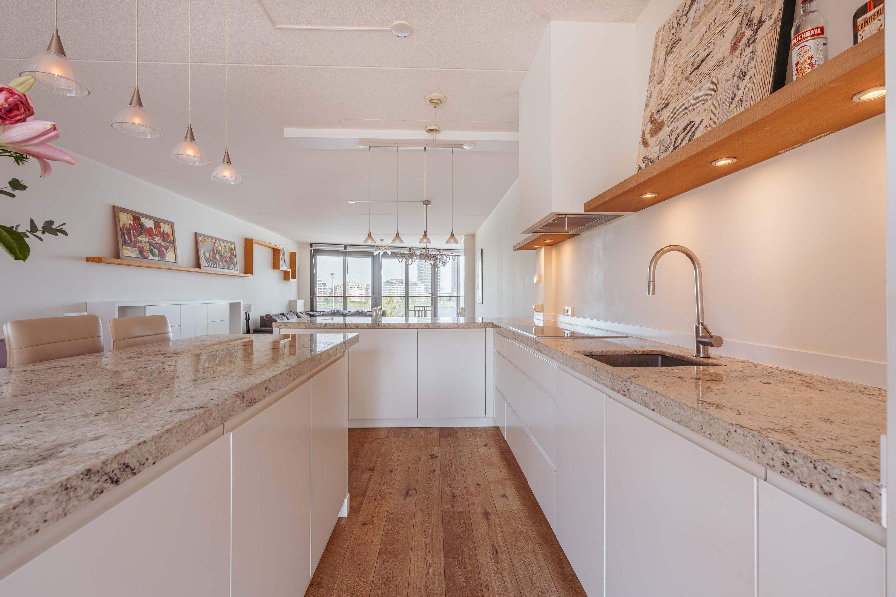De ruime ontvangsthal leidt naar een tweede hal, die toegang biedt tot de royale living met open keuken. Dankzij de kamerbreedte en plafondhoge raampartijen aan de voorzijde geniet u hier van een fenomenaal uitzicht over het IJ. Dubbele deuren aan de achterzijde bieden toegang tot het zonnige terras van ca. 14m² gelegen op het westen - een heerlijke plek om buiten te zitten. De luxe open keuken is uitgevoerd met een stijlvol kookeiland, wijnklimaatkast en hoogwaardige inbouwapparatuur zoals een koelkast, vriezer, inductiekookplaat, vaatwasser en twee ovens. Het appartement beschikt over drie slaapkamers: twee aan de voorzijde en één aan de rustige achterzijde bij het terras. De moderne badkamer is voorzien van een ligbad, inloopdouche, dubbele wastafel en toilet. Daarnaast is er een separaat toilet met fonteintje en een ruime inpandige berging met wasmachineaansluiting, plus een tweede berging.