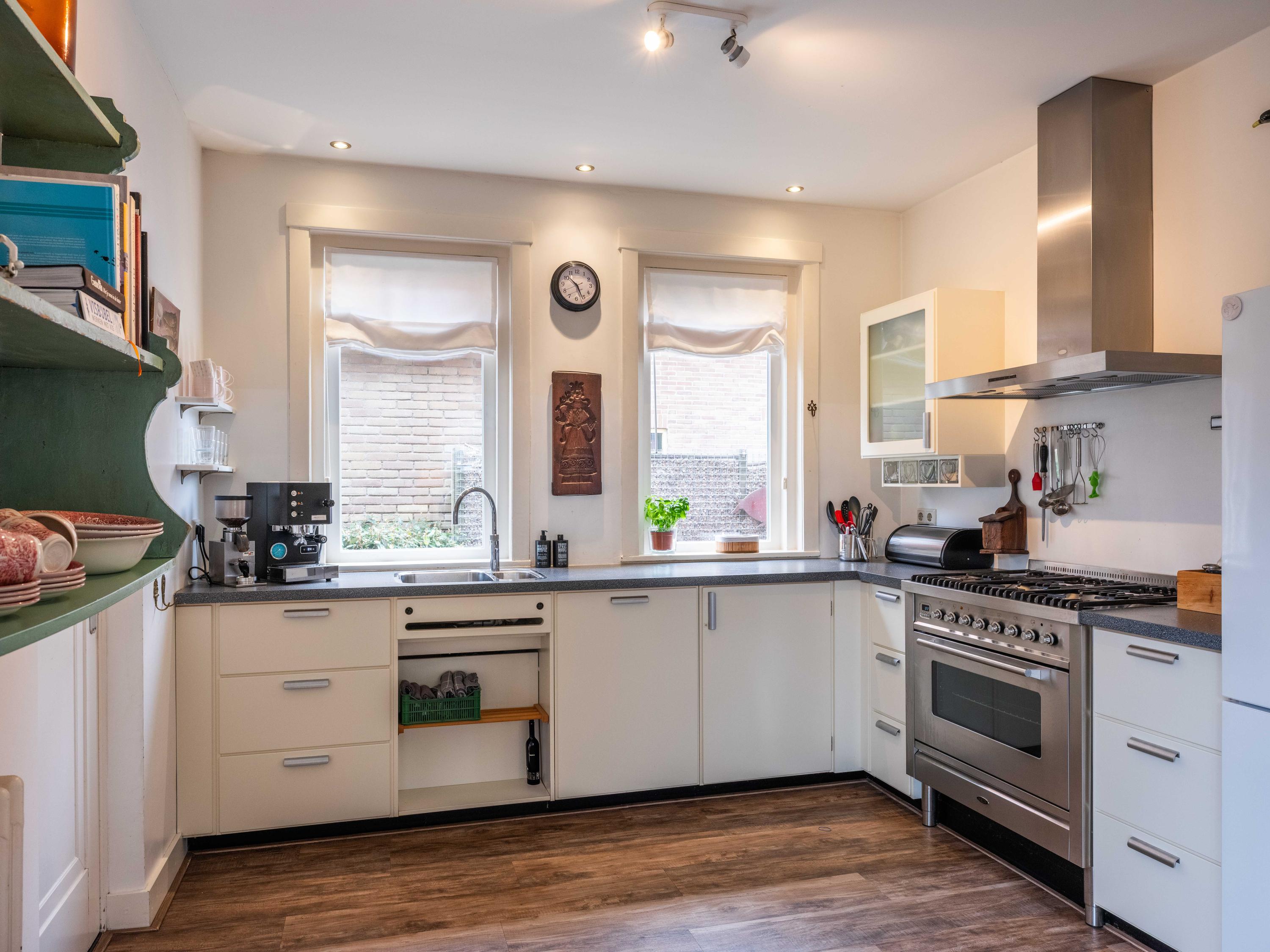 De open keuken is uitgerust met inbouwapparatuur, waaronder een 6-pits Boretti gasfornuis, een Quooker en een vaatwasser. Vanuit de keuken is de bijkeuken bereikbaar, met een wasbak, een raam met uitzicht op de tuin en aansluitingen voor een wasmachine en droger. Boven de bijkeuken bevindt zich een praktische zolderruimte met de cv-ketel.