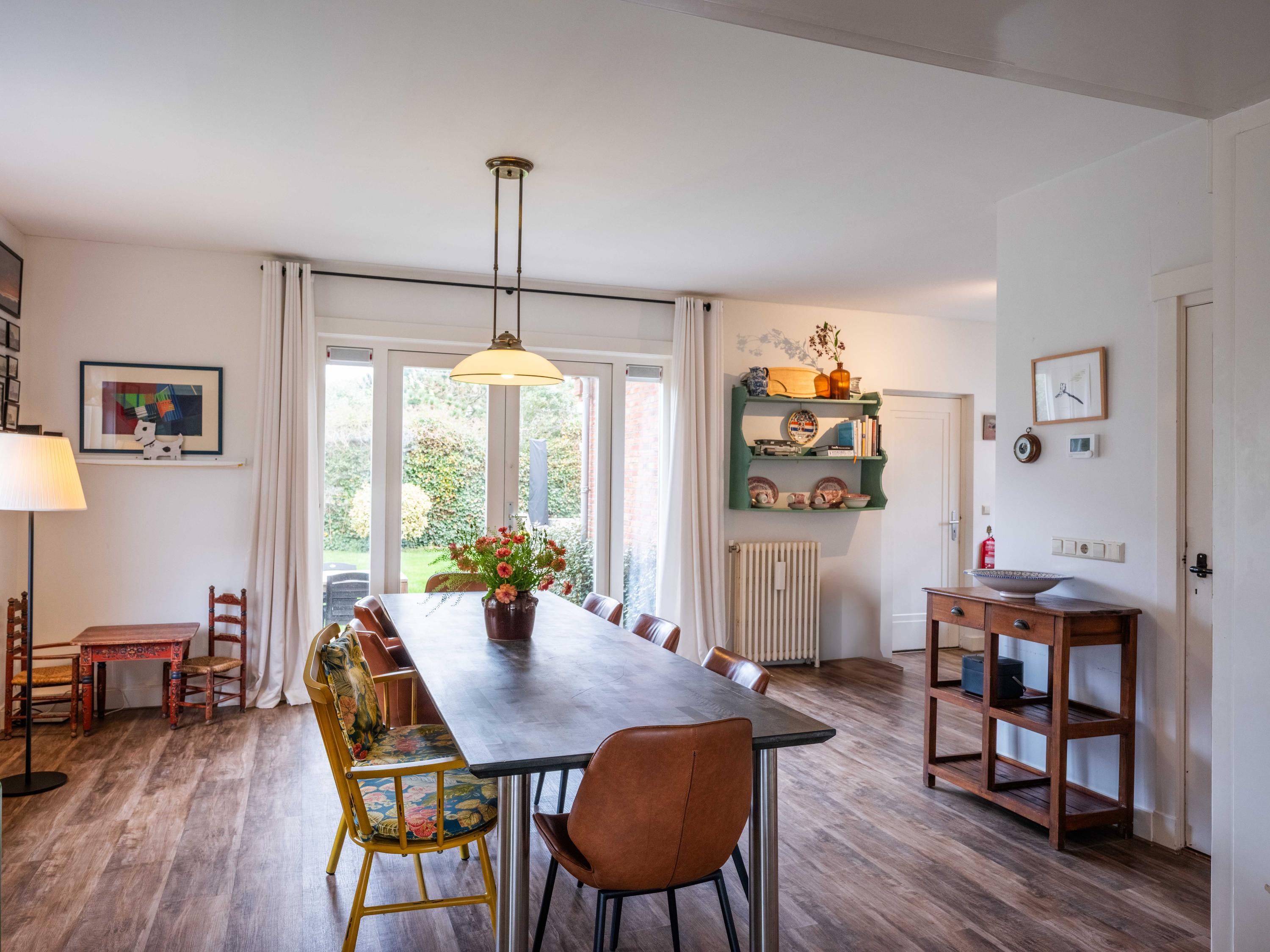 Bij binnenkomst via het tochtportaal valt direct de ruime hal op, met garderobe, meterkast, toilet en toegang tot de kelder. Vanuit de hal zijn zowel de woonkamer als de eetkamer bereikbaar. De woonkamer en-suite is licht en ruim, voorzien van een erker, ingebouwde kasten en een sfeervolle houtkachel. Openslaande deuren geven toegang tot de tuin. De aangrenzende eetkamer heeft eveneens openslaande deuren.