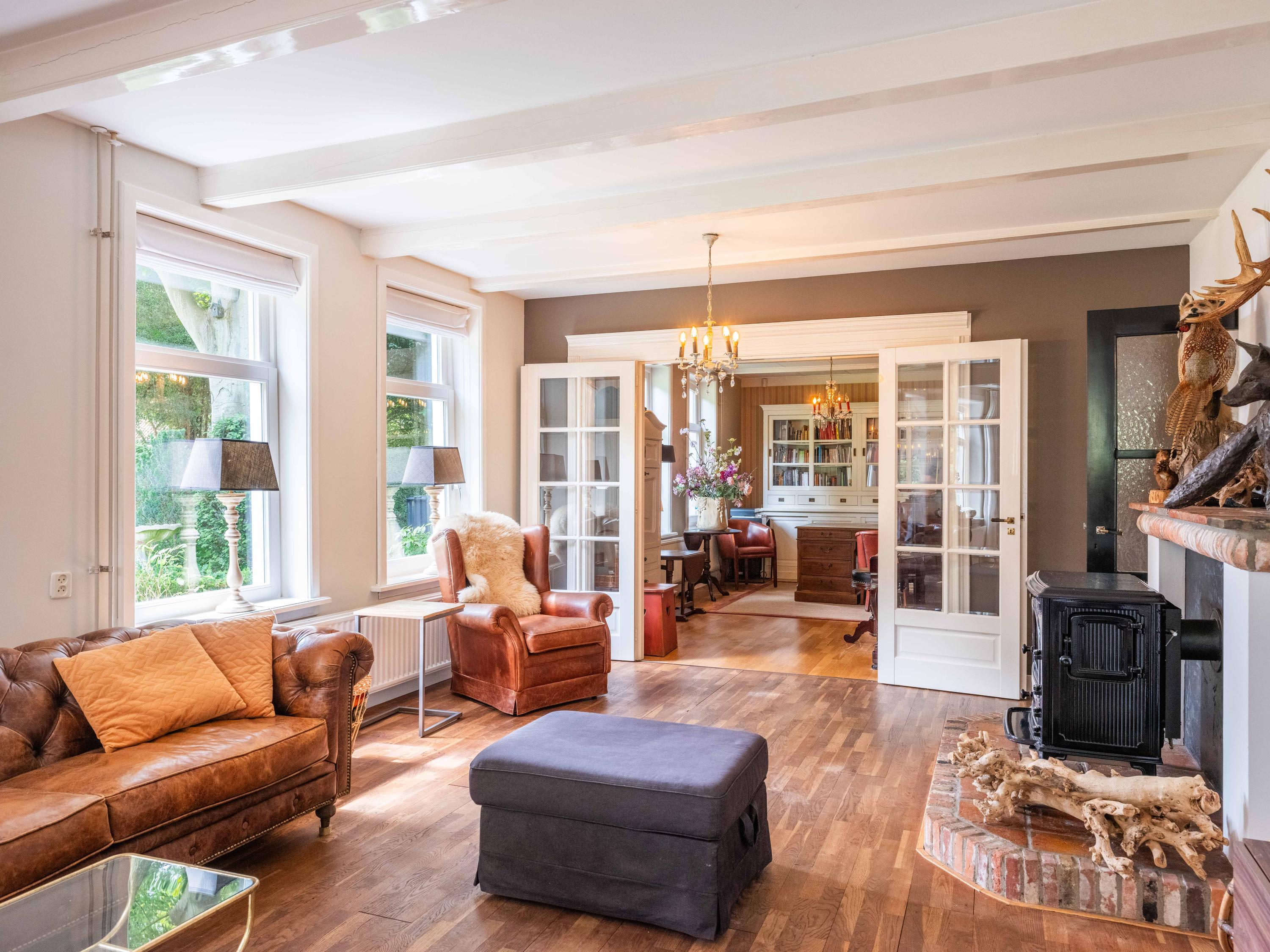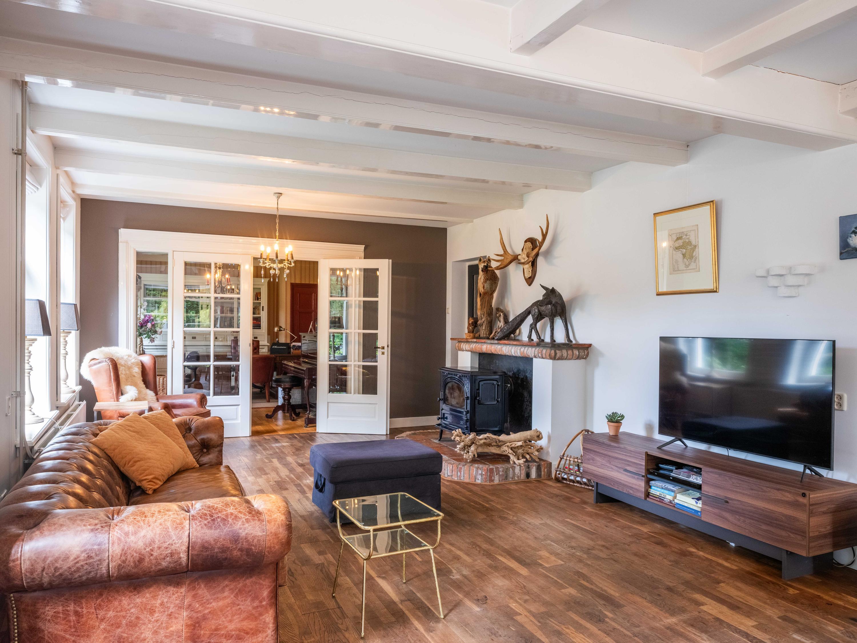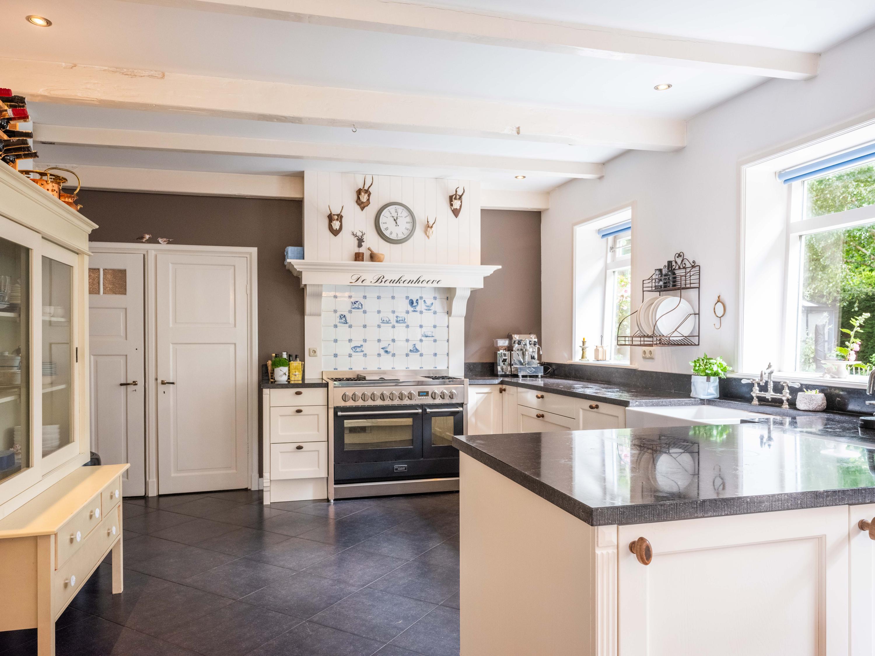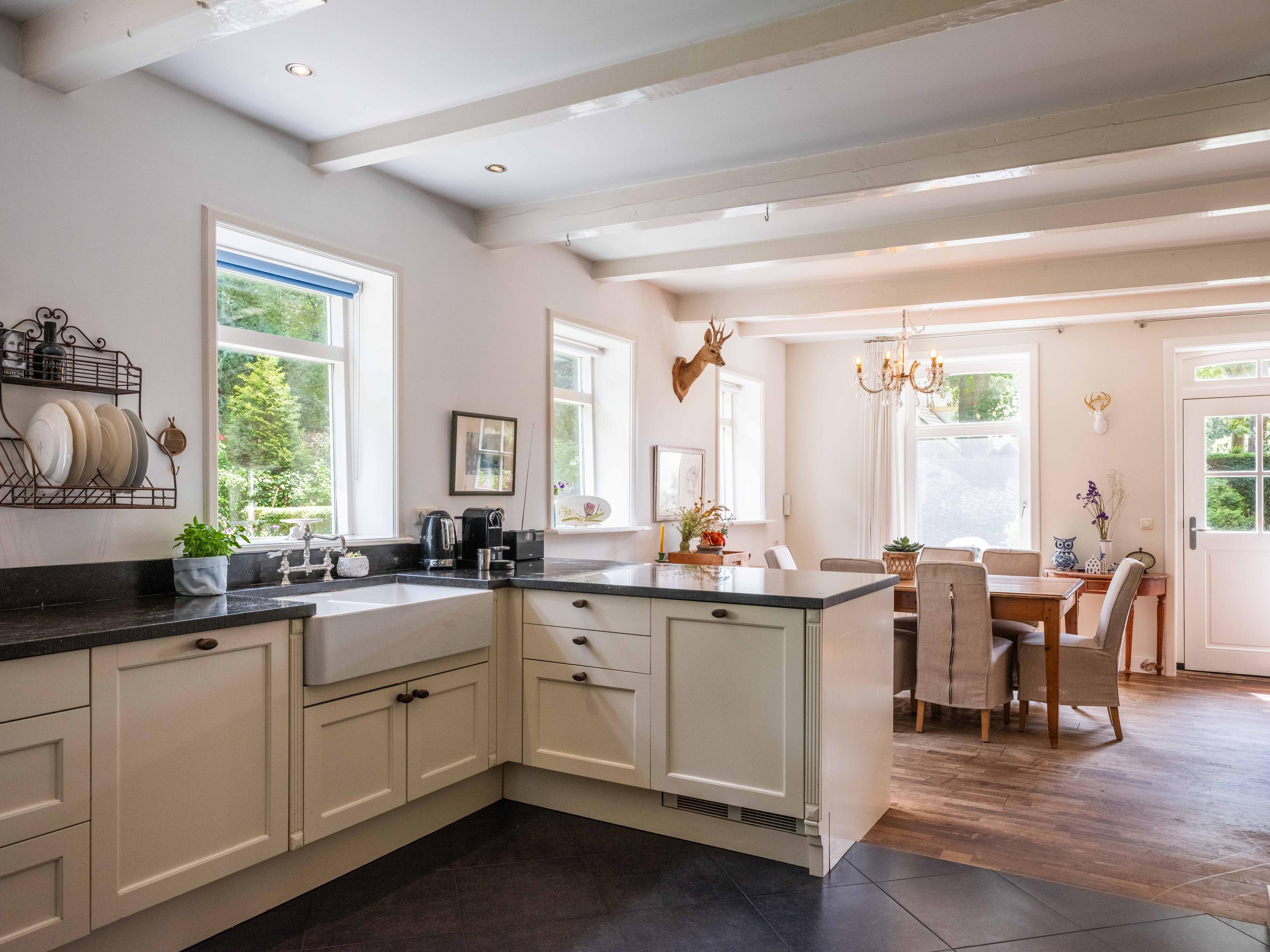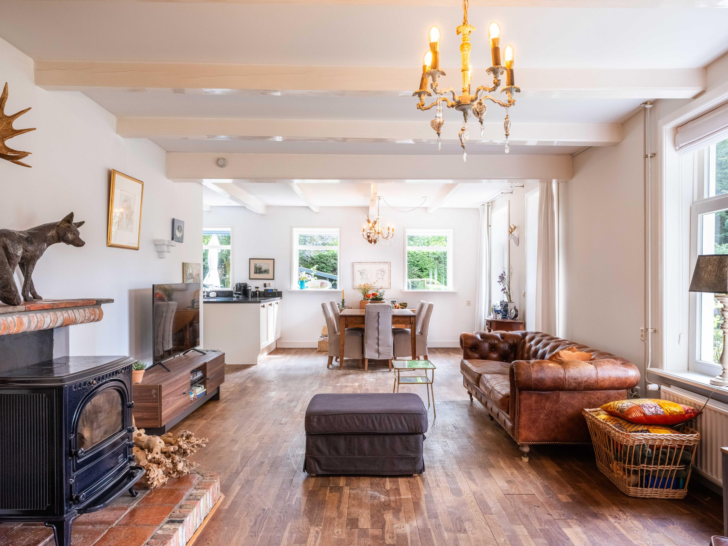 De ruime living van 18 meter lang is licht door de vele raampartijen. Kamer-en-suite deuren delen nu de ruimte in tweeën, waarvan een deel kantoor is. In de woonkamer vinden we een gezellige houtkachel en een deur naar het terras. De ruime landelijke open keuken heeft een opvallende schouw met groot fornuis. Aansluitend aan de keuken vinden we een waskamer met aansluiting voor wasmachine en droger en opbergruimte. Aangrenzend bevind zich een linnenkamer. Er is een bijkeuken met inbouwkasten over de gehele lengte en een keukenblok. De deur gaat naar het tweede terras grenzend aan de woning.