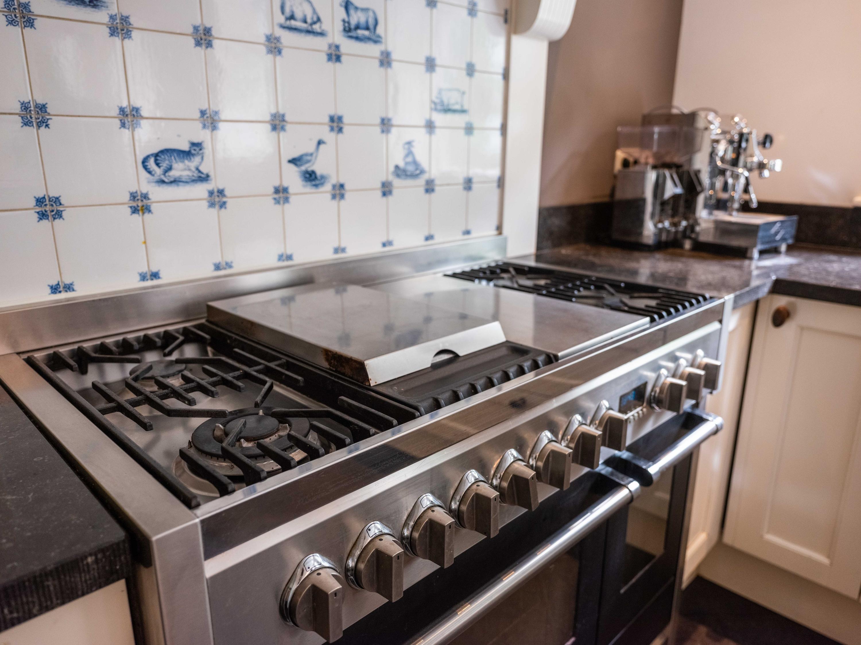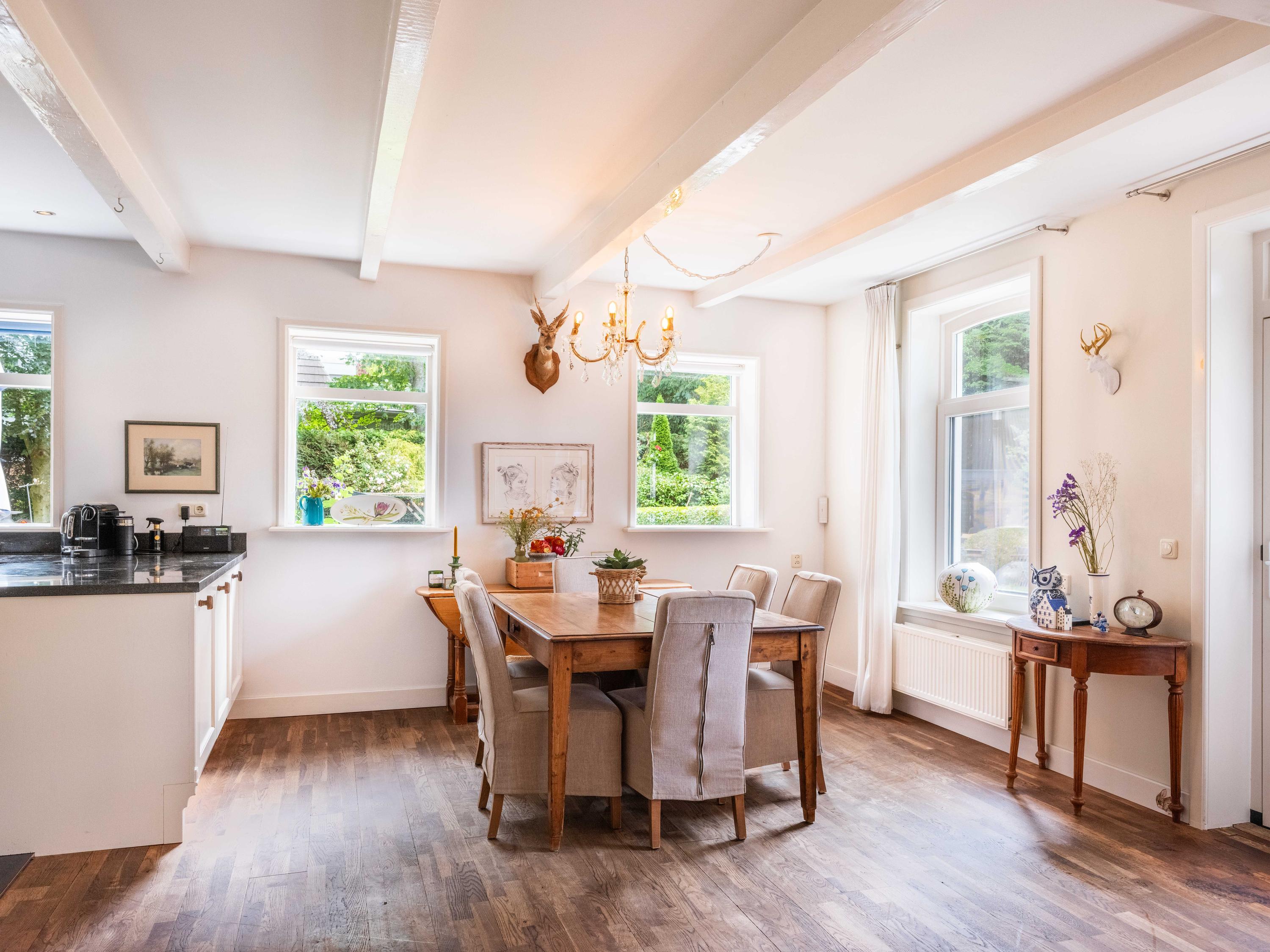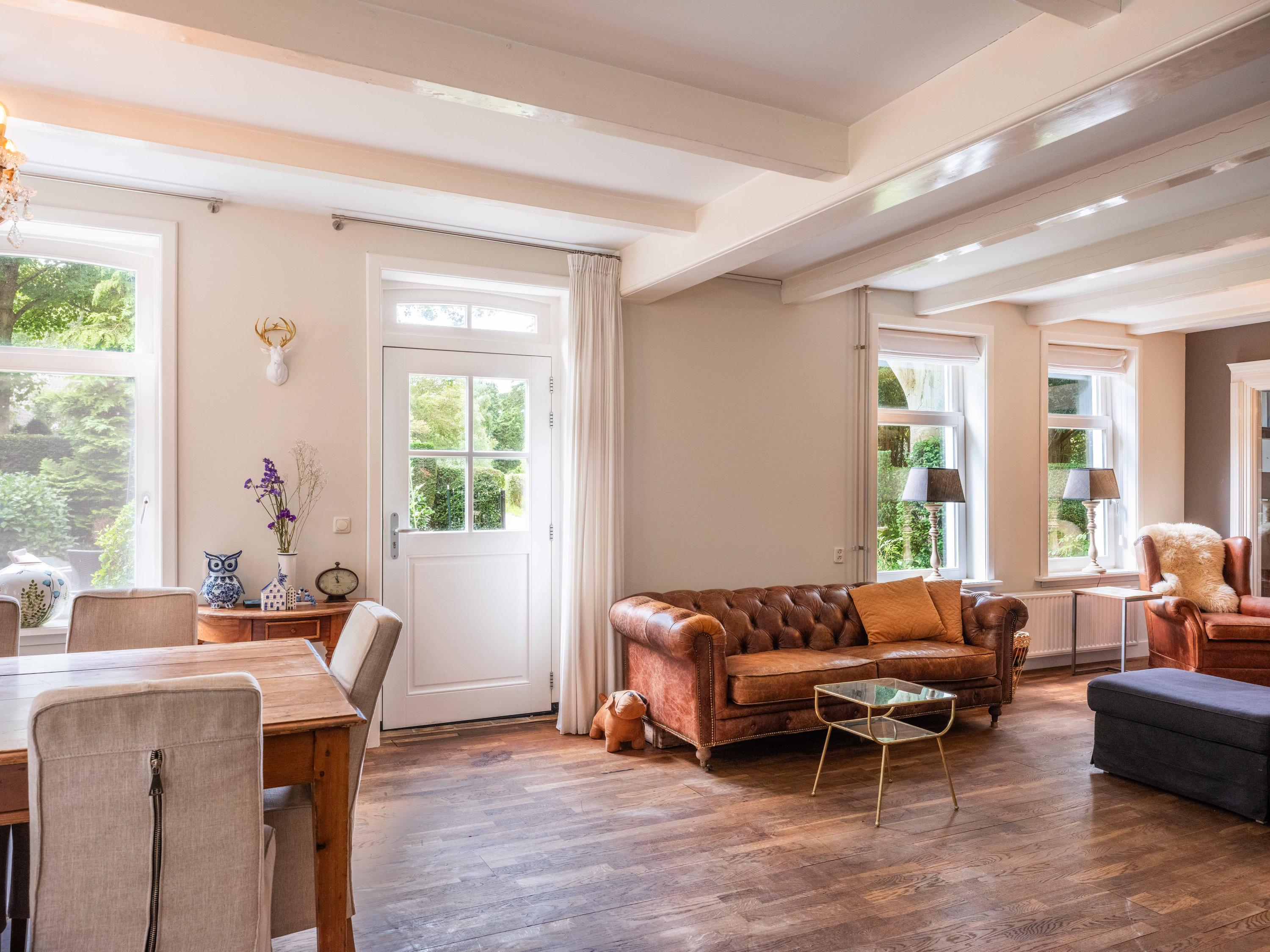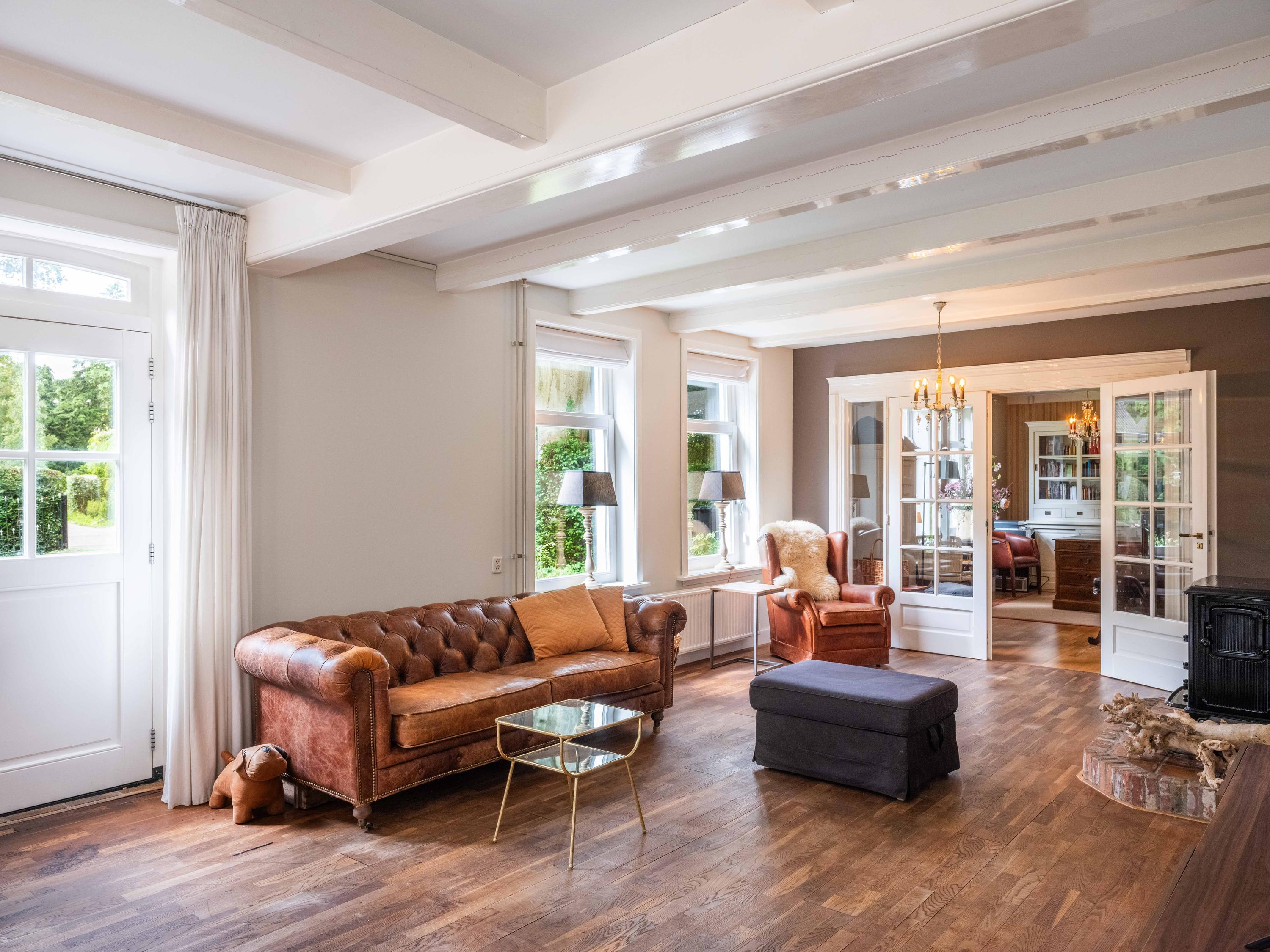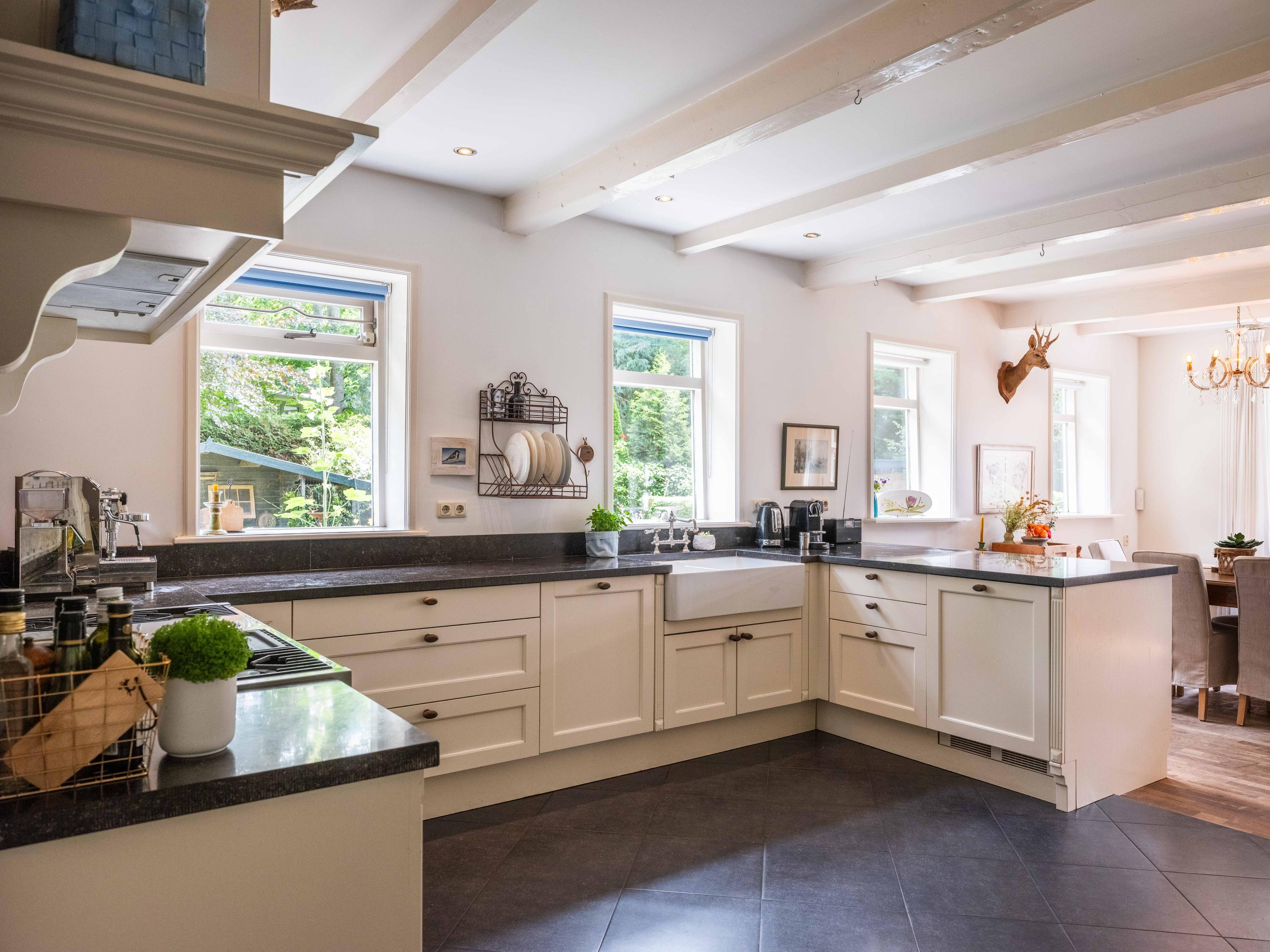 De ruime living van 18 meter lang is licht door de vele raampartijen. Kamer-en-suite deuren delen nu de ruimte in tweeën, waarvan een deel kantoor is. In de woonkamer vinden we een gezellige houtkachel en een deur naar het terras. De ruime landelijke open keuken heeft een opvallende schouw met groot fornuis. Aansluitend aan de keuken vinden we een waskamer met aansluiting voor wasmachine en droger en opbergruimte. Aangrenzend bevind zich een linnenkamer. Er is een bijkeuken met inbouwkasten over de gehele lengte en een keukenblok. De deur gaat naar het tweede terras grenzend aan de woning.