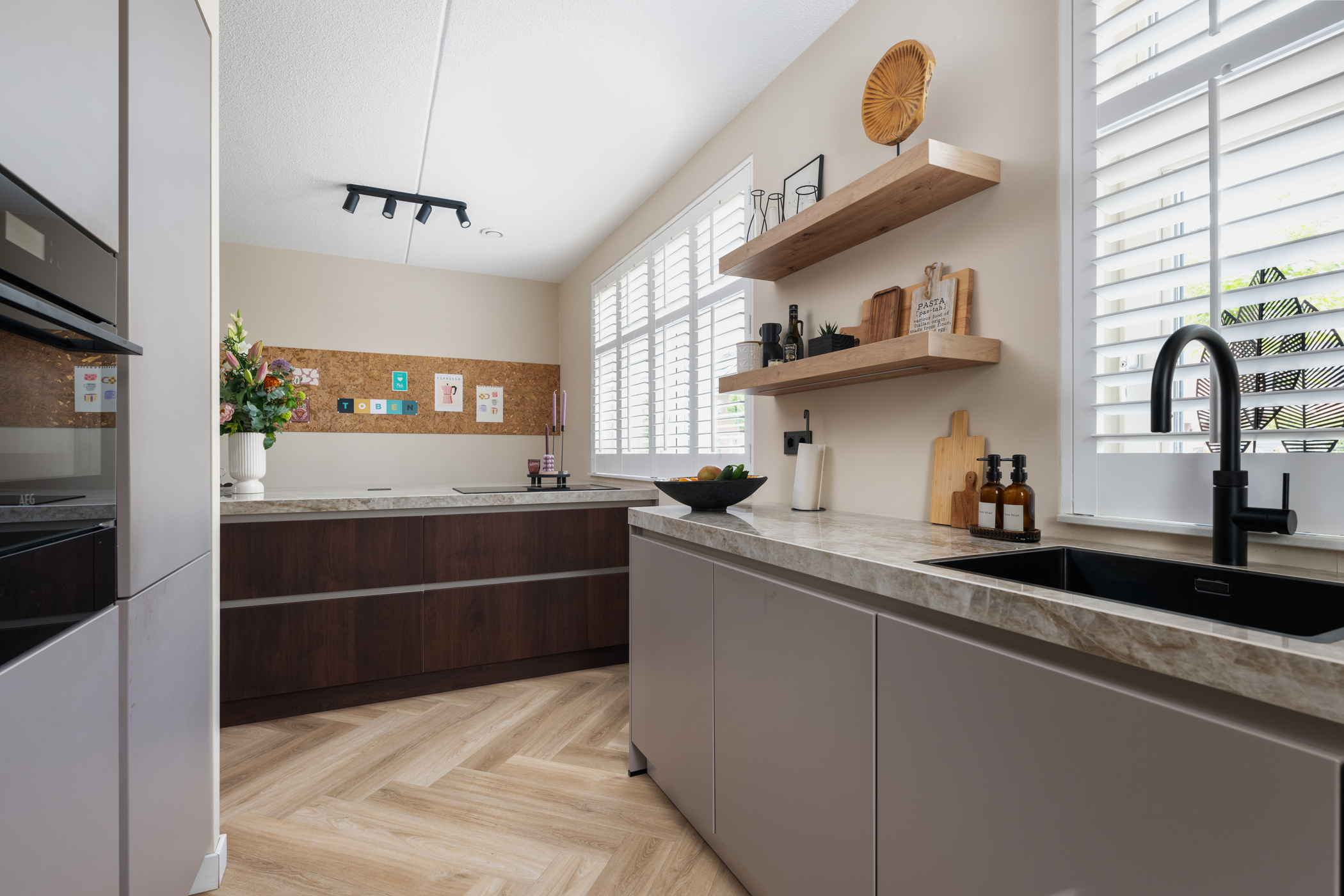 De sfeervolle woonkamer is opvallend licht en ruim opgezet, met het zitgedeelte aan de achterzijde van de woning. Aan de voorzijde vind je de royale leefkeuken met een stijlvol kookeiland, afgewerkt met een luxueus marmeren werkblad. De keuken is volledig uitgerust met hoogwaardige inbouwapparatuur, waaronder een inductiekookplaat met geïntegreerde afzuiging, oven, combi-magnetron, warmhoudlade, Quooker, koel-vriescombinatie en een vaatwasser.