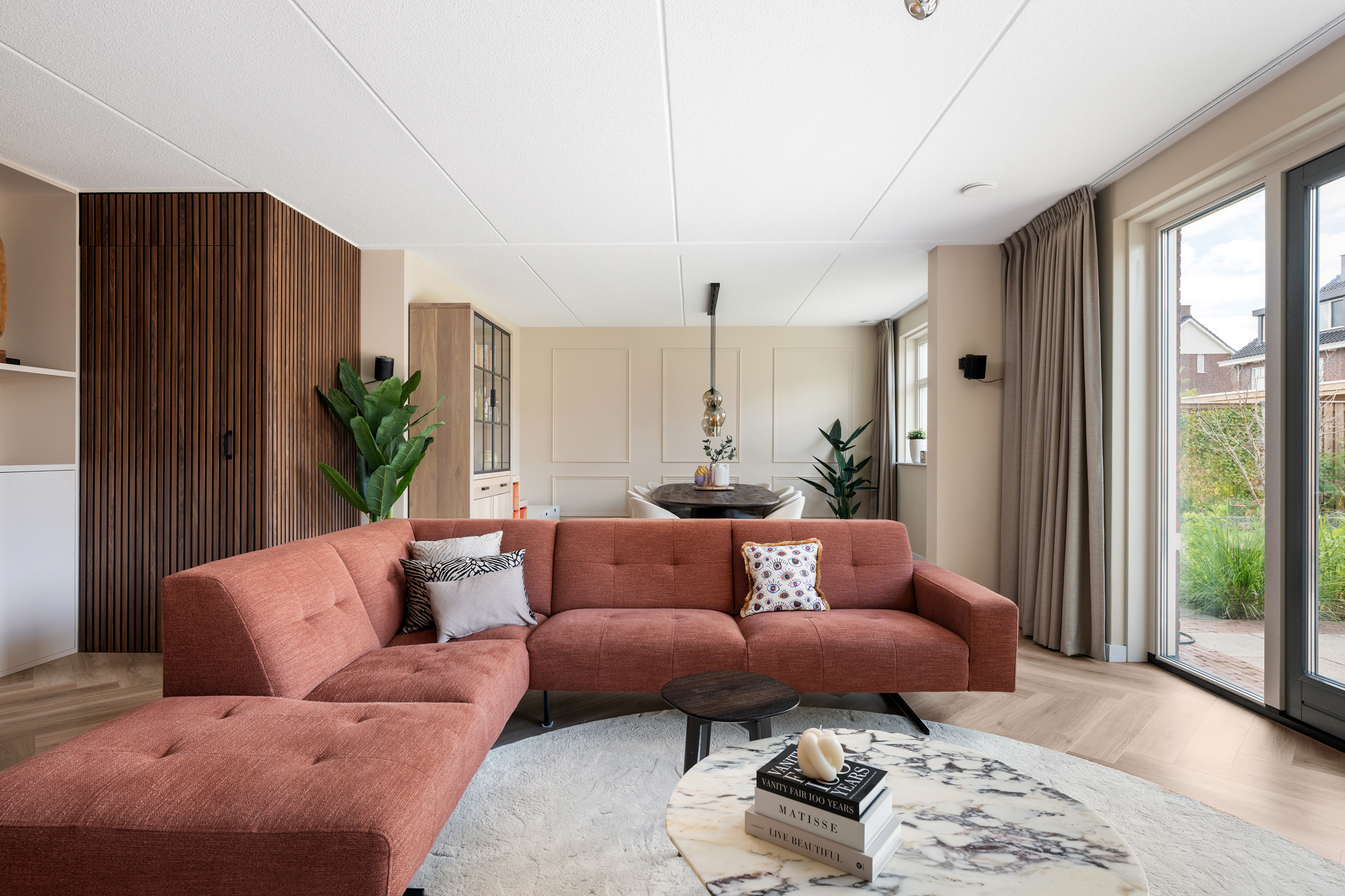 Wat deze leefruimte extra bijzonder maakt, zijn de elegante koperkleurige stalen schuifdeuren die de woonkamer en keuken op subtiele en stijlvolle wijze van elkaar scheiden. Ze zorgen voor een speelse indeling, zonder het gevoel van ruimte en licht te verliezen.