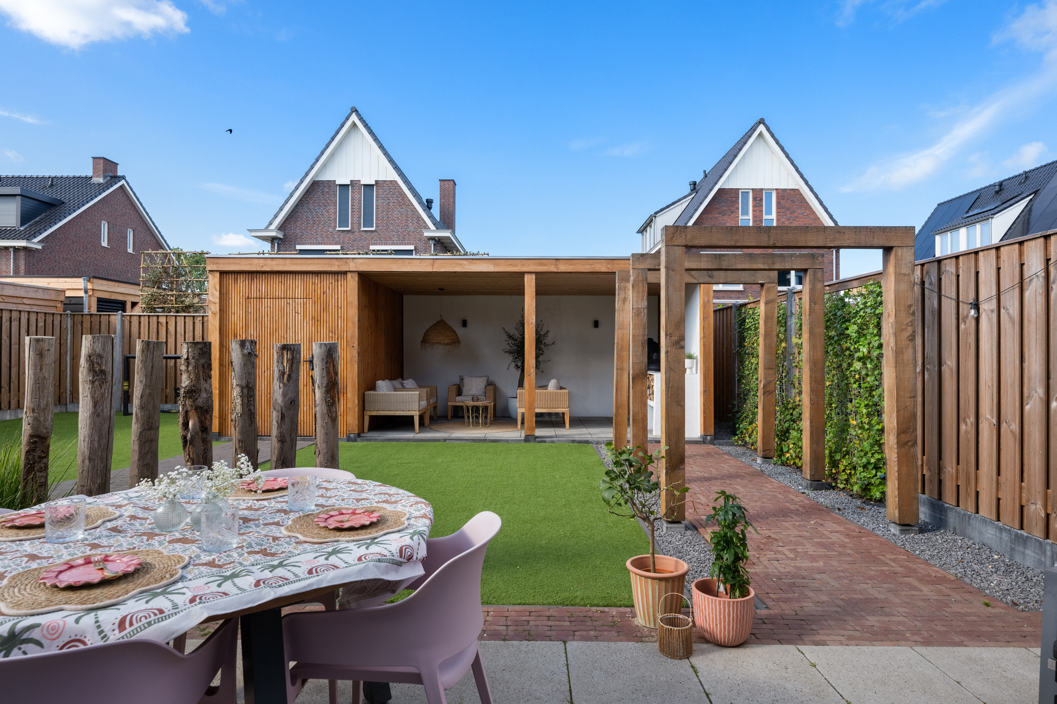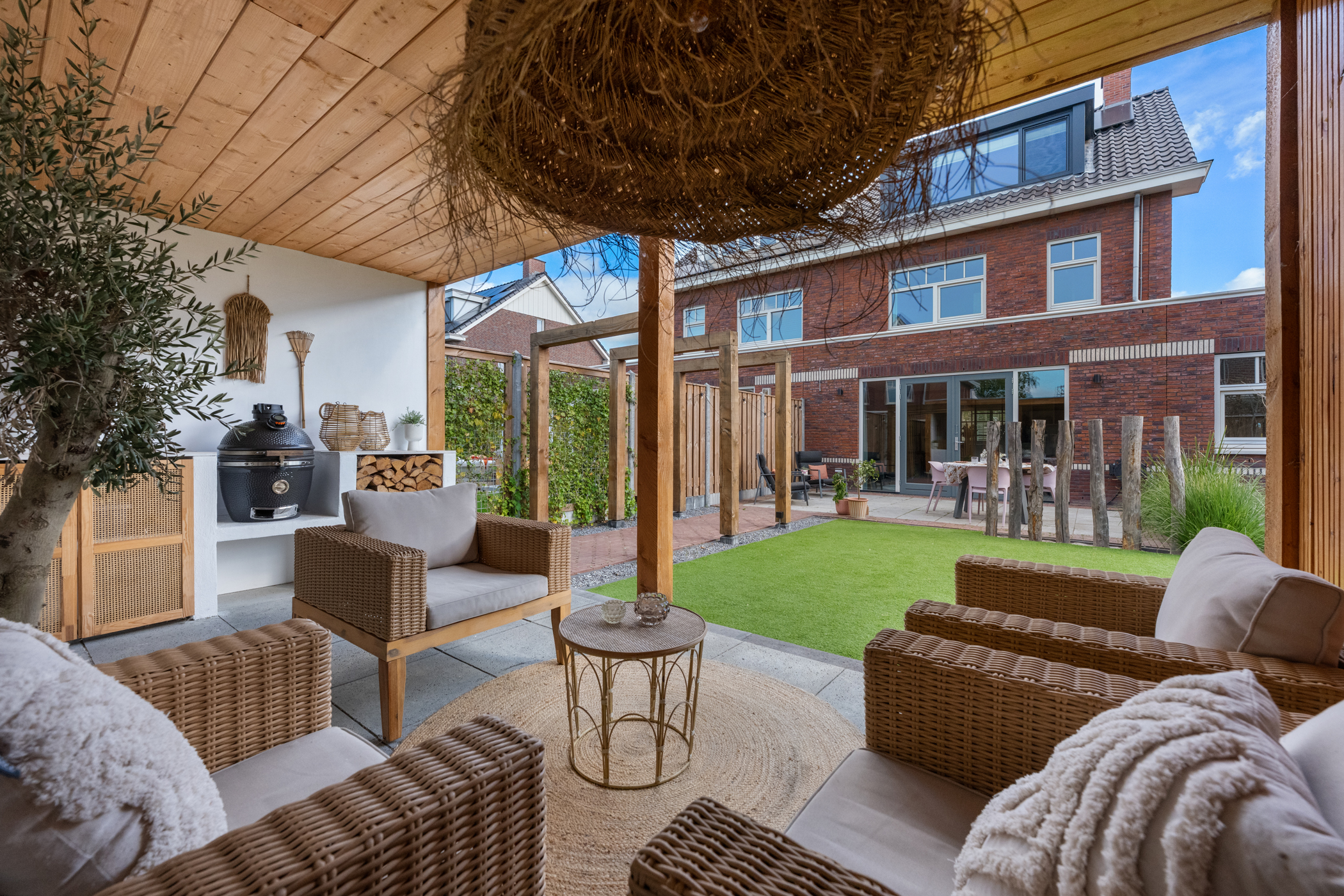 Via openslaande deuren stap je de fraai aangelegde achtertuin in, een oase van rust en privacy. Dankzij de gunstige ligging kun je hier op elk moment van de dag genieten van zowel zon als schaduw. De tuin is voorzien van een professioneel aangelegd drainagesysteem, waardoor ook na een regenbui alles netjes en droog blijft.