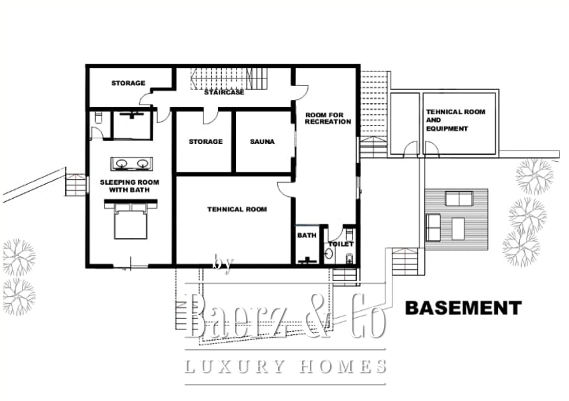 Basement: a bedroom with a bath, 2 storage rooms, a sauna, a bathroom and a recreational room