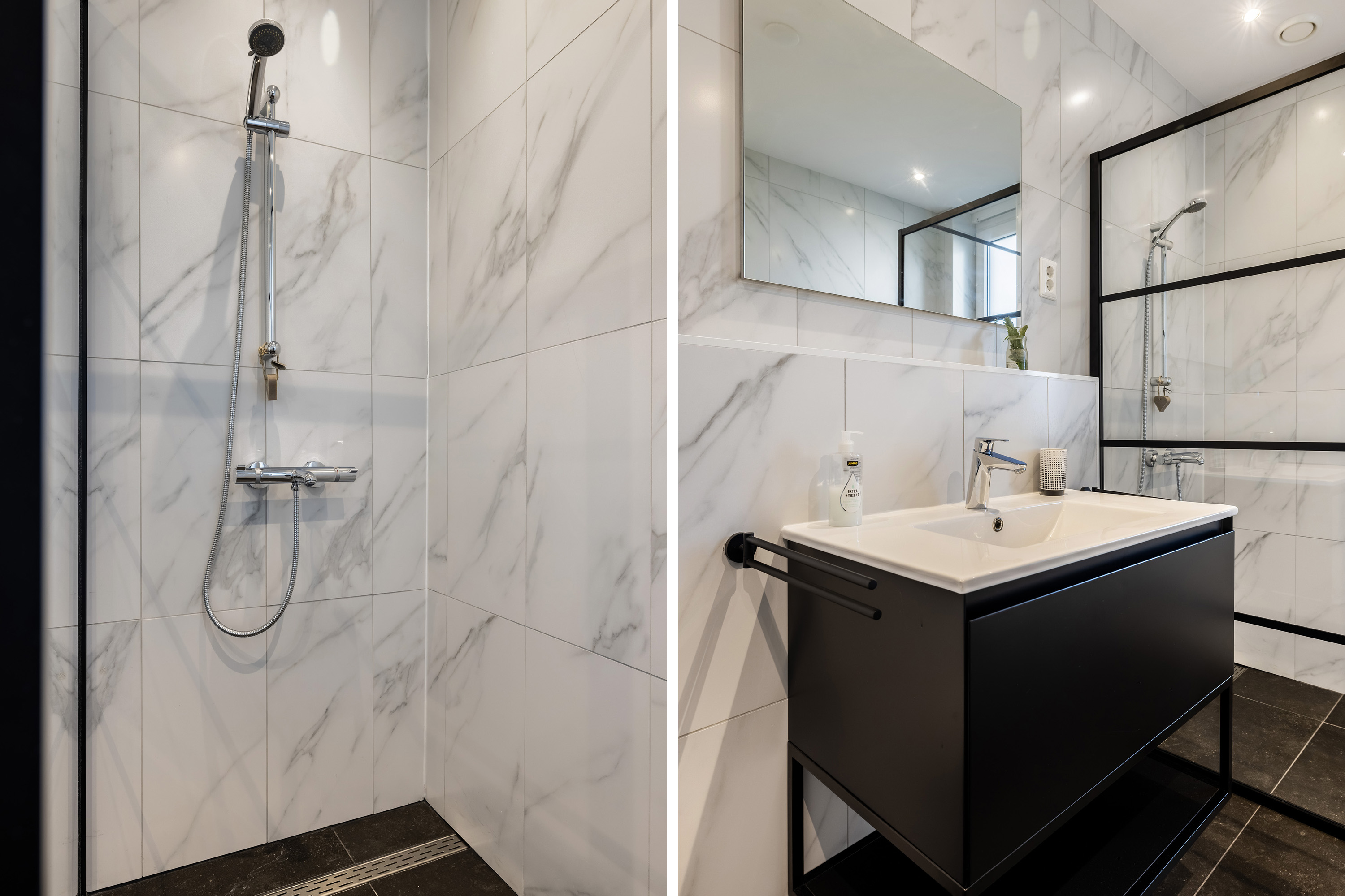 De fraaie badkamer is geheel betegeld en voorzien van een inloopdouche (met thermostaatkraan), een zwevend closet, een wastafelmeubel en een verlaagd plafond met inbouwverlichting.