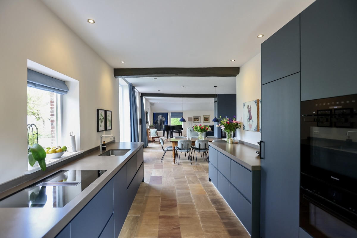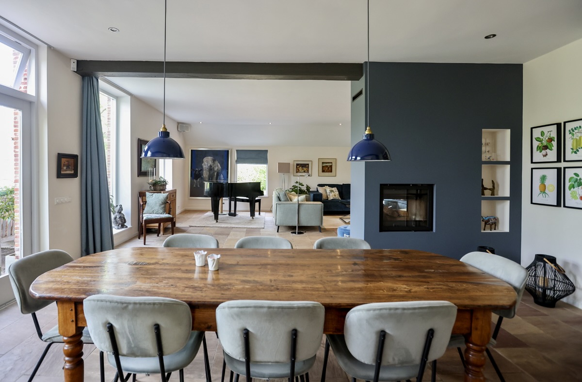 Loop je verder, dan opent zich aan de achterkant van de woning een verrassend ruime en lichte woonkamer, waar een open haard voor gezellige winteravonden zorgt. De kamer grenst naadloos aan het eetgedeelte en een moderne open keuken voorzien van Miele inbouwapparatuur– samen vormen ze het hart van het huis, met uitzicht op de diepe tuin en daarachter het weidse landschap. Geen schilderij kan hieraan tippen. De naastgelegen bijkeuken zorgt voor extra opslag en praktisch gemak.