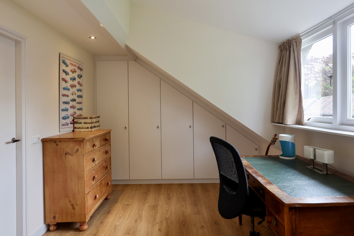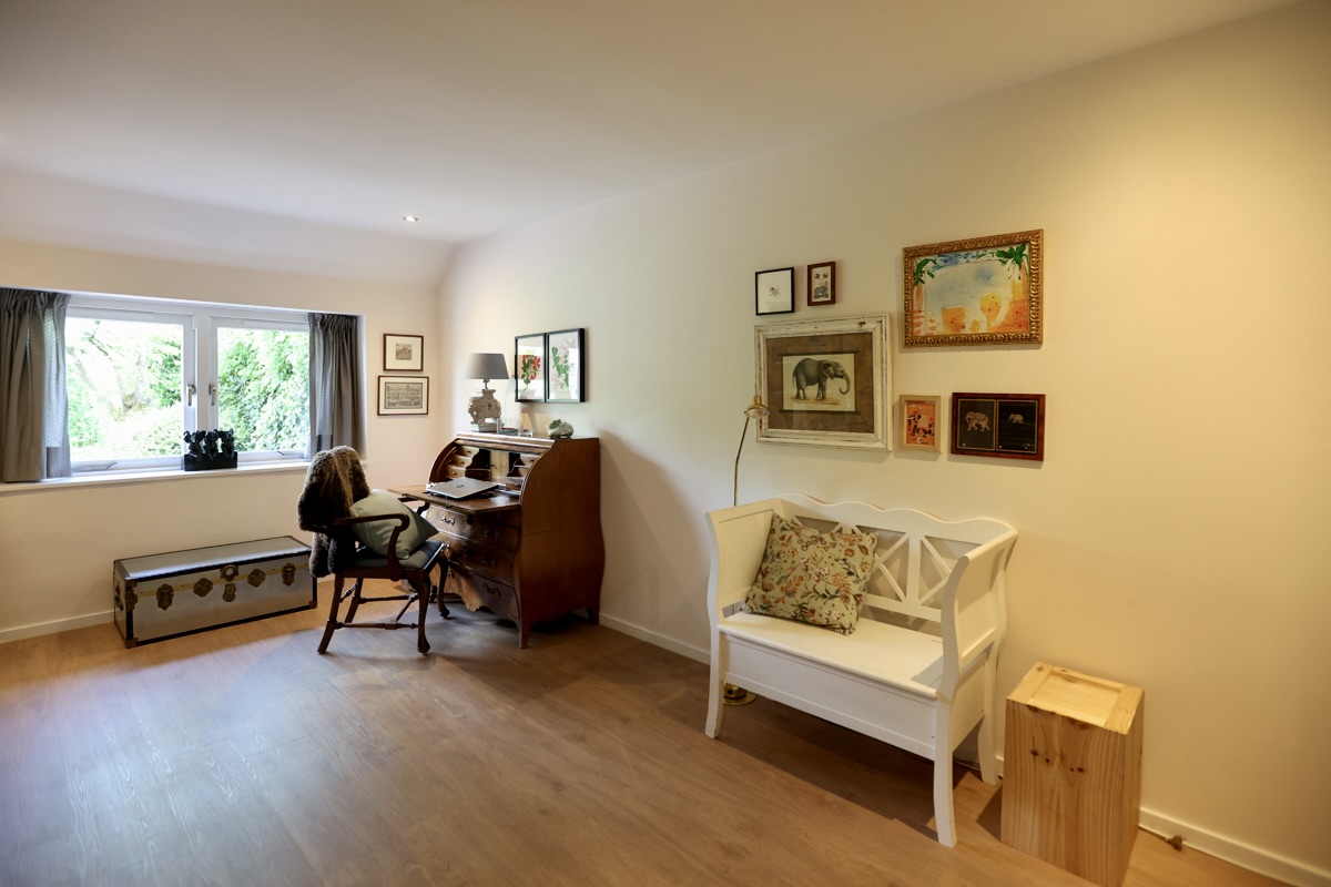Binnen word je verwelkomd in een ruime hal waar direct het gevoel van huiselijkheid je tegemoetkomt. Aan de voorzijde bevindt zich een sfeervolle werkkamer, ideaal voor wie graag in alle rust thuis werkt – of simpelweg een goed boek wil lezen. Aan dezelfde zijde is er een royale slaapkamer op de begane grond, met een eigen badkamer voorzien van een wastafelmeubel, ligbad, douche en aansluitingen voor wasmachine en droger. Daarnaast is er een separaat toilet.