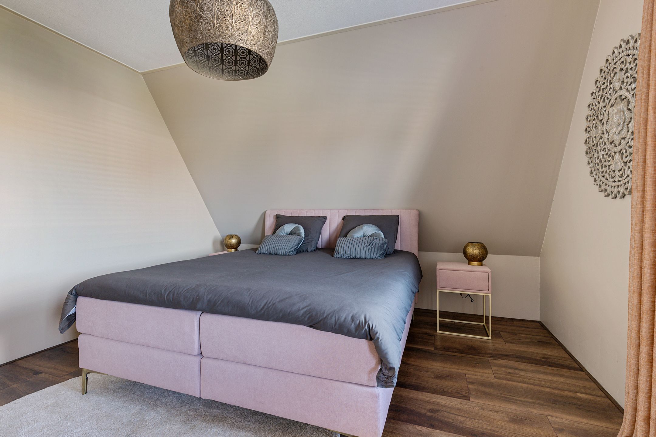 Via de ruime entree bereikt u de hal met stijlvol extra royaal gastentoilet, trapopgang met vide en toegang tot zowel de bijkeuken als de living. De woonkamer is sfeervol gepositioneerd aan de beschutte tuinzijde en vormt samen met de lichte woonkeuken een speelse, open leefruimte. De keuken aan de voorzijde is maatwerk en voorzien van hoogwaardige afwerking en inbouwapparatuur zoals robuuste decton bladen, koffiehoek, vaatwasser, combi heteluchtoven, grote Bora inductie kookplaat met geïntegreerde afzuiging, Quooker, inbouw koel- vriescombinatie, terwijl de woonkamer uitnodigt tot ontspannen in een knusse zithoek. De tuinkamer is een volwaardige uitbreiding van de leefruimte. Dankzij de glazen pui die volledig geopend kan worden, vloeien binnen en buiten naadloos in elkaar over. In de warmere maanden ervaart u een maximale tuinbeleving, terwijl in de koelere seizoenen een behaaglijke loungeplek behouden blijft. De bijkeuken herbergt de warmtepompinstallatie met 190 liter boiler, aansluitingen voor wasapparatuur en een waterontharder. De fluisterstille luchtwarmtepomp is zorgvuldig buiten de woning geplaatst. De gehele begane grond is voorzien van een stijlvolle laminaat-vloer en wordt verwarmd en gekoeld middels vloerverwarming.
