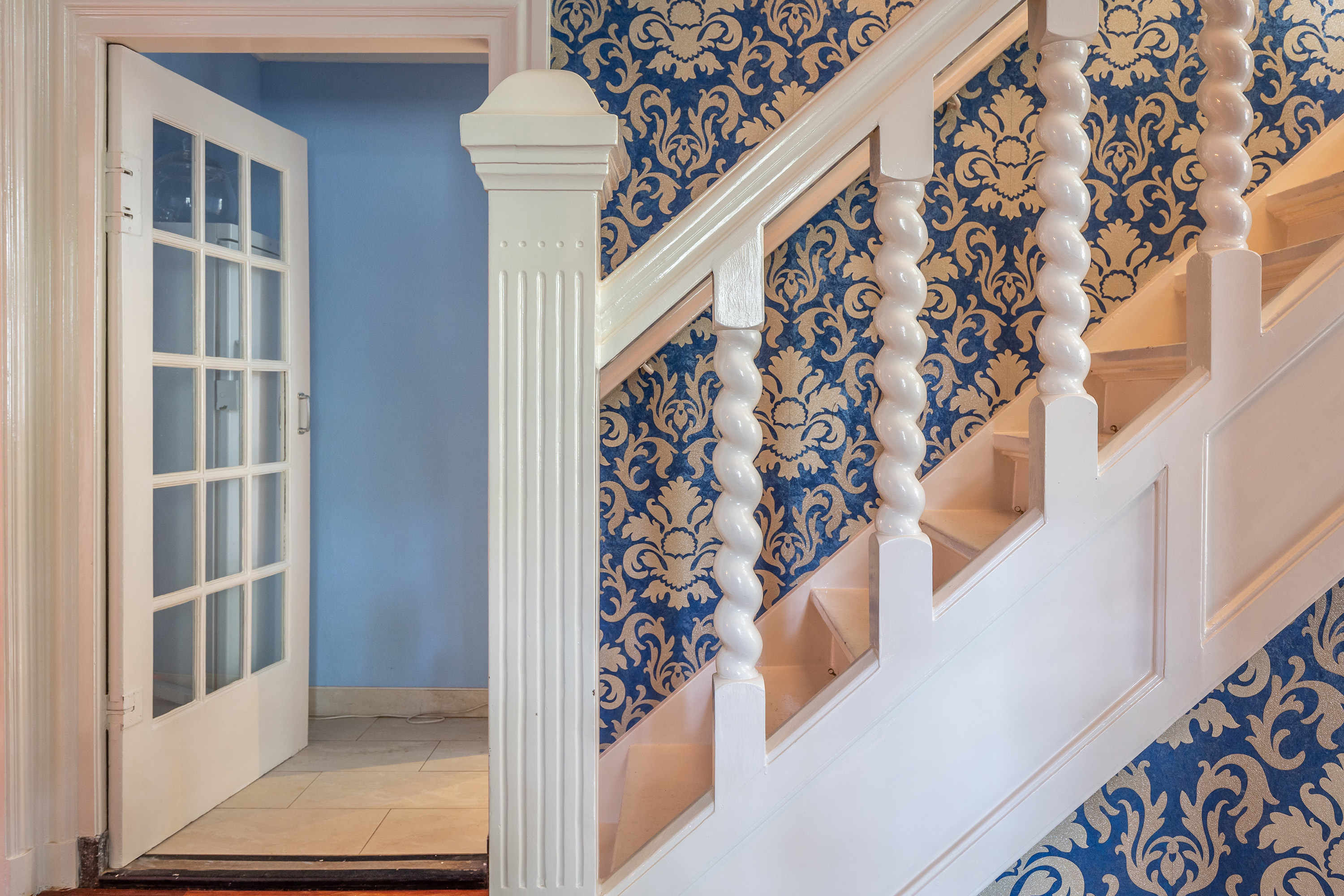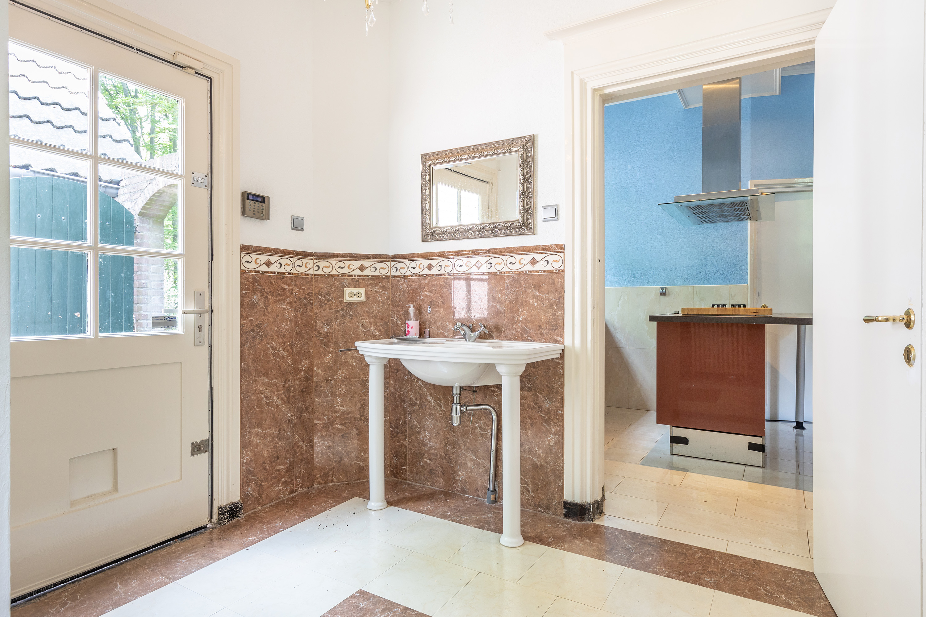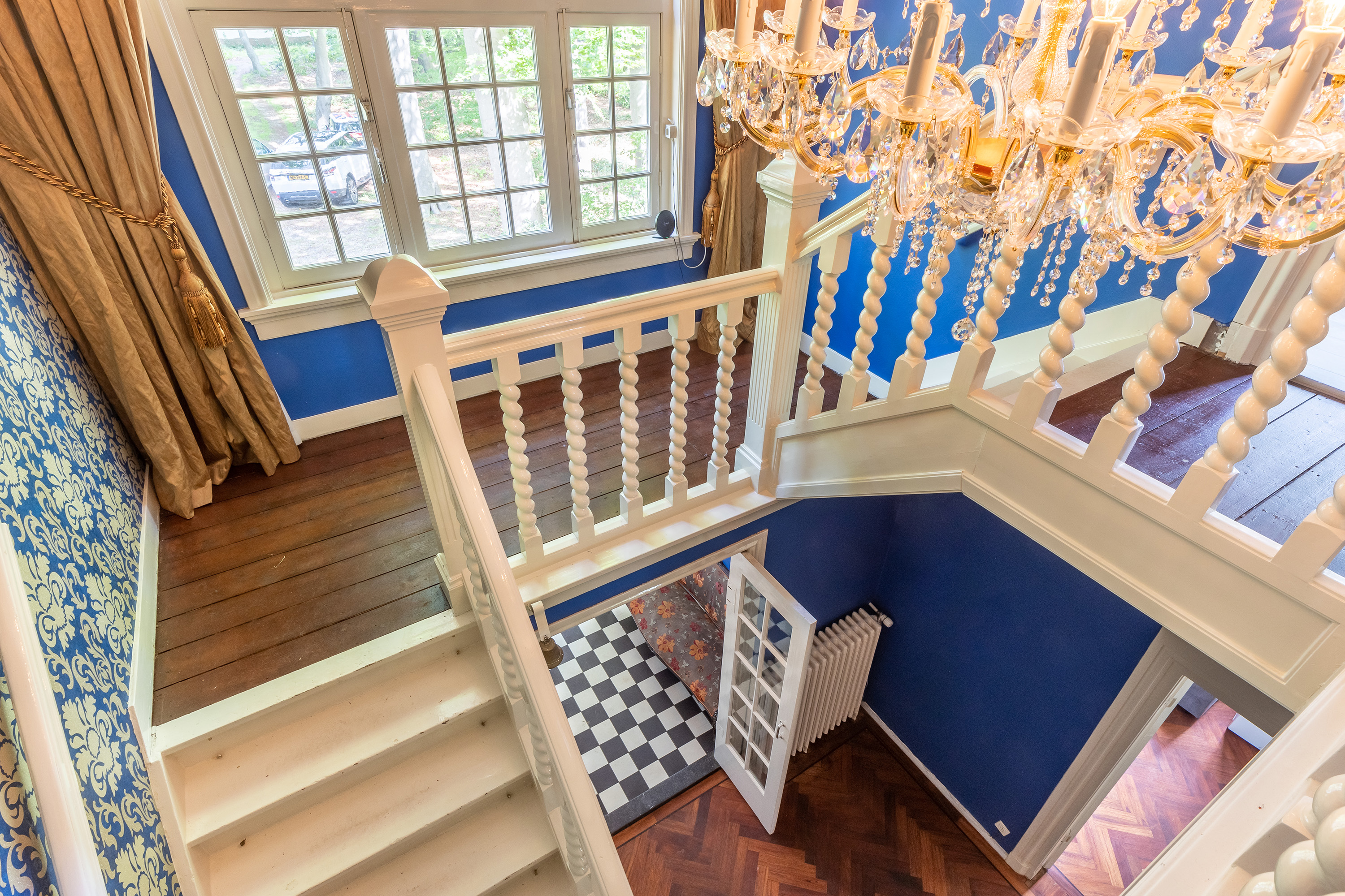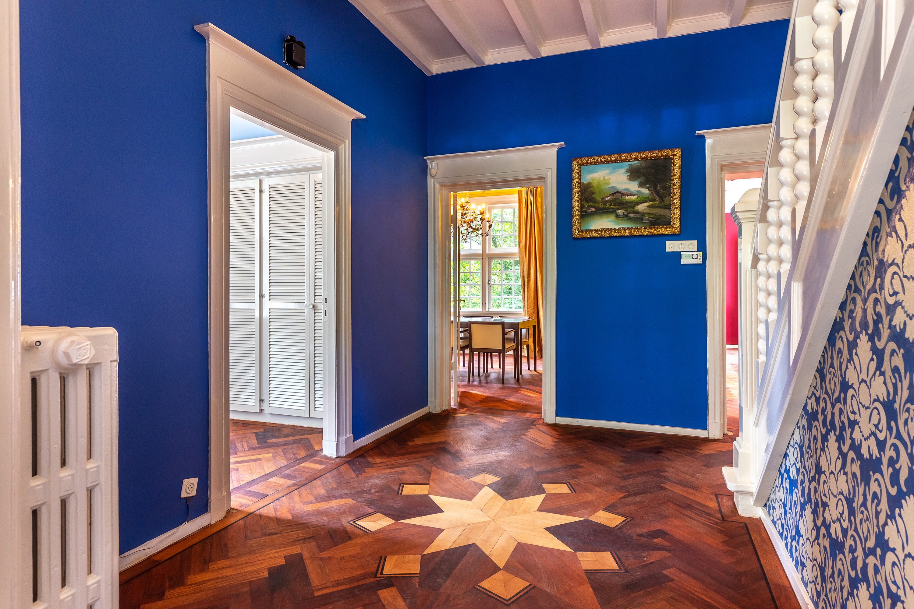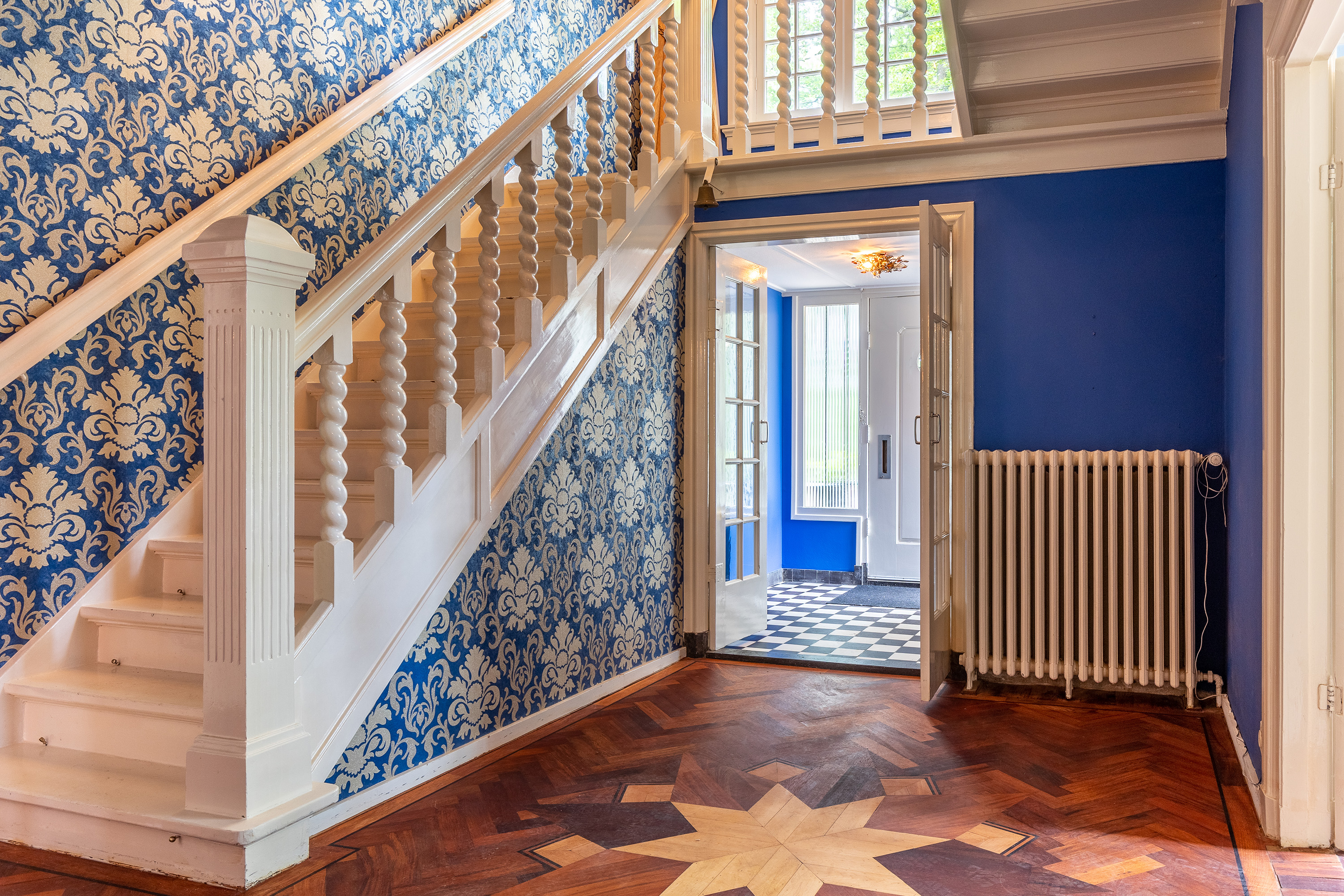 De entree maakt direct indruk met een statige voordeur die toegang geeft tot een klassieke vestibule, afgewerkt met zwart-witte vloertegels en een moderne meterkast met uitgebreide elektrische voorzieningen. Via dubbele deuren betreed je de centrale hal, waar het visgraat parket met randafwerking, het hoge plafond en de stijlvolle trapopgang direct het verfijnde karakter van de woning onderstrepen.