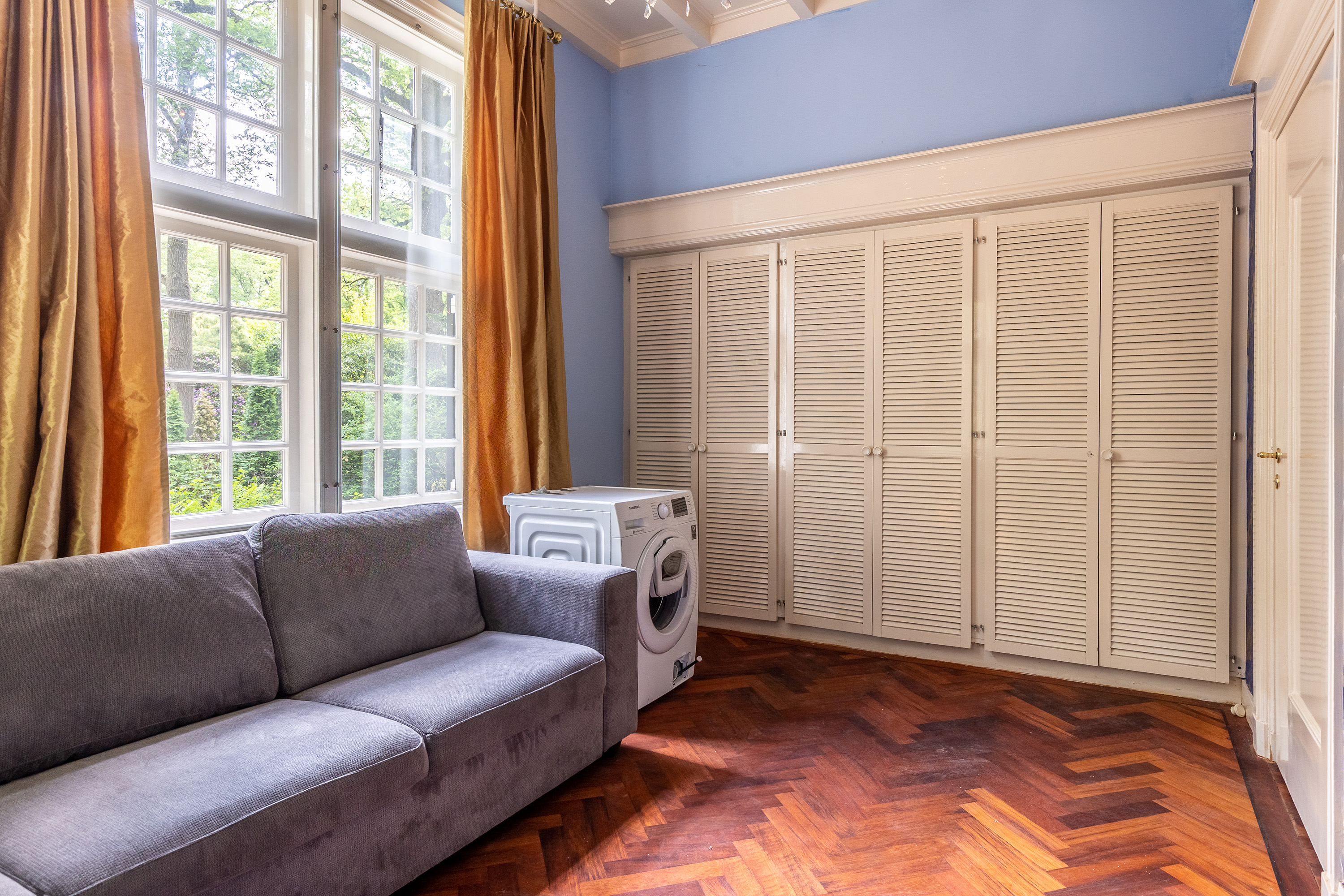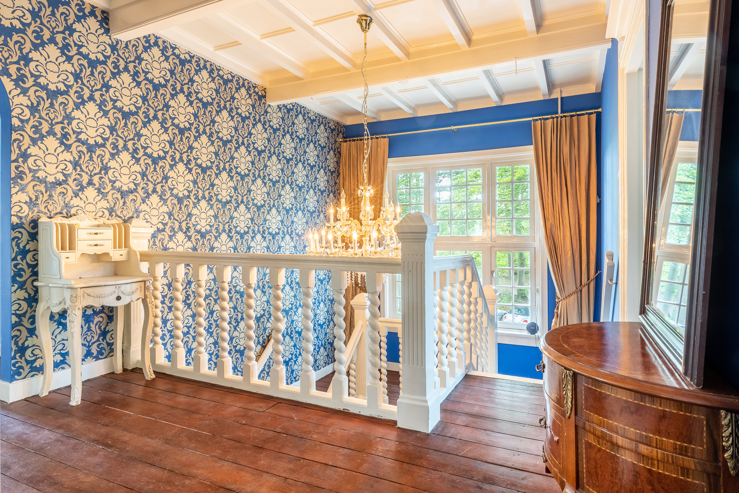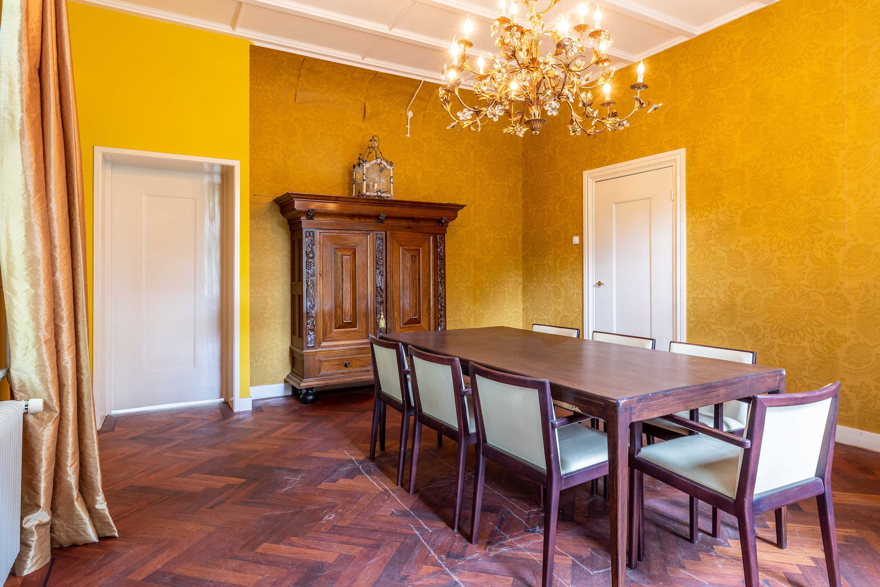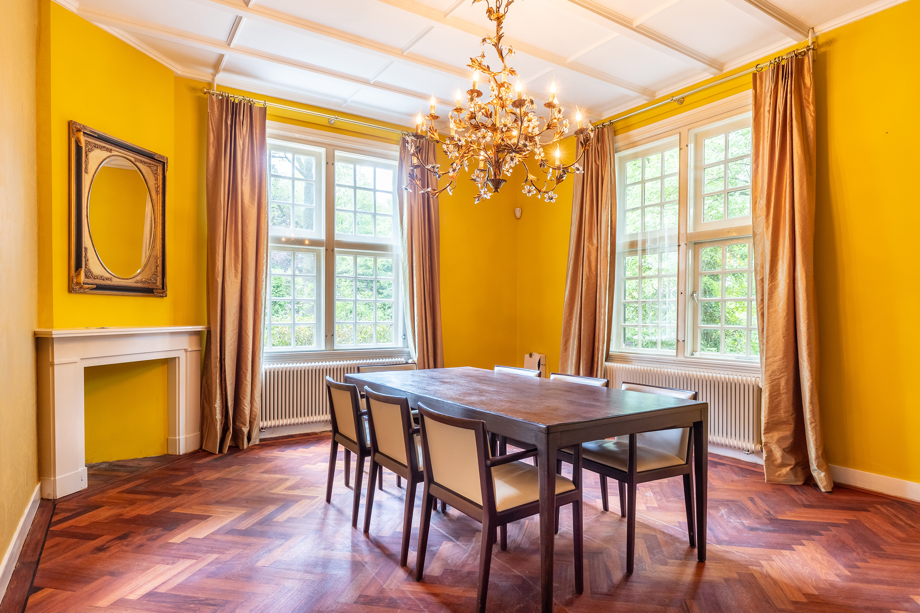 Aan de voorzijde bevindt zich een kantoorkamer met ingebouwde kastenwand en uitzicht op de oprijlaan, perfect voor thuiswerken. De en-suite woonkamer en eetkamer vormen samen het hart van het woongedeelte, met hoge raampartijen, een klassieke marmeren schouw en openslaande deuren naar het terras. De sfeer is warm en uitnodigend, met volop ruimte voor verschillende indelingsmogelijkheden.