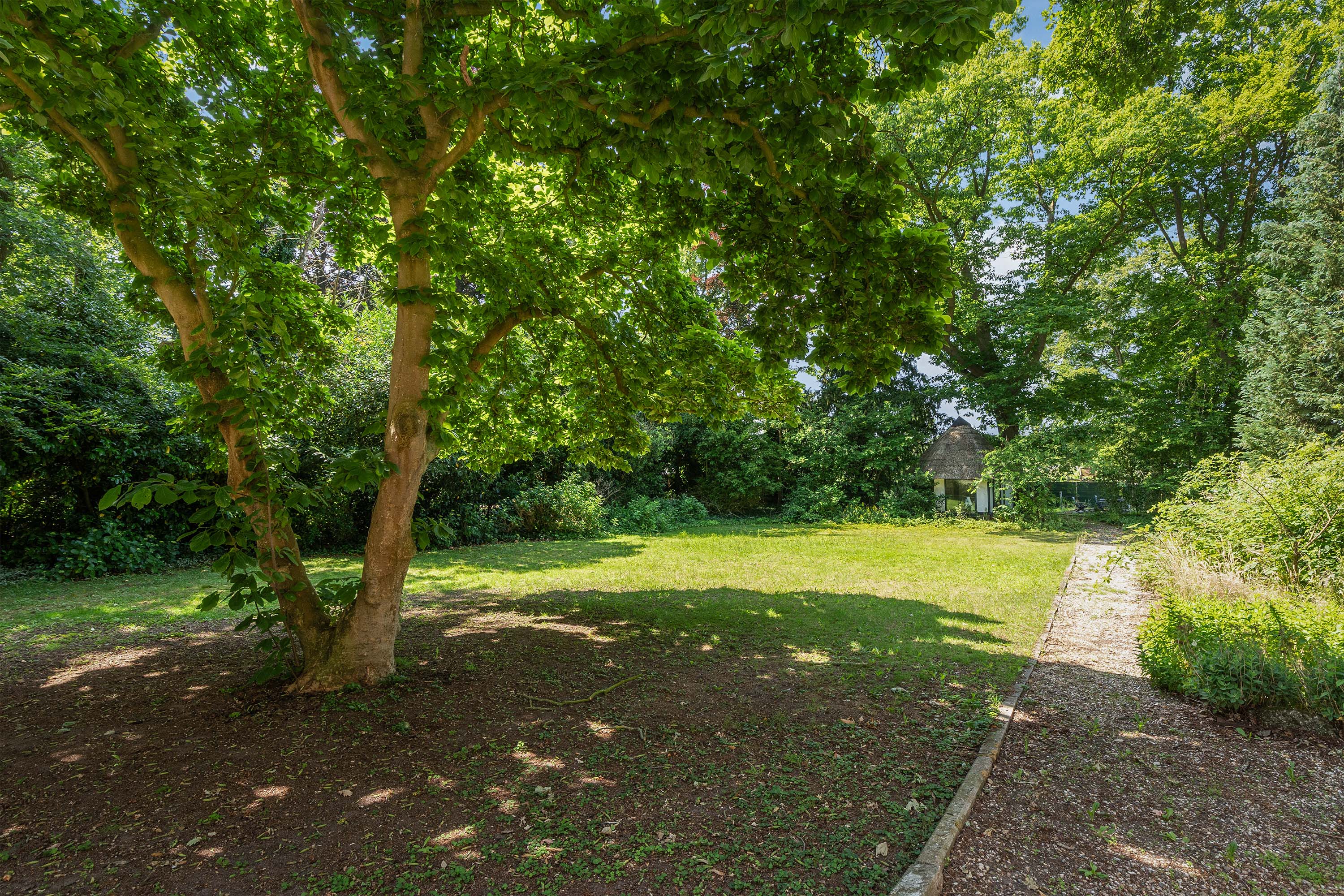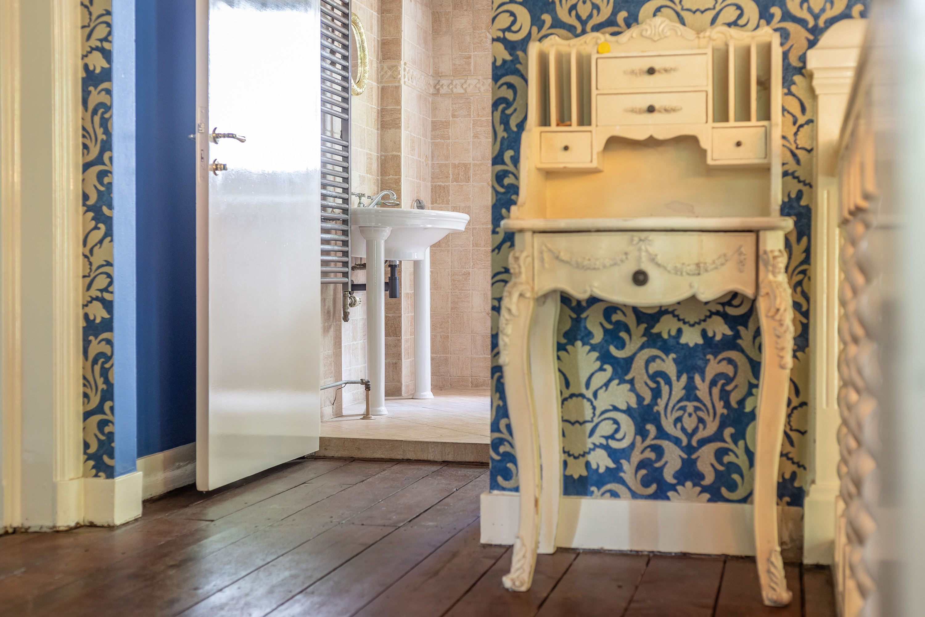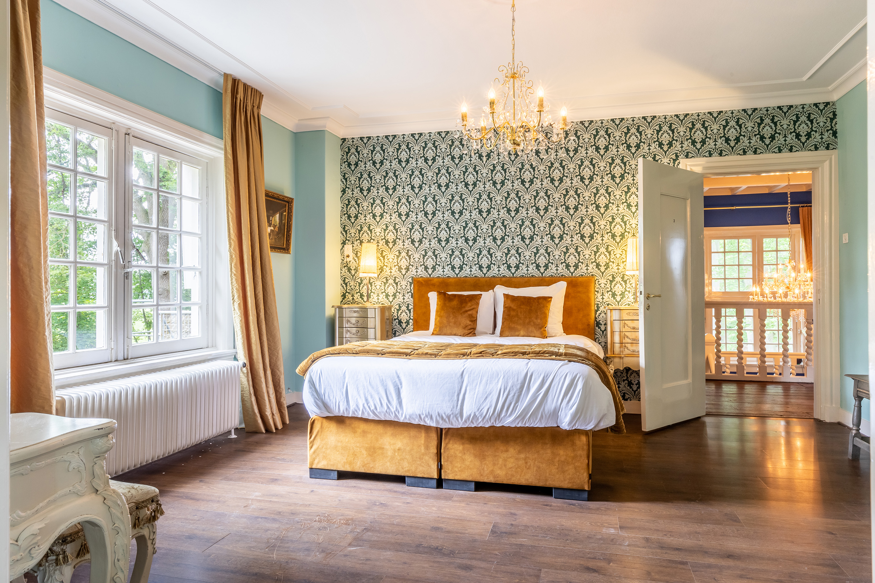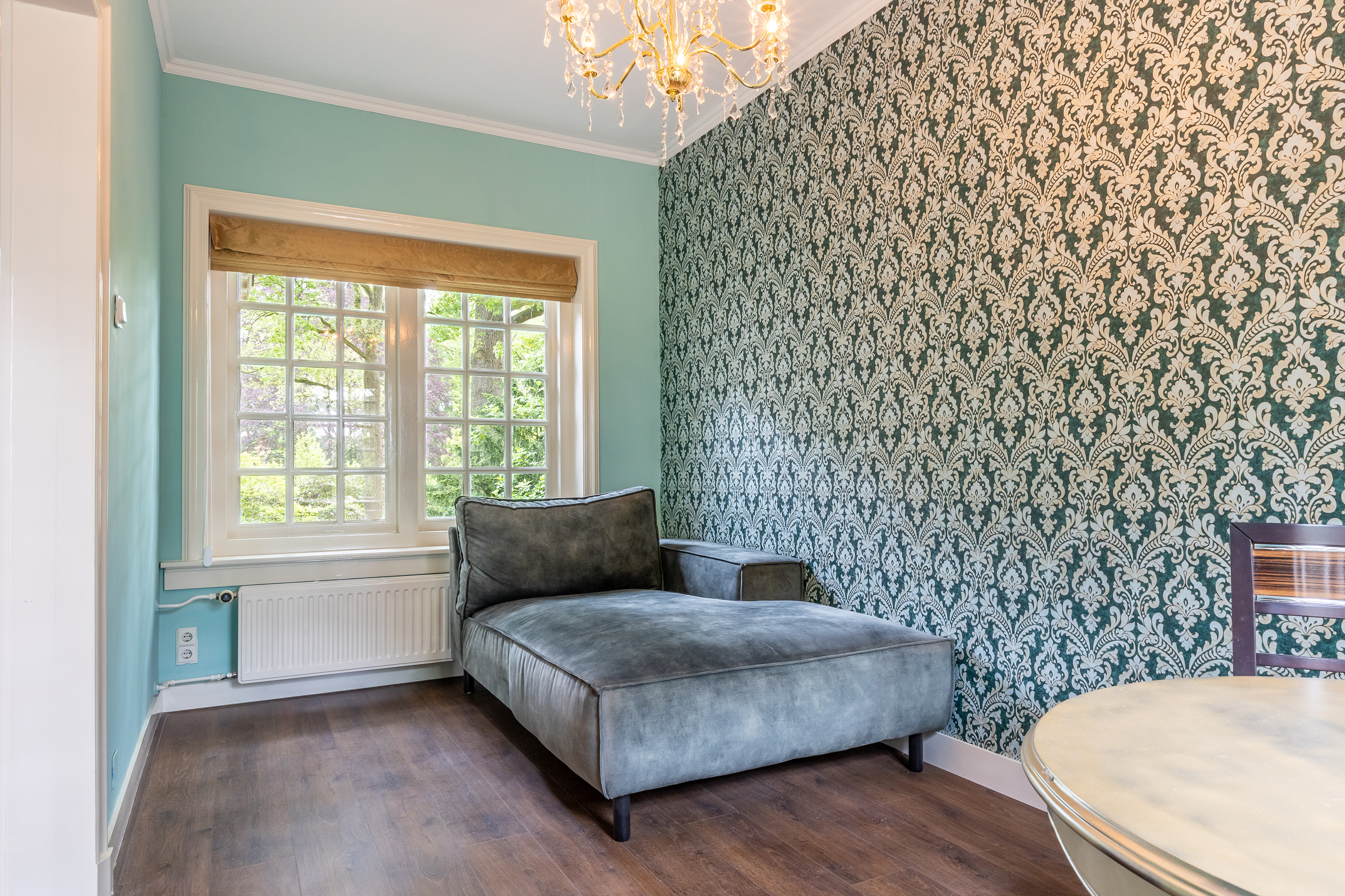 Aan de voorzijde bevindt zich een kantoorkamer met ingebouwde kastenwand en uitzicht op de oprijlaan, perfect voor thuiswerken. De en-suite woonkamer en eetkamer vormen samen het hart van het woongedeelte, met hoge raampartijen, een klassieke marmeren schouw en openslaande deuren naar het terras. De sfeer is warm en uitnodigend, met volop ruimte voor verschillende indelingsmogelijkheden.