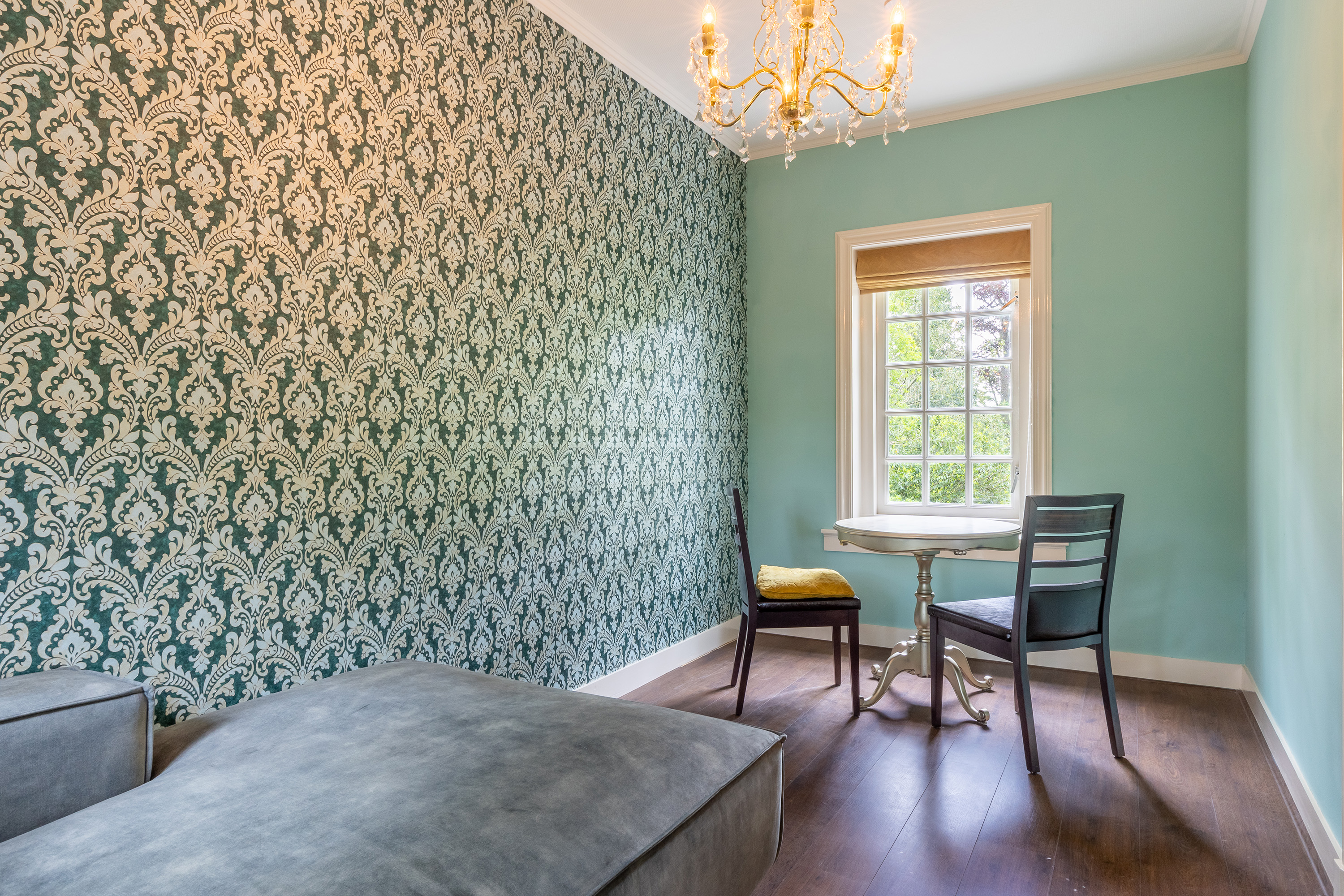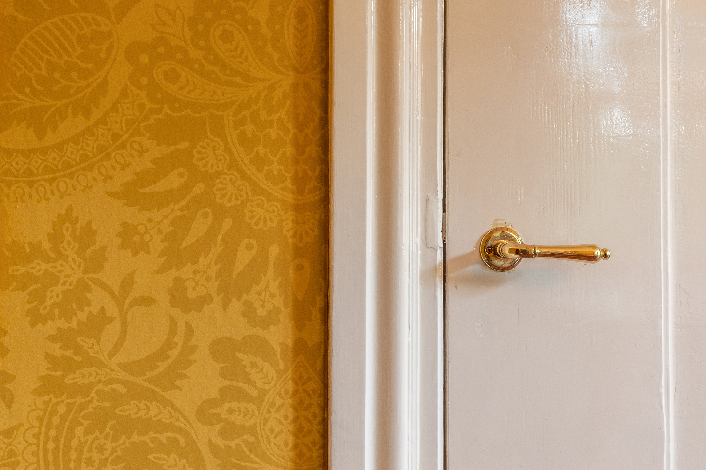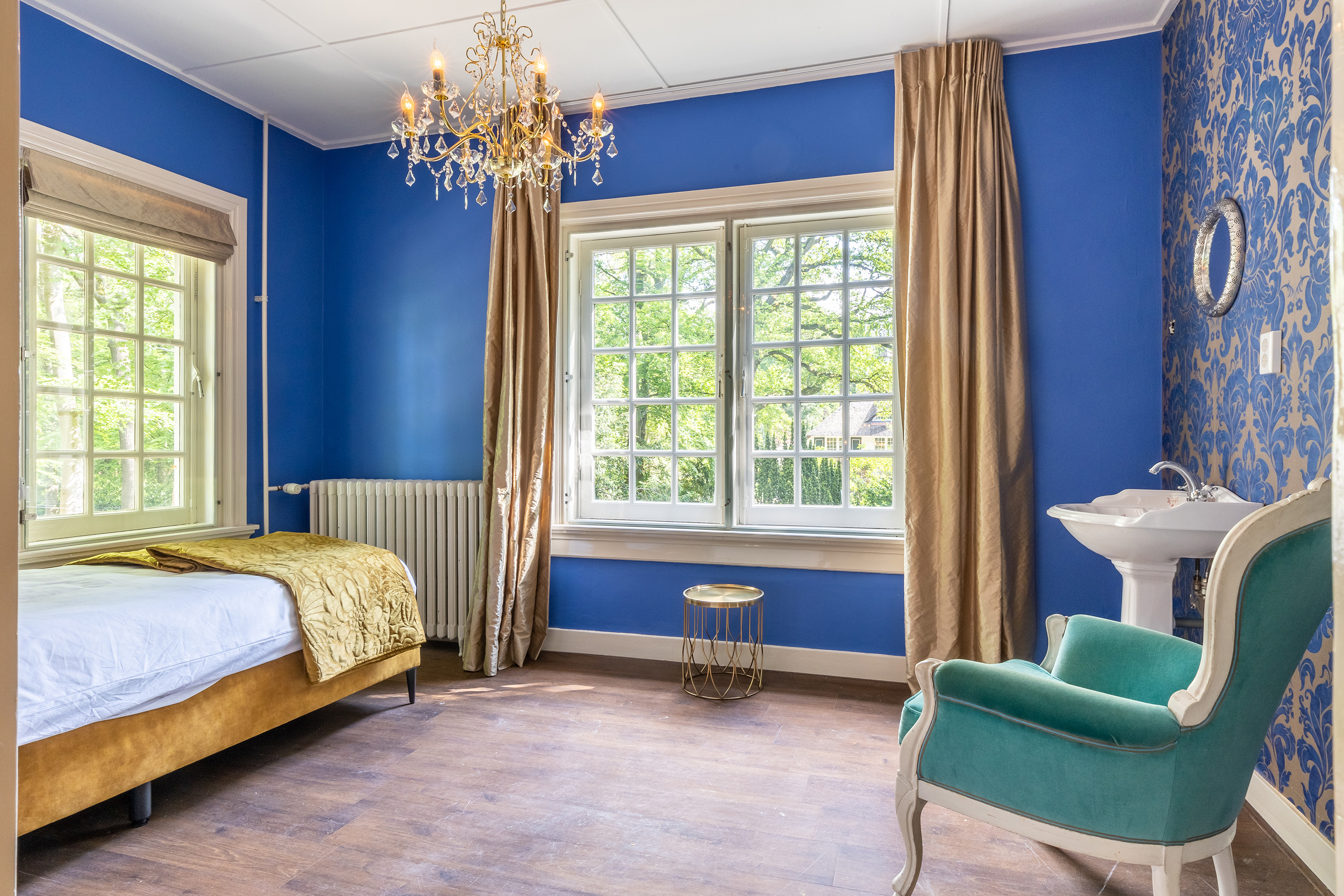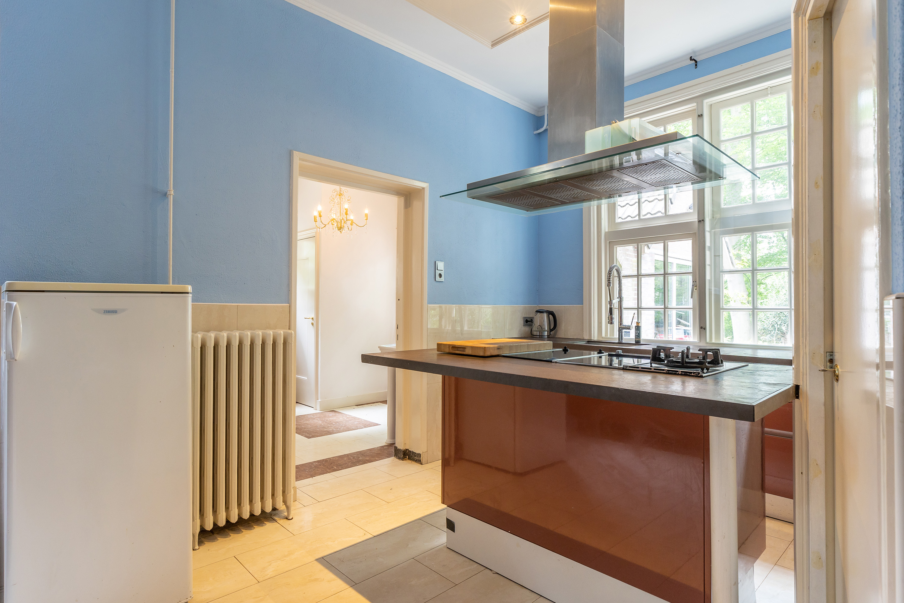 Aan de voorzijde bevindt zich een kantoorkamer met ingebouwde kastenwand en uitzicht op de oprijlaan, perfect voor thuiswerken. De en-suite woonkamer en eetkamer vormen samen het hart van het woongedeelte, met hoge raampartijen, een klassieke marmeren schouw en openslaande deuren naar het terras. De sfeer is warm en uitnodigend, met volop ruimte voor verschillende indelingsmogelijkheden.