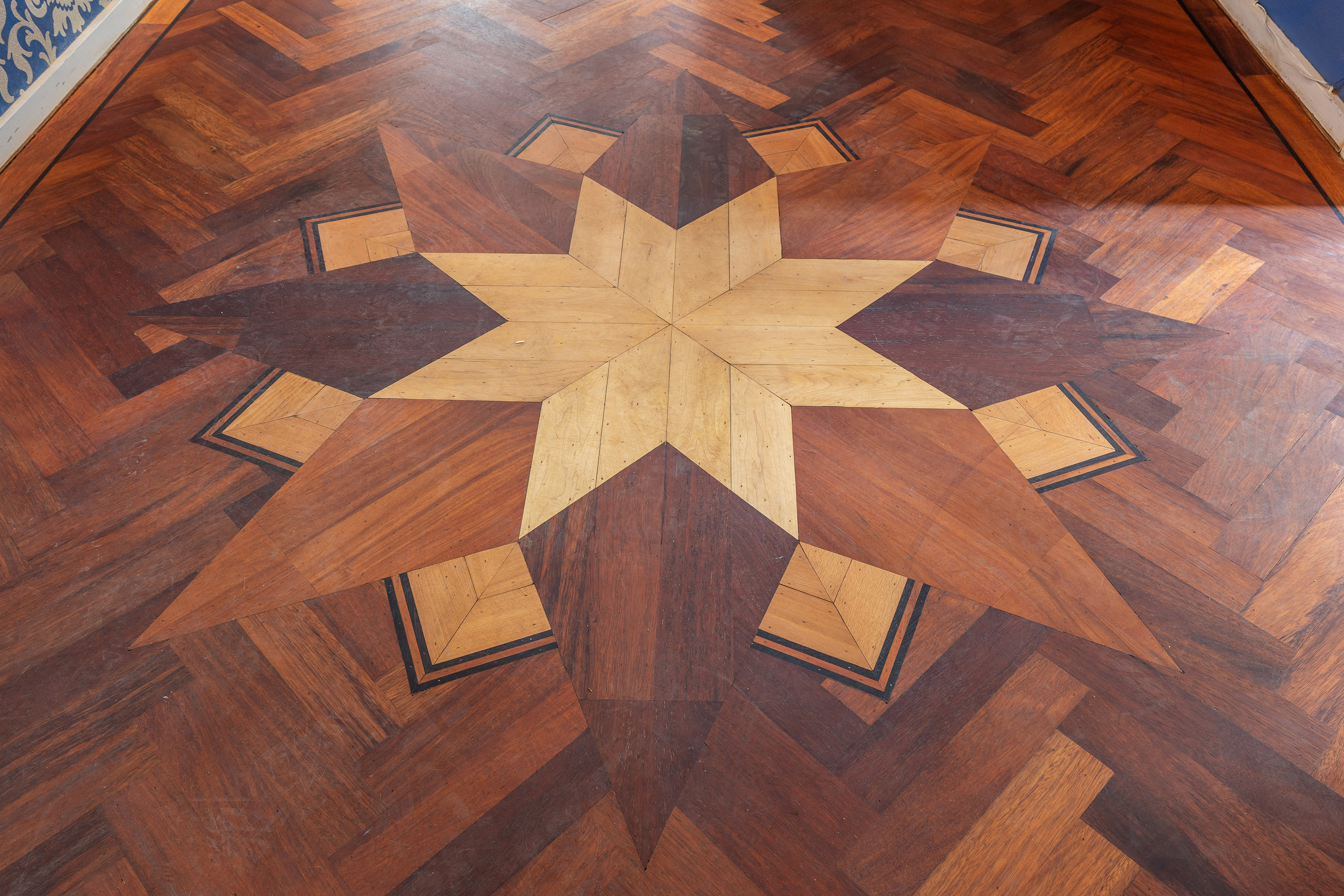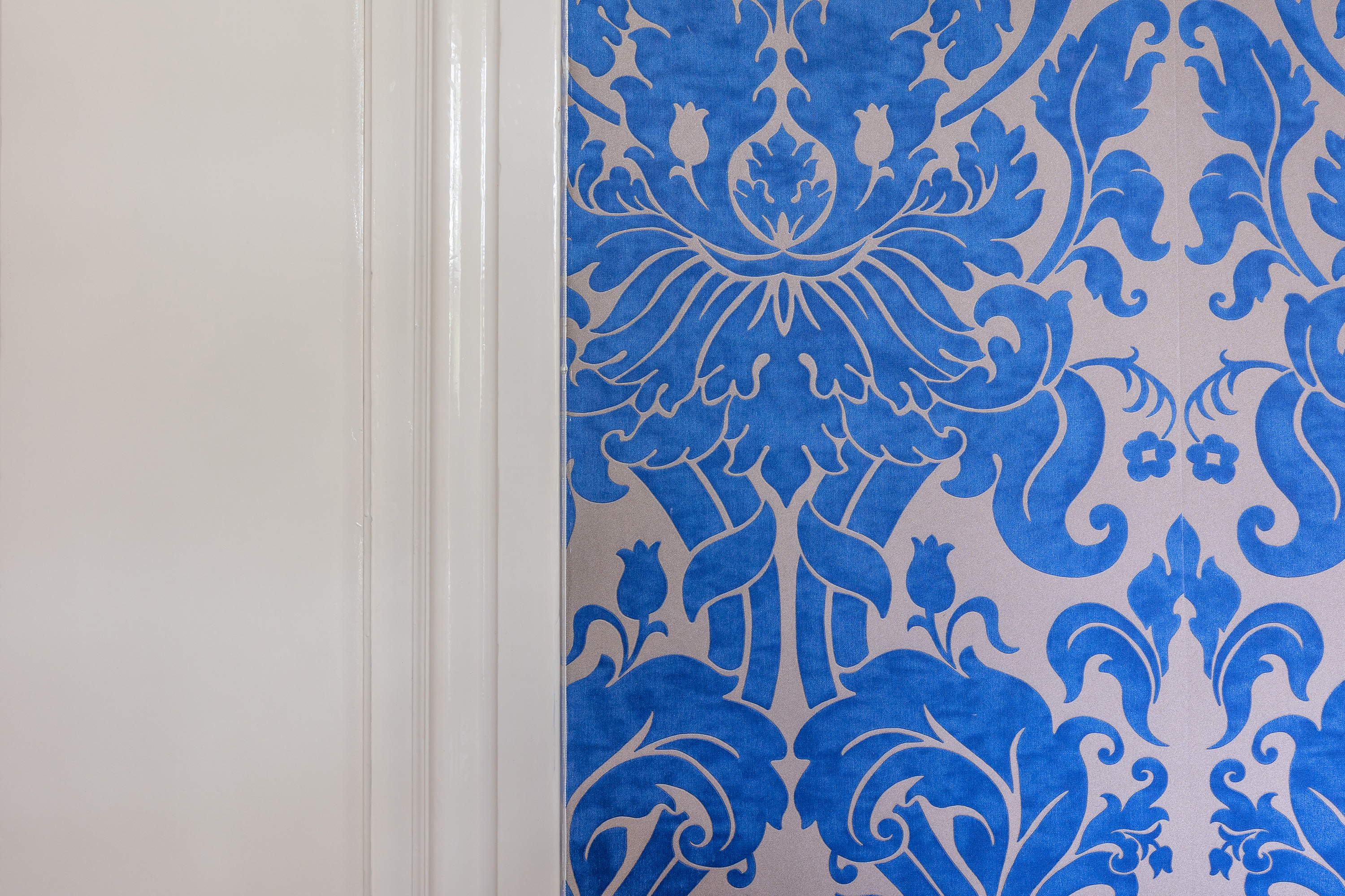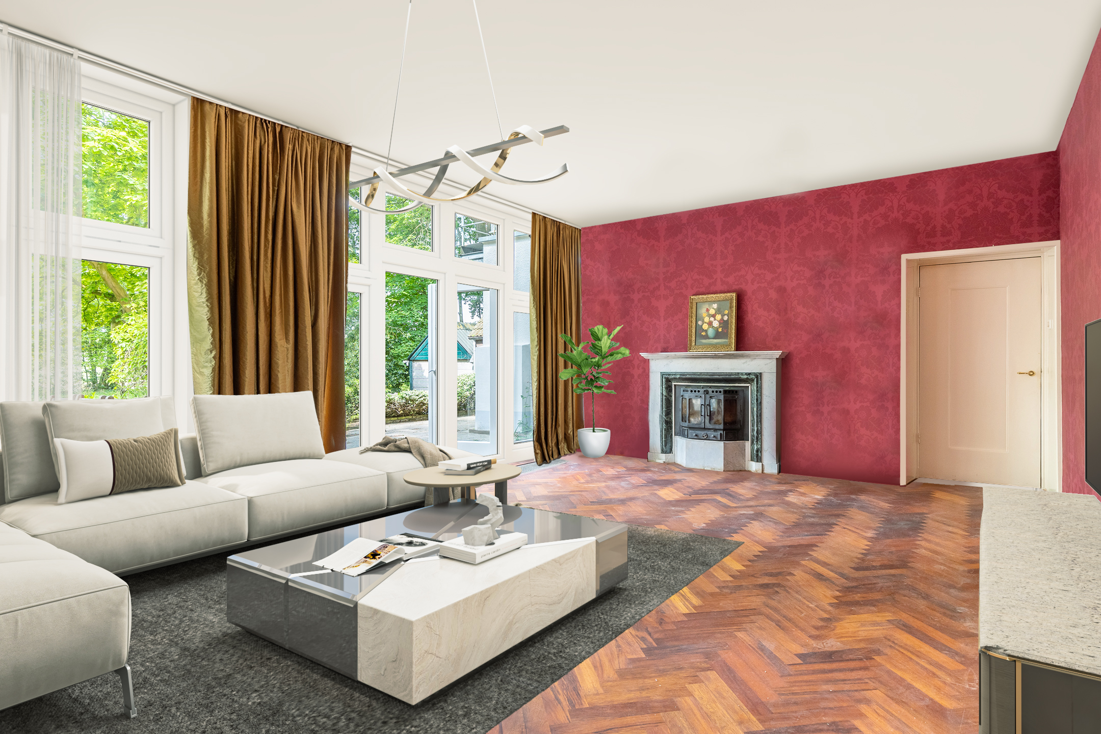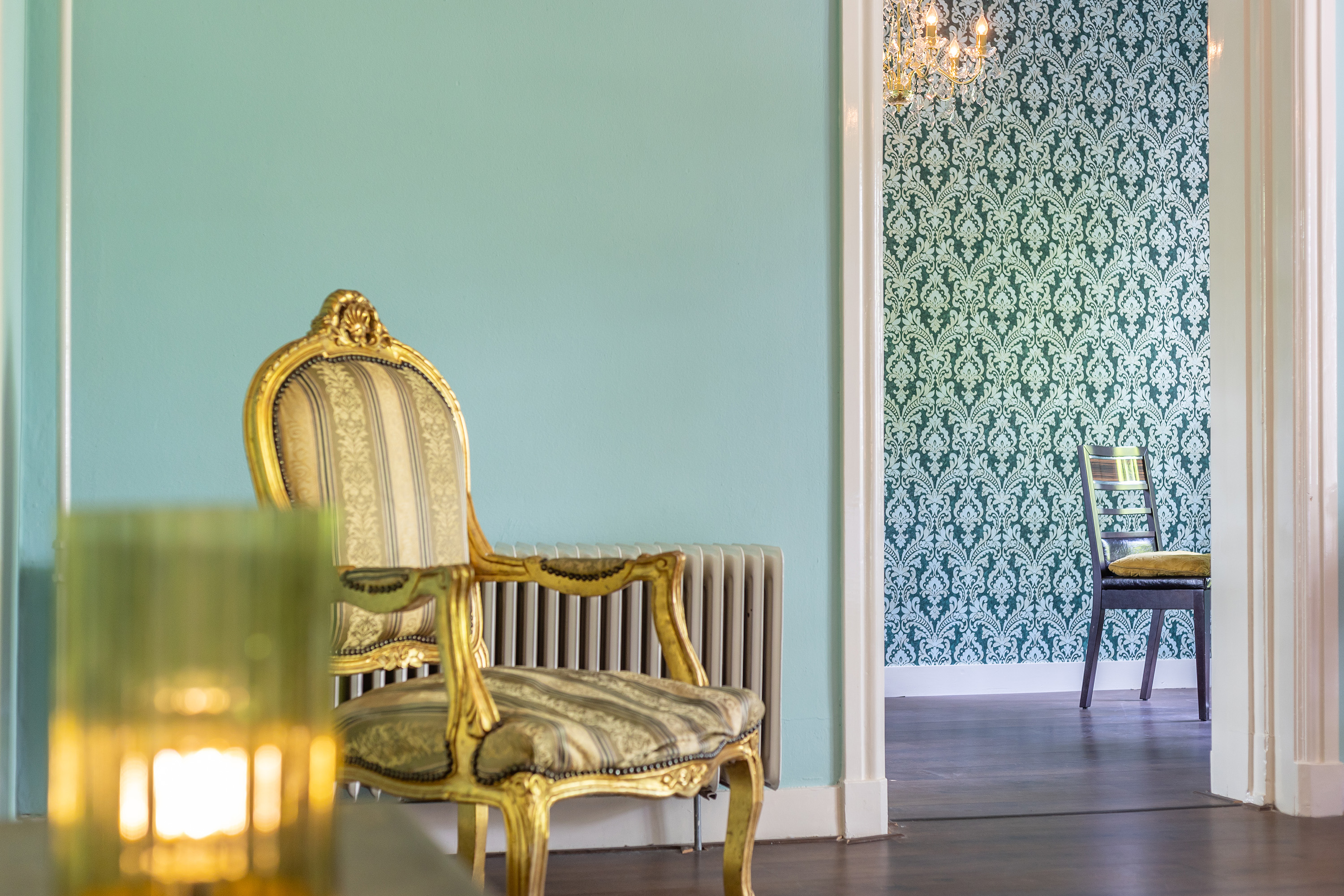 Aan de voorzijde bevindt zich een kantoorkamer met ingebouwde kastenwand en uitzicht op de oprijlaan, perfect voor thuiswerken. De en-suite woonkamer en eetkamer vormen samen het hart van het woongedeelte, met hoge raampartijen, een klassieke marmeren schouw en openslaande deuren naar het terras. De sfeer is warm en uitnodigend, met volop ruimte voor verschillende indelingsmogelijkheden.