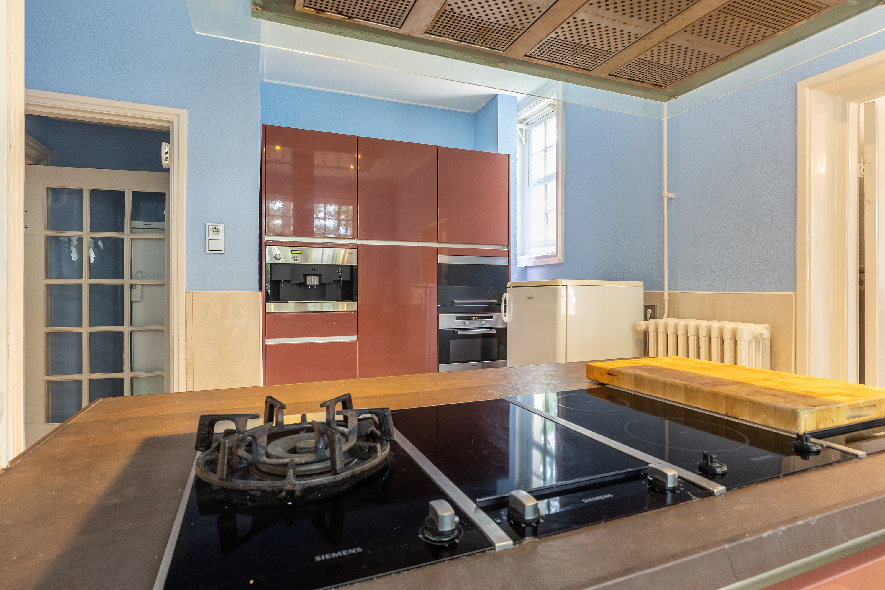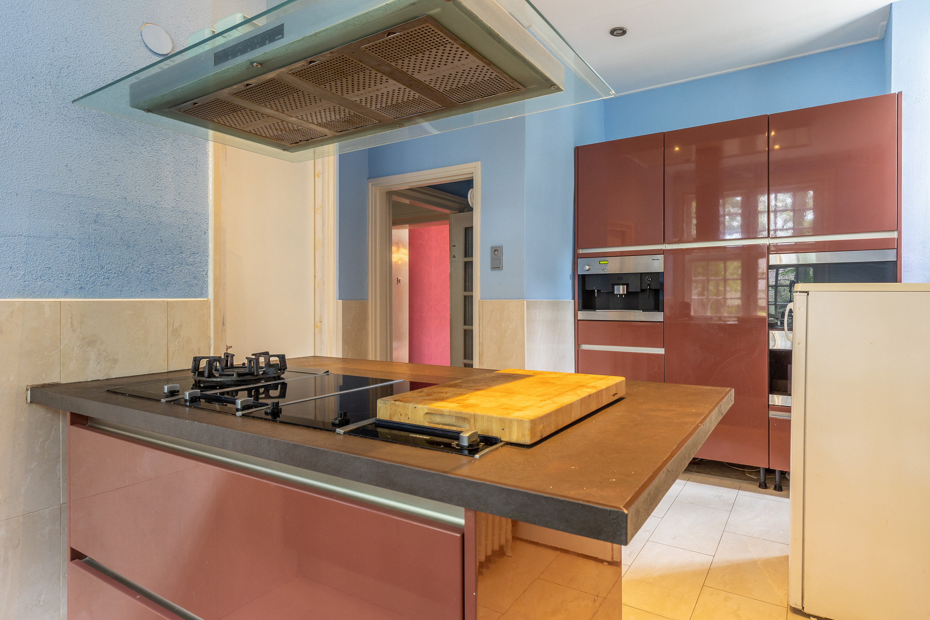 De keuken heeft een keukenopstelling met een kookeiland en inbouwapparatuur. Deze ruimte grenst aan de achterinloop met een wastafel, dubbele toiletten, toegang tot de kelder.
