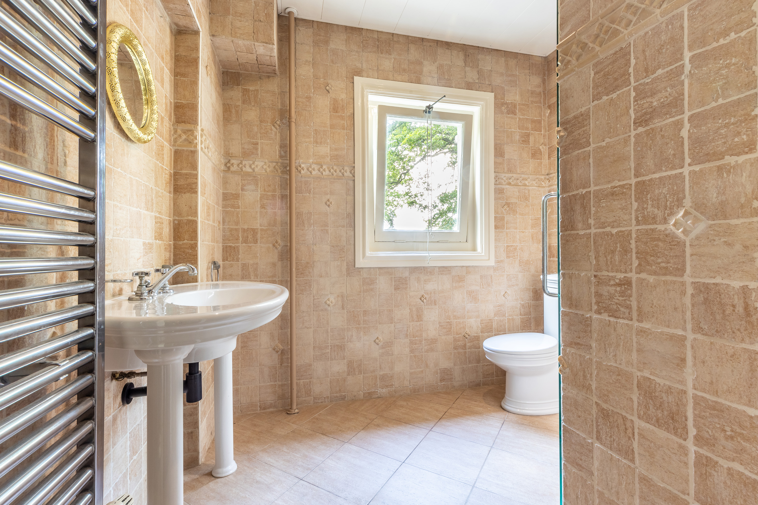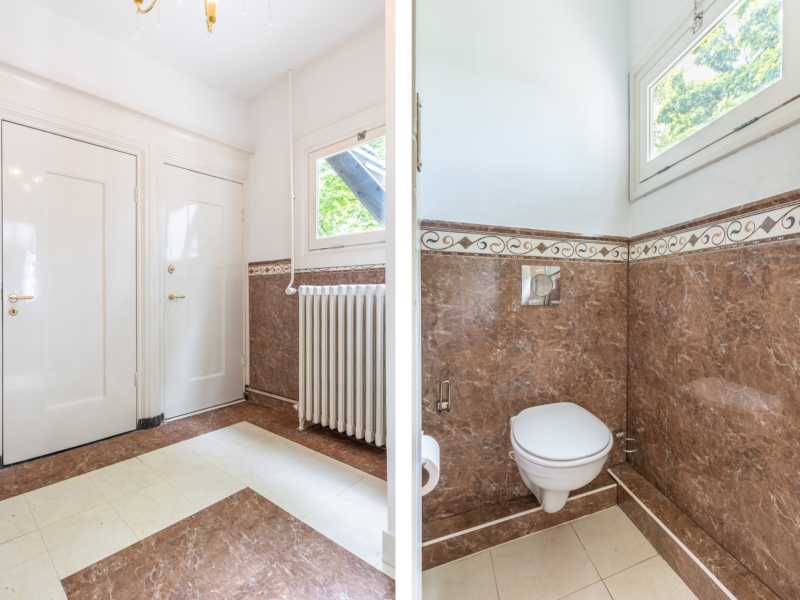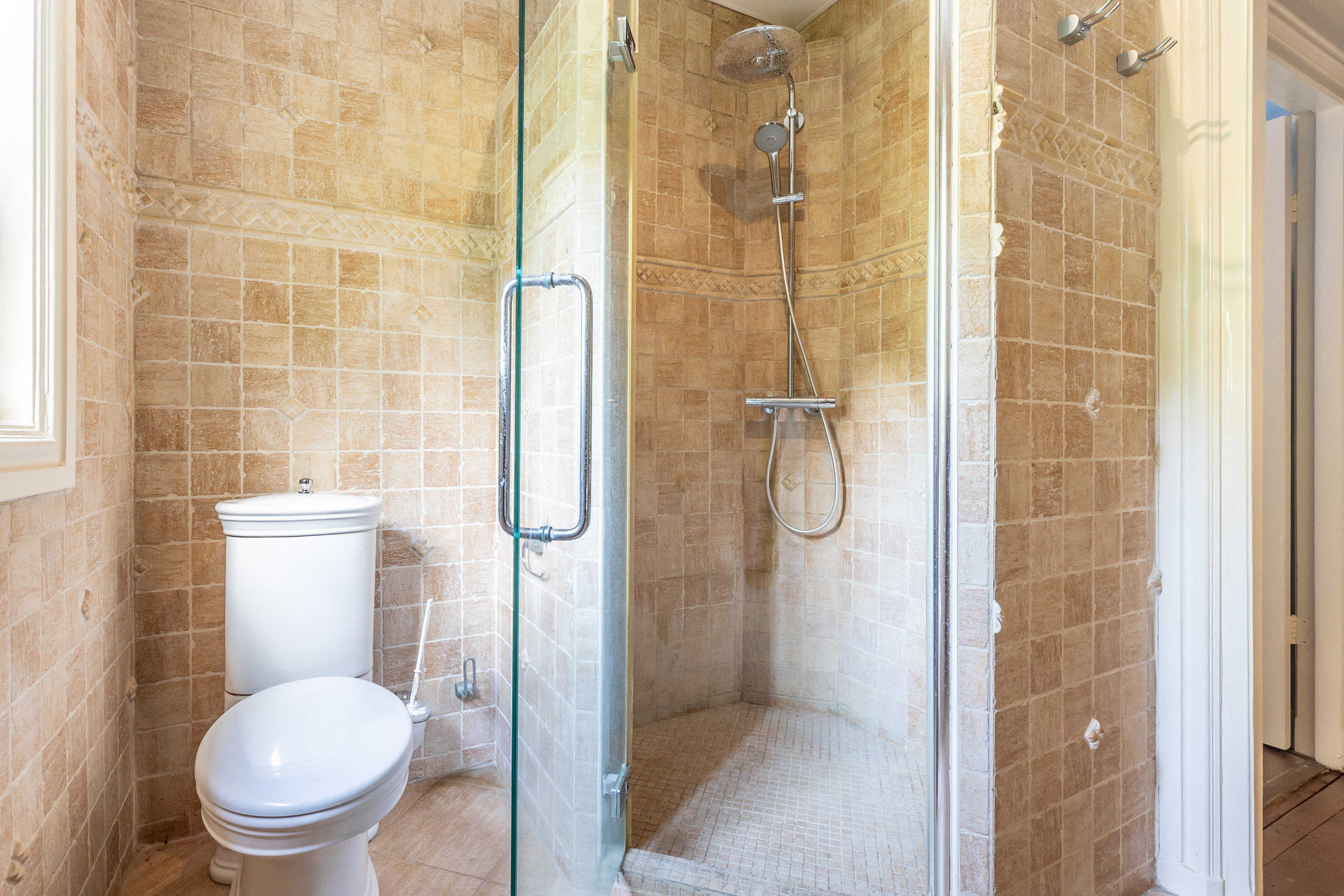 De tweede badkamer is uitgevoerd in getrommeld marmer en vloerverwarming. De ruimte is ingericht met een toilet, wastafel en een inloopdouche.