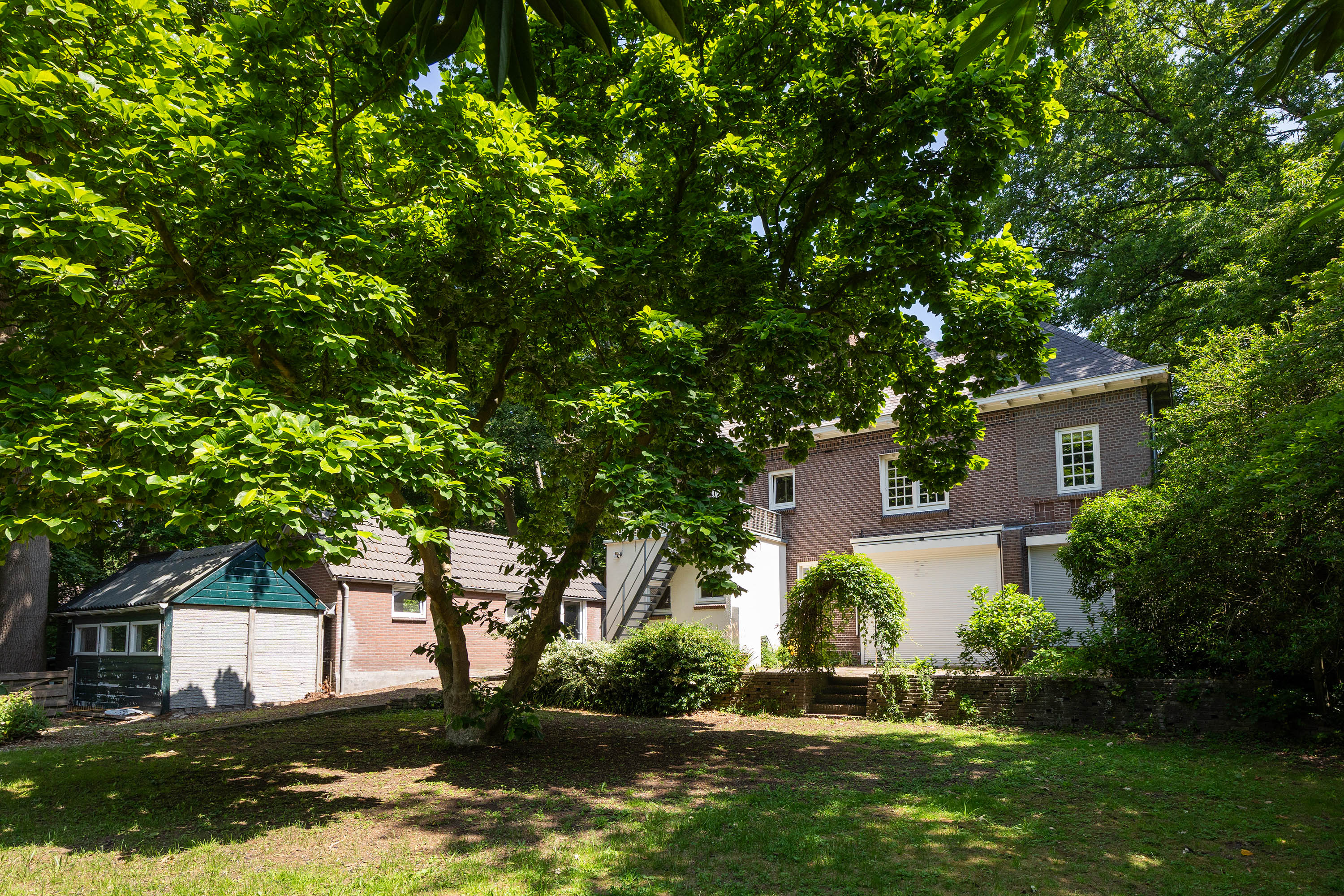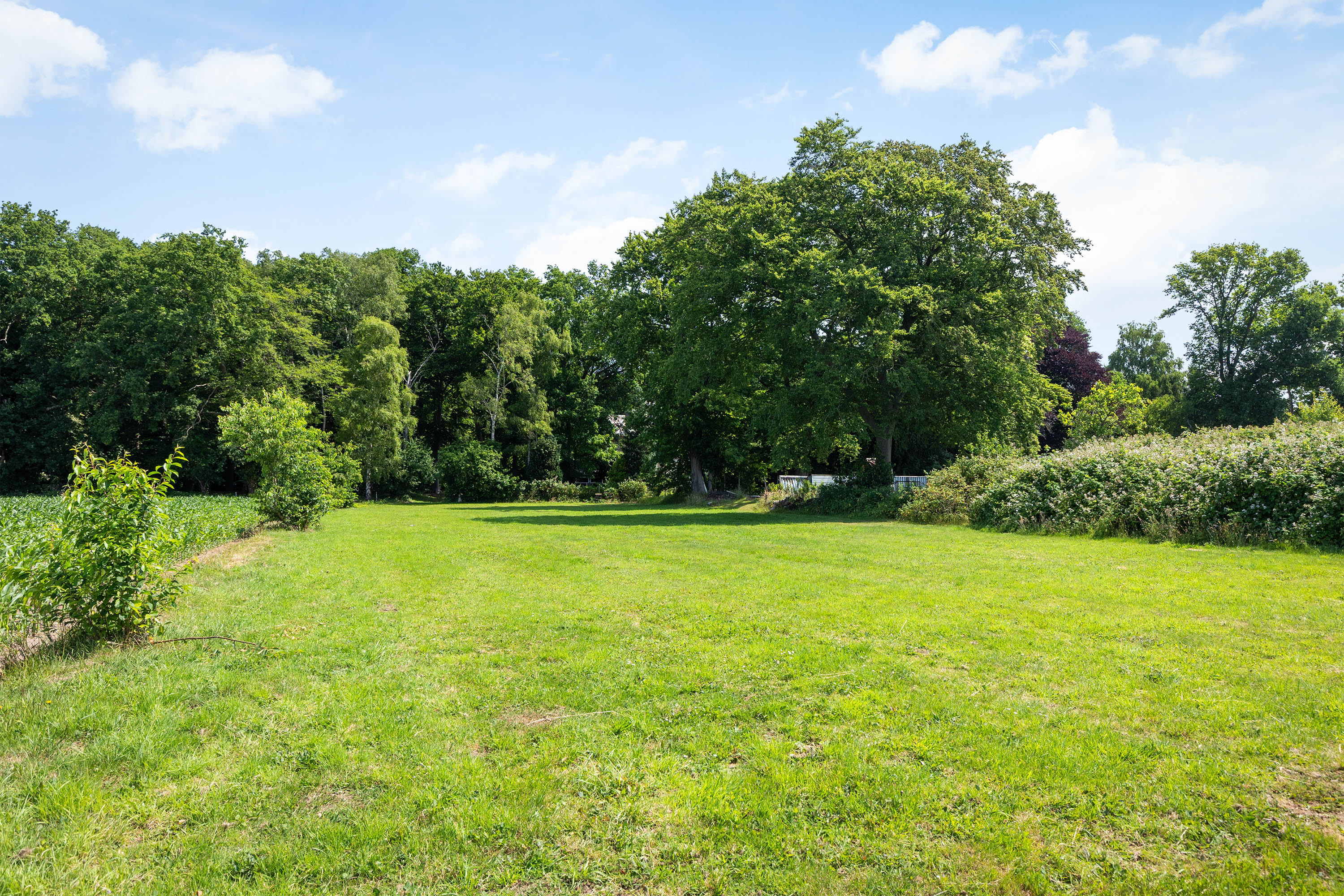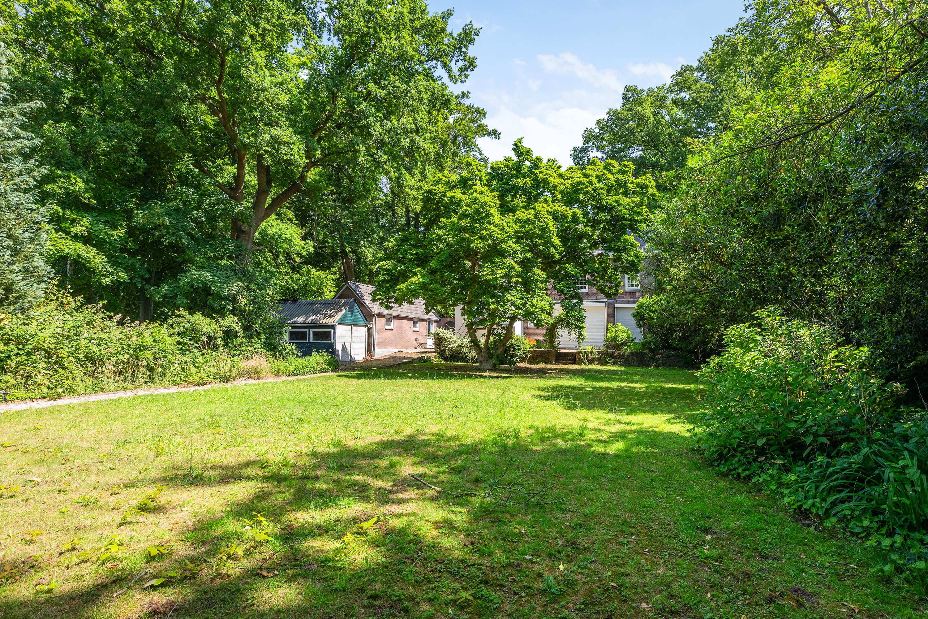 Buiten is er een op het zuiden gerichte tuin grenzend aan het ruime terras, met uitzicht op het achterliggende weiland en het eigen bos. Het geheel biedt volop mogelijkheden voor natuurliefhebbers, dierenhouders of wie gewoon wil genieten van vrijheid en groen. Het weiland is volledig voorbereid op gebruik, met aansluitingen voor elektra, water en riool.