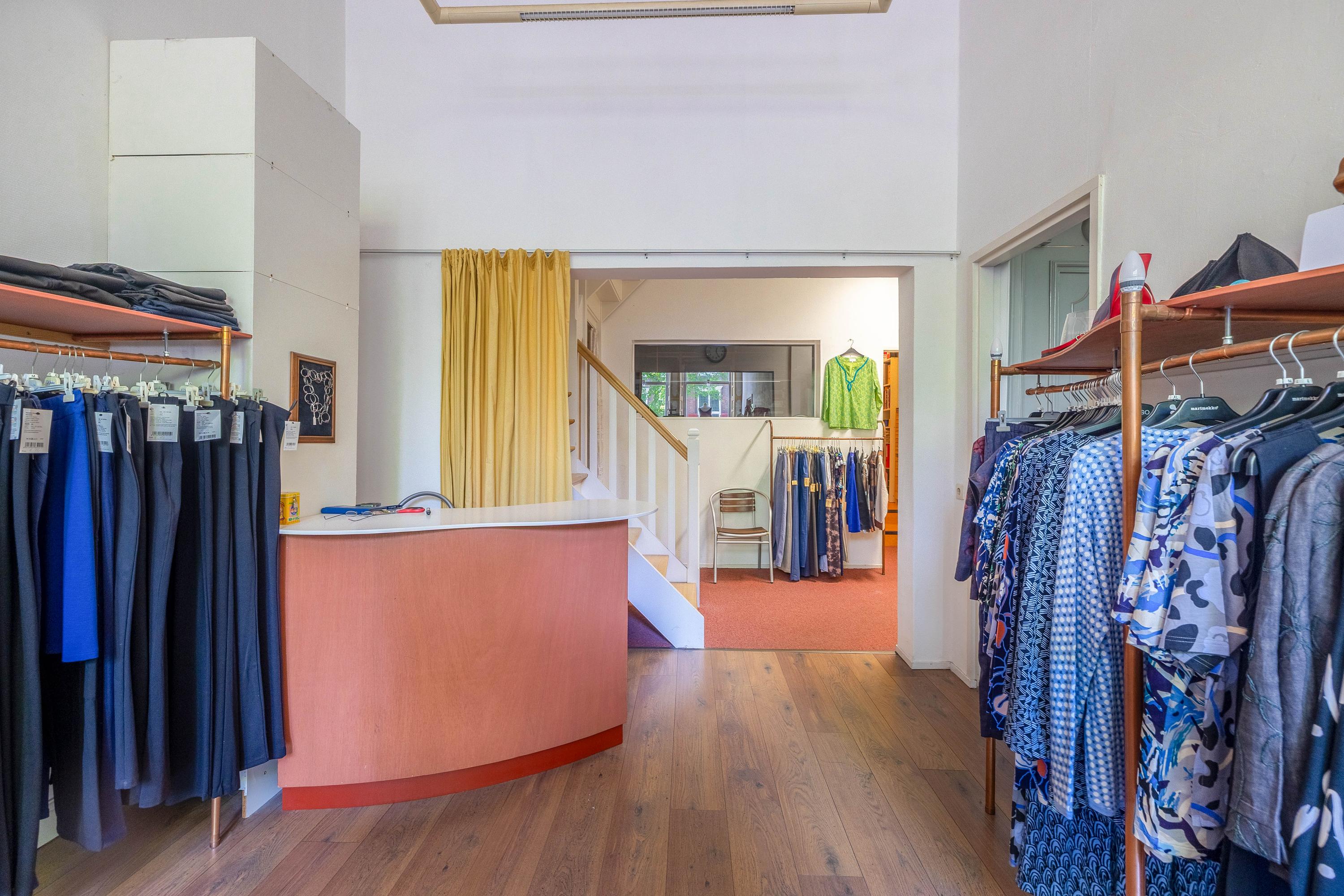 winkelruimte met prachtig houten lijstenplafond, trappartij (geheel vernieuwd), atelier met vlizotrap naar bergvliering, toiletruimte, 2e trappartij (geheel vernieuwd), grote woonkeuken met schitterend uitzicht op de tuin, keukenopstelling met inductiekookplaat, afzuigkap, combi-oven, heteluchtoven, vaatwasser, keukenboiler, marmoleum met vloerverwarming en deur naar het terras op het zuid-westen.