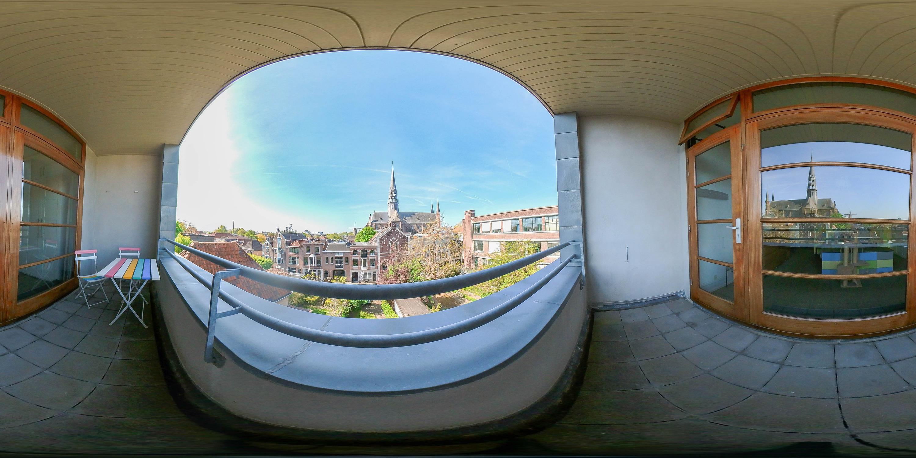 slaapkamer aan achterzijde met nieuwe achterpui met deur met terras en schitterend uitzicht over de historische panden van de Goudse binnenstad, slaapkamer met vaste kastenwand, airco, cv-ruimte en slaapkamer aan voorzijde met zicht op het museum en de St Janskerk