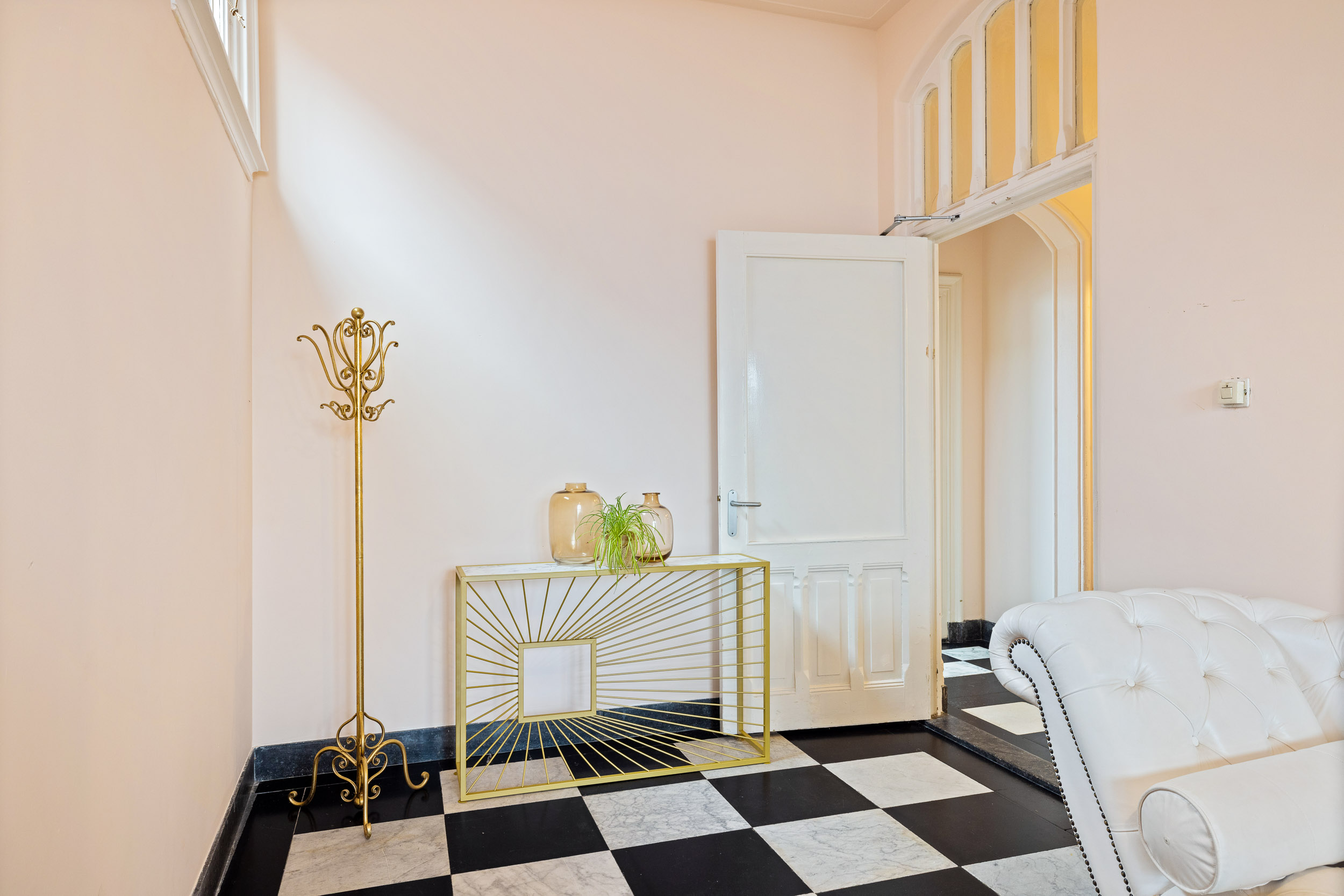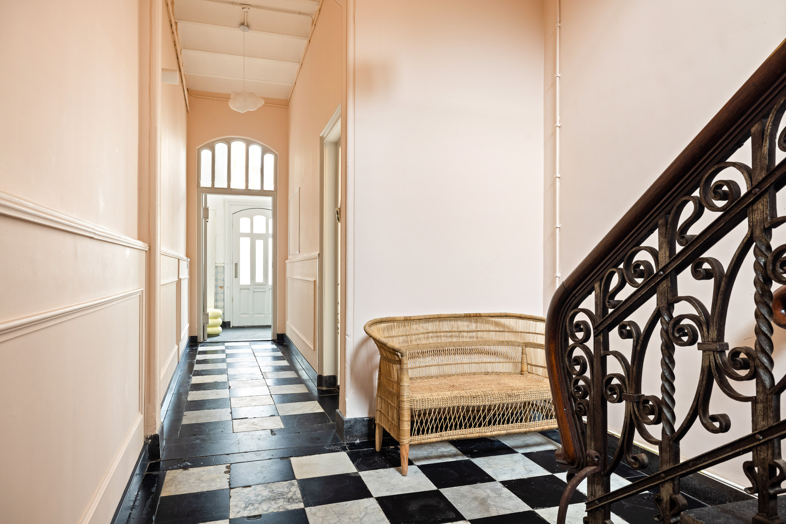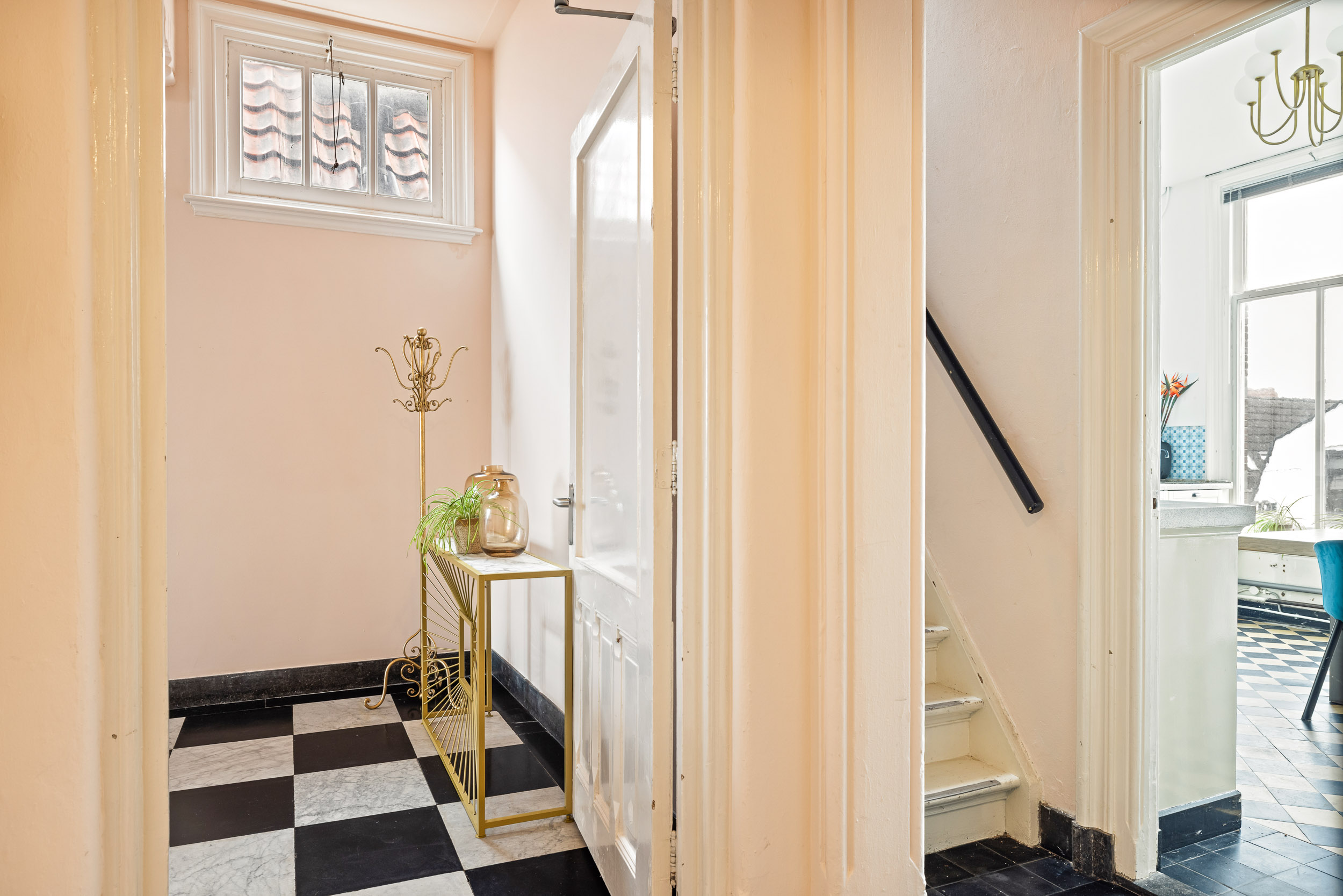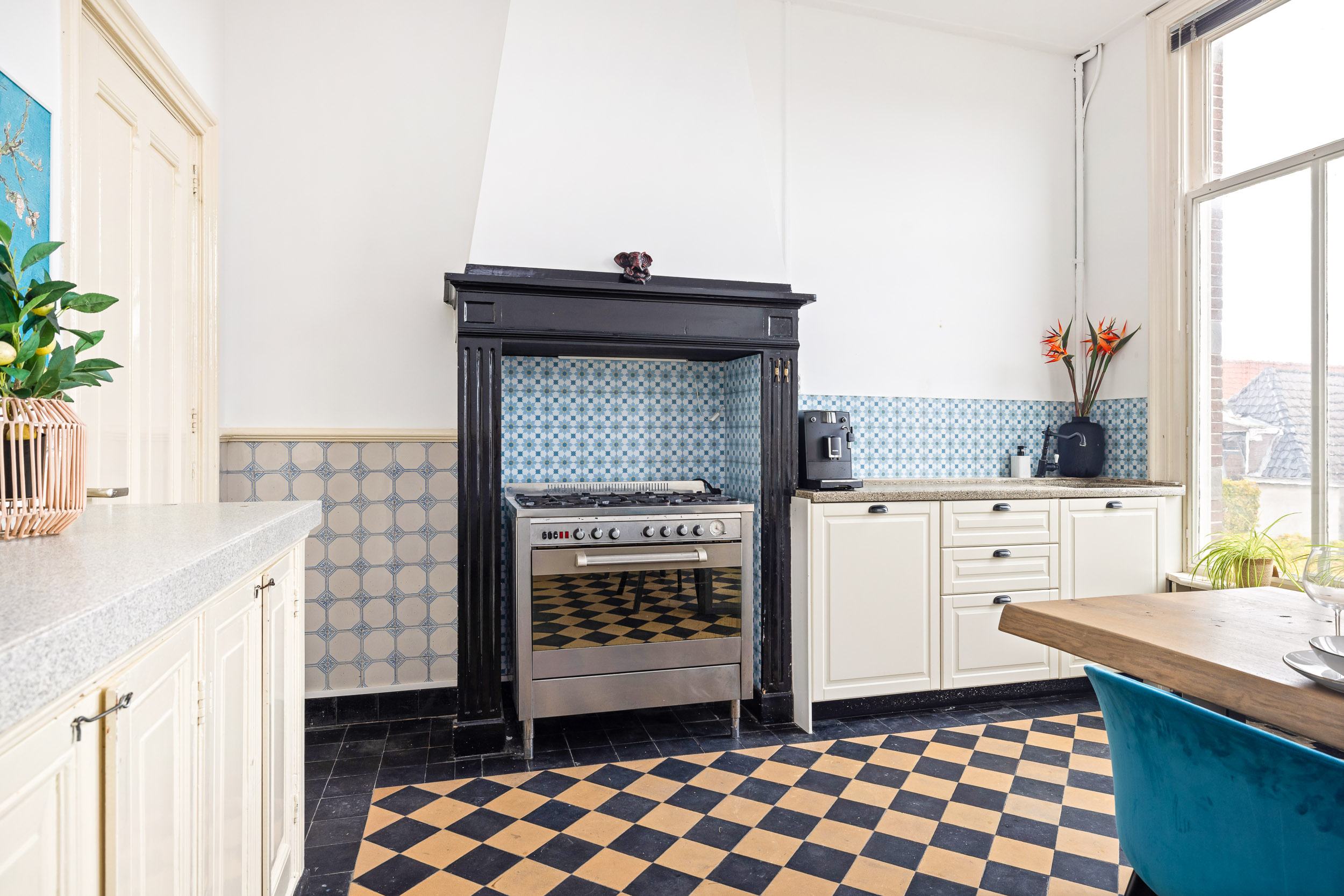 Via de rechter voordeur betreedt men het woongedeelte, waar het originele troggewelf en de karakteristieke vloertegels direct de authentieke sfeer oproepen. De sfeervolle tuinkamer aan de achterzijde heeft rijk gedecoreerde openslaande deuren naar het terras en de diepe, zonnige patio-tuin met dubbel achterom. De ruime kelder vormt een ideale plek voor een fraaie wijnvoorraad.