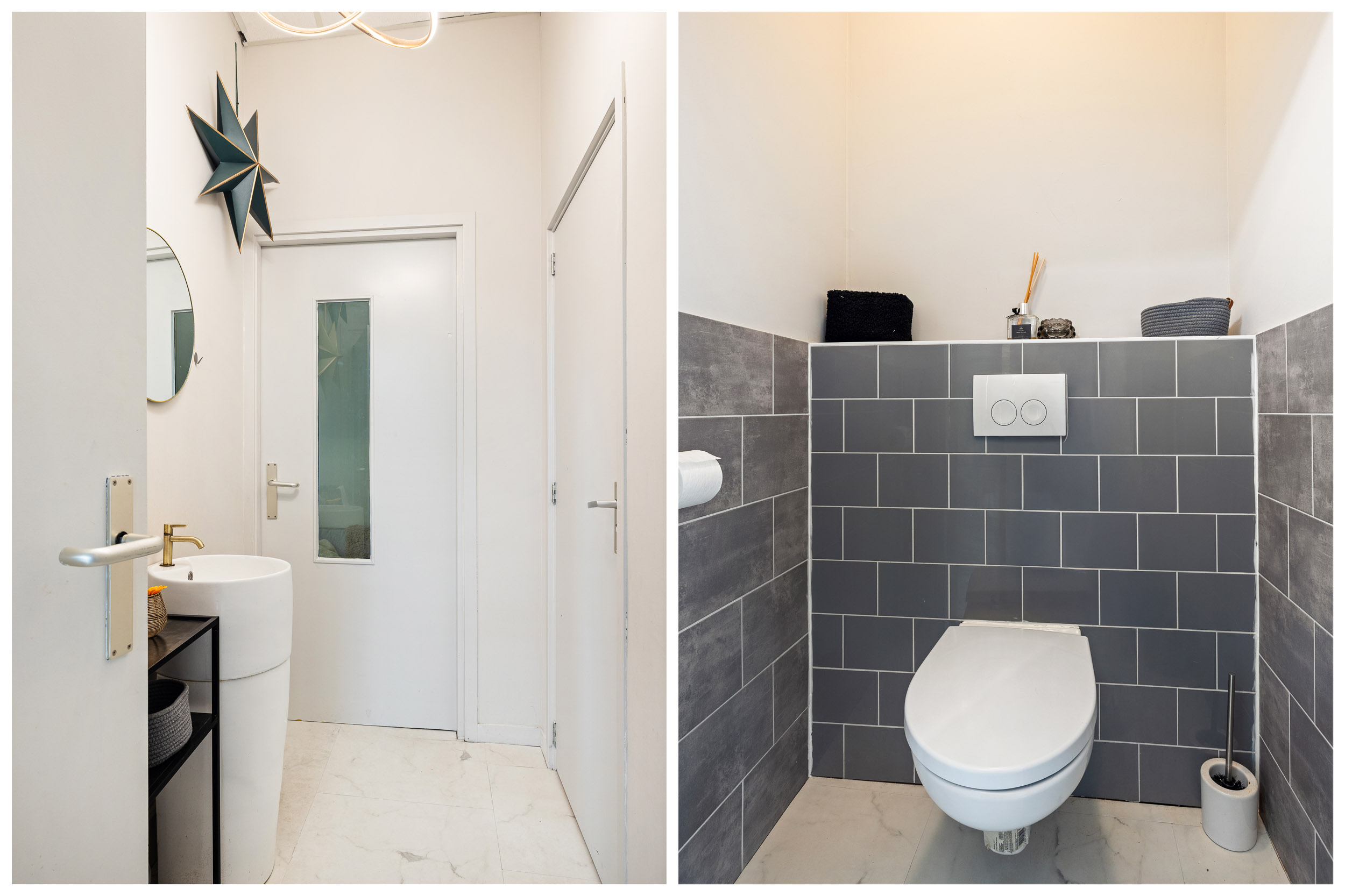 Aan de linkerzijde van de gang liggen de keuken, twee slaapkamers en een toilet annex badkamer.