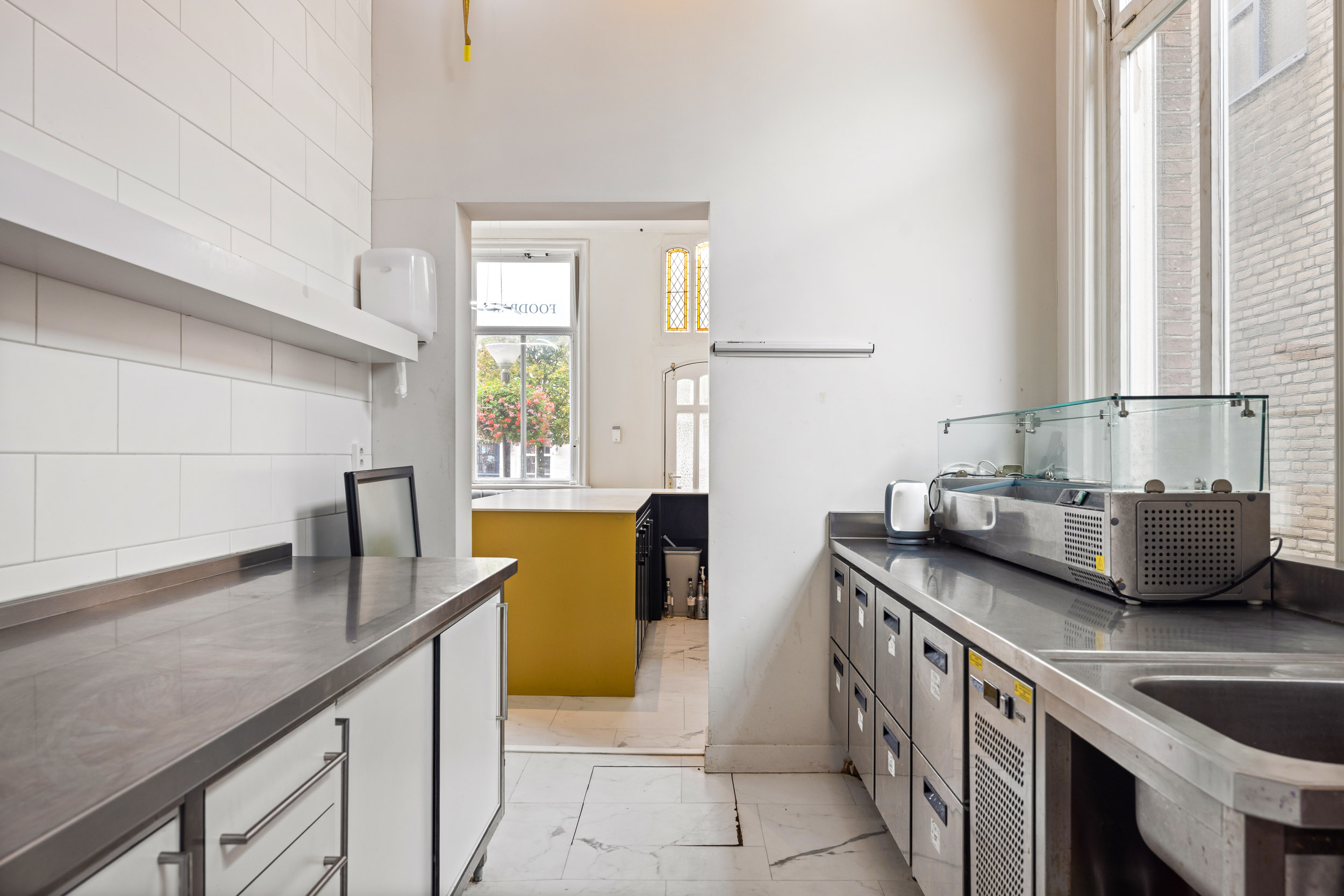 Via de linker voordeur – of intern via de centrale hal – bereikt men een multifunctionele ruimte van 77 m², voorzien van een professionele keuken met bijkeuken en berging, tuingerichte kamer en moderne dubbele toiletgroep annex badkamer. Dankzij de bestaande indeling, de dubbele huisnummers en de gemengde bestemming biedt dit pand talloze mogelijkheden voor wonen, werken en ondernemen.