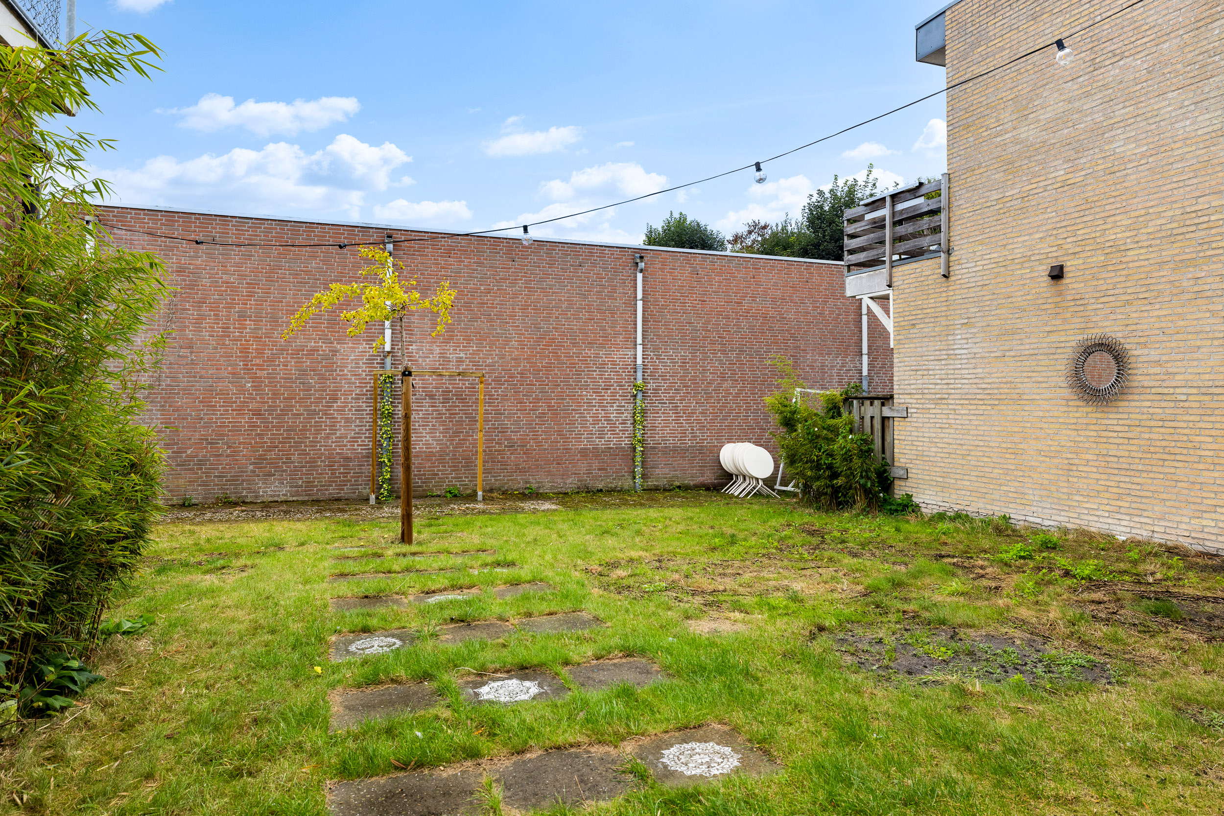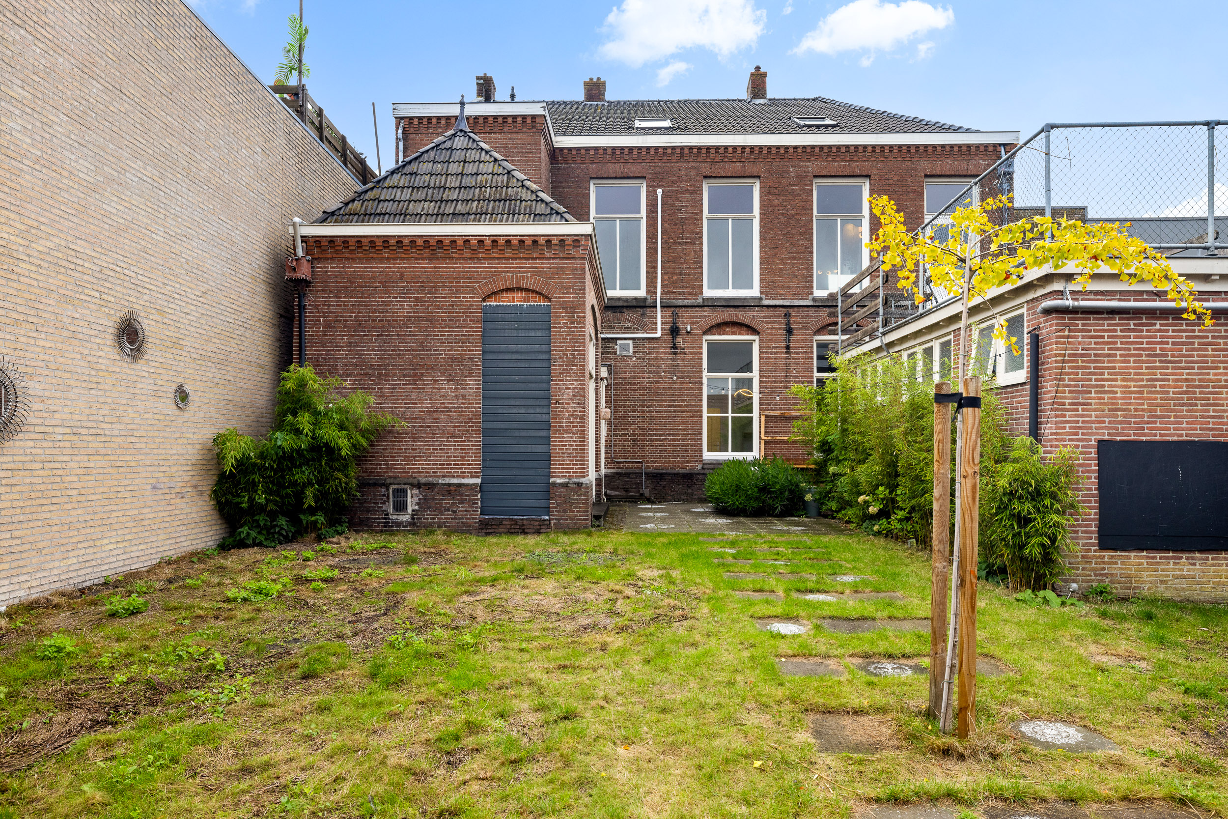 Achter de woning bevindt zich een zonnige, diepe tuin op het zuiden – een groene oase in het centrum van Joure – waar rust en privacy overheersen. De tuin heeft rechts een achterom naar de parkeerplaats en links een achterom naar de winkelstraat.